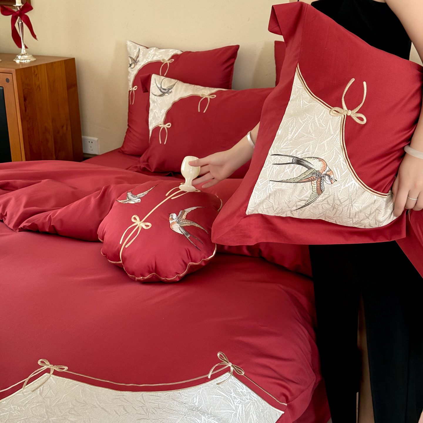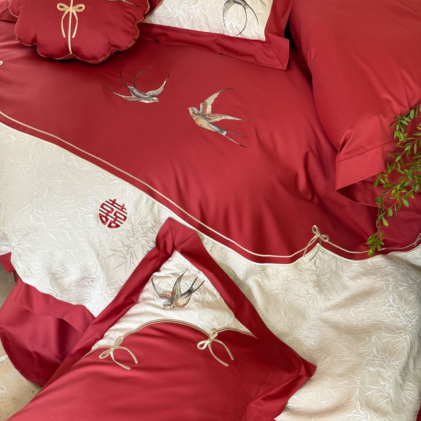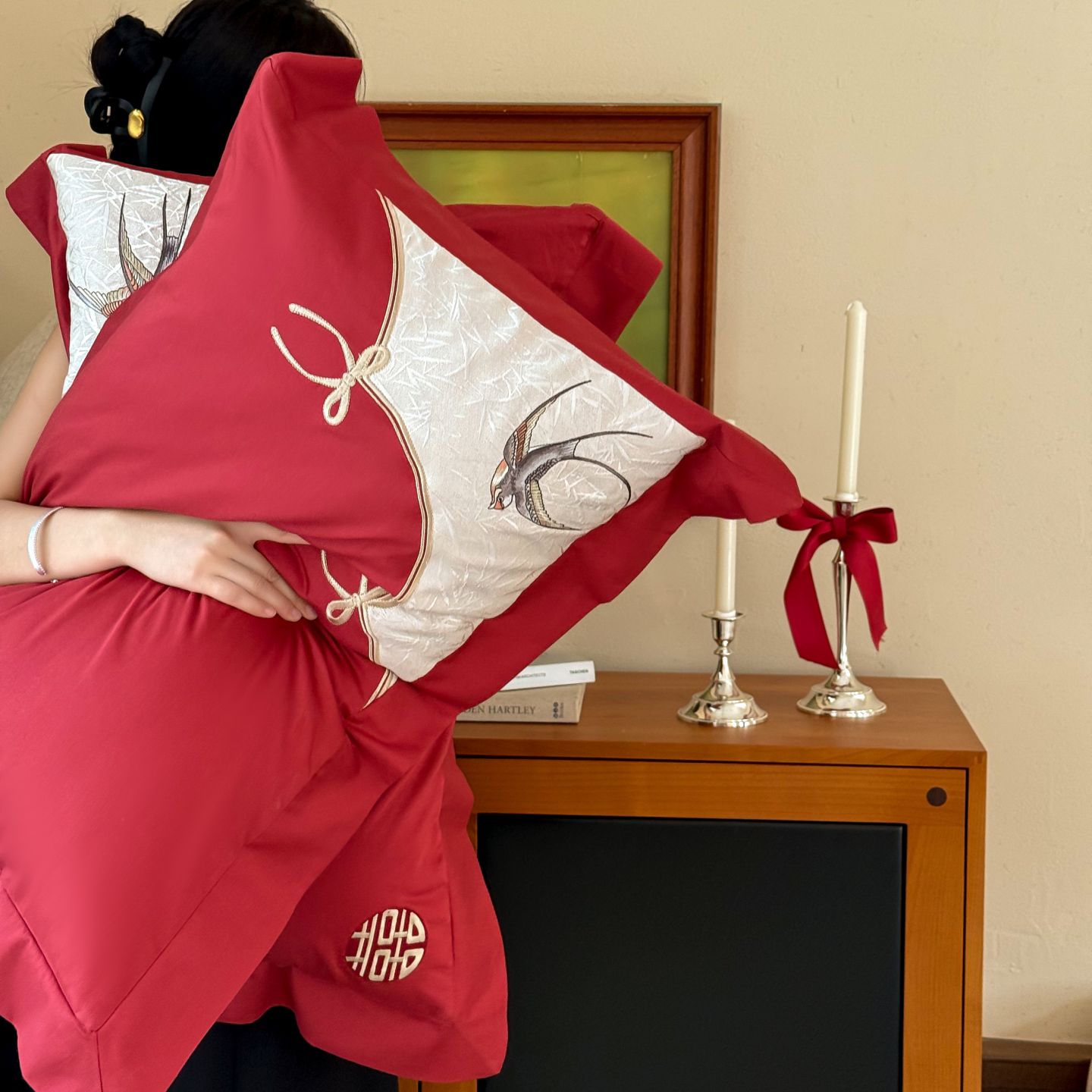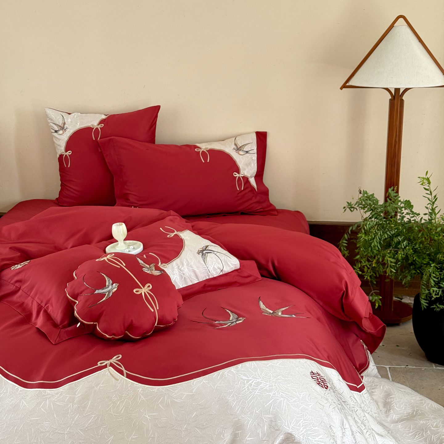 (总)西西家居 25新款100支长绒棉高精密提花拼接大红婚庆四件套-