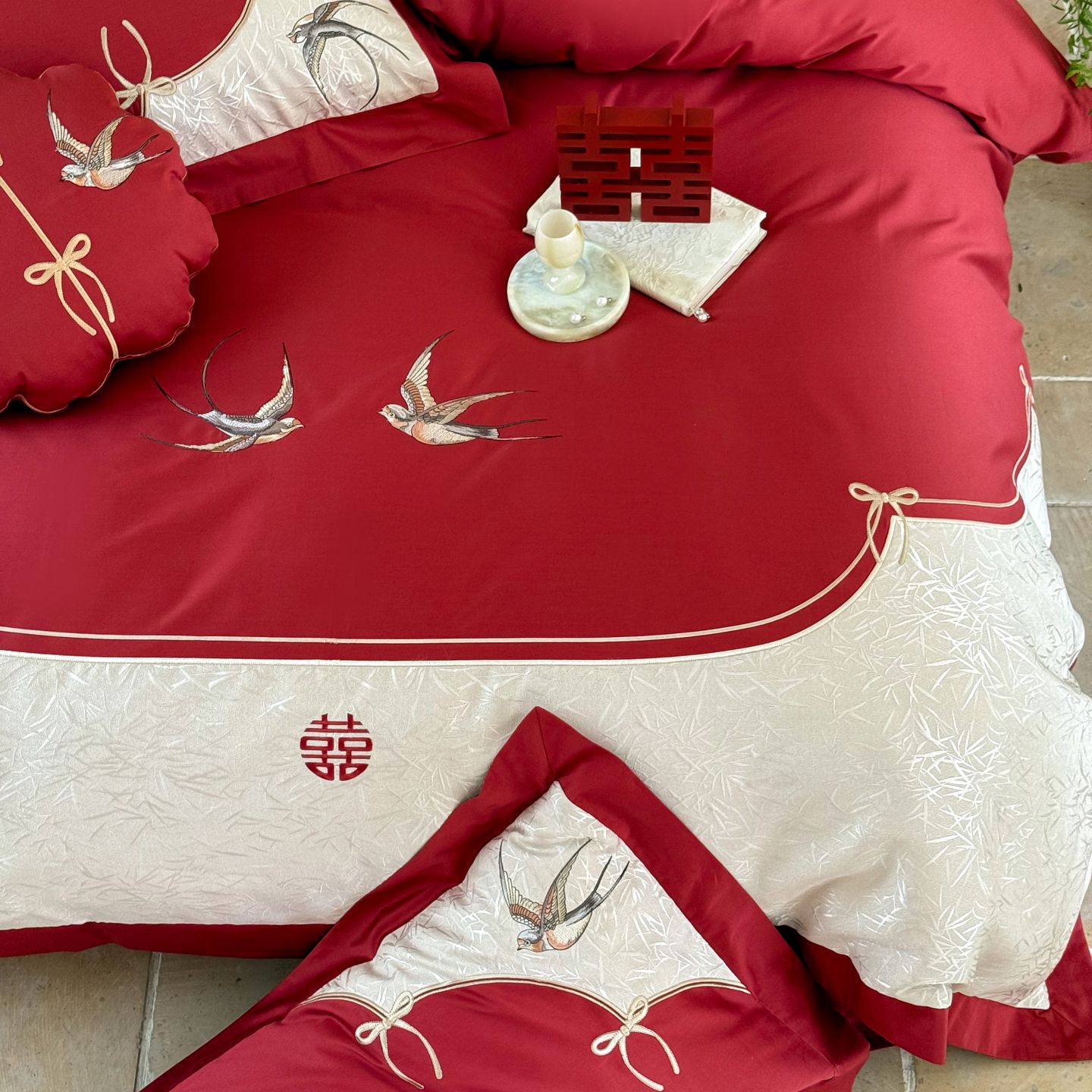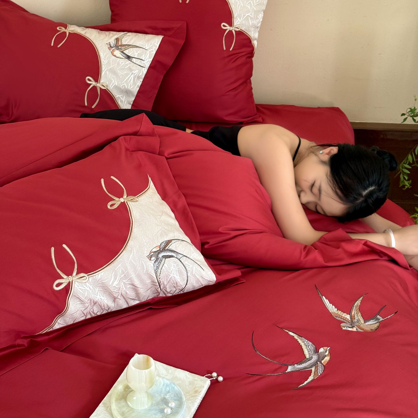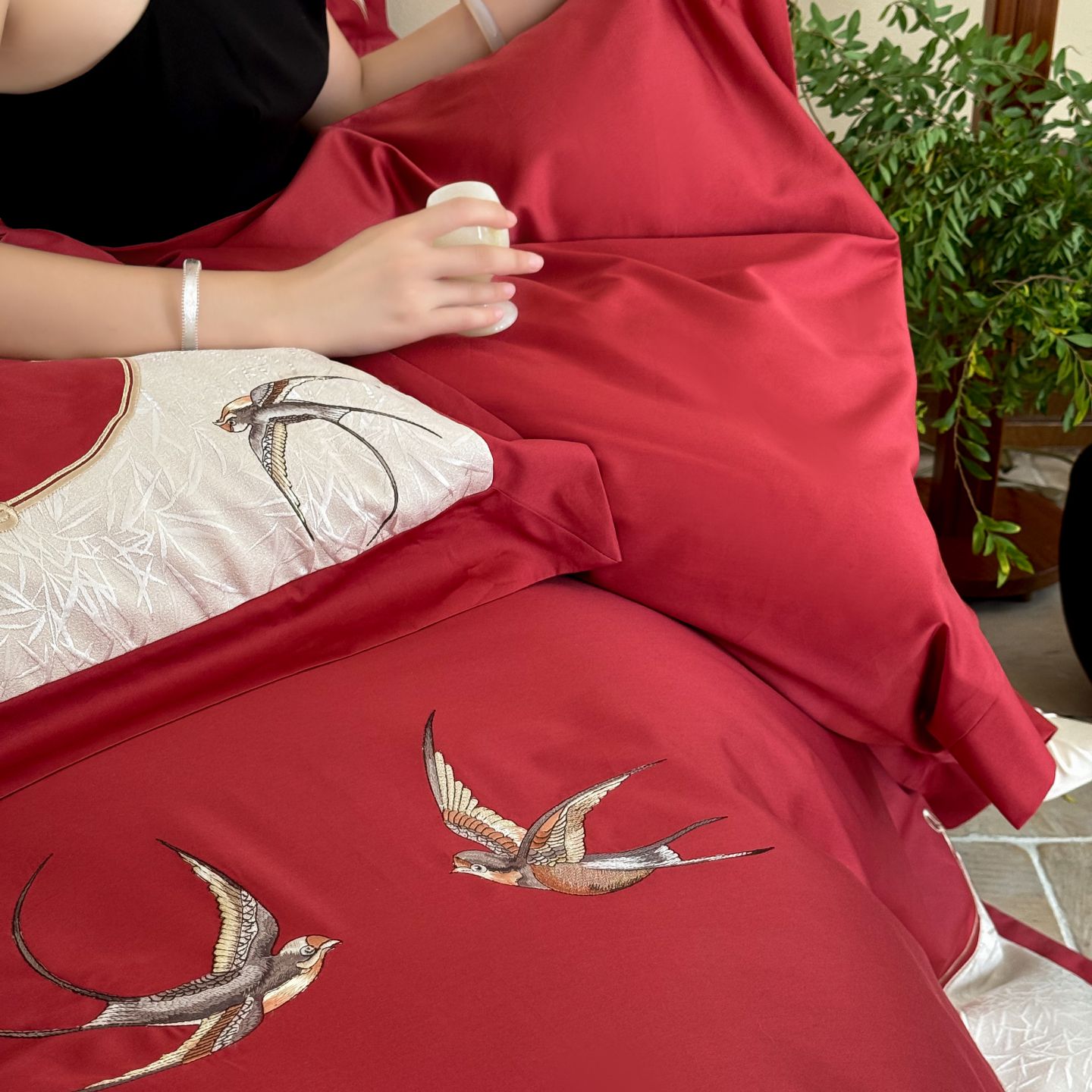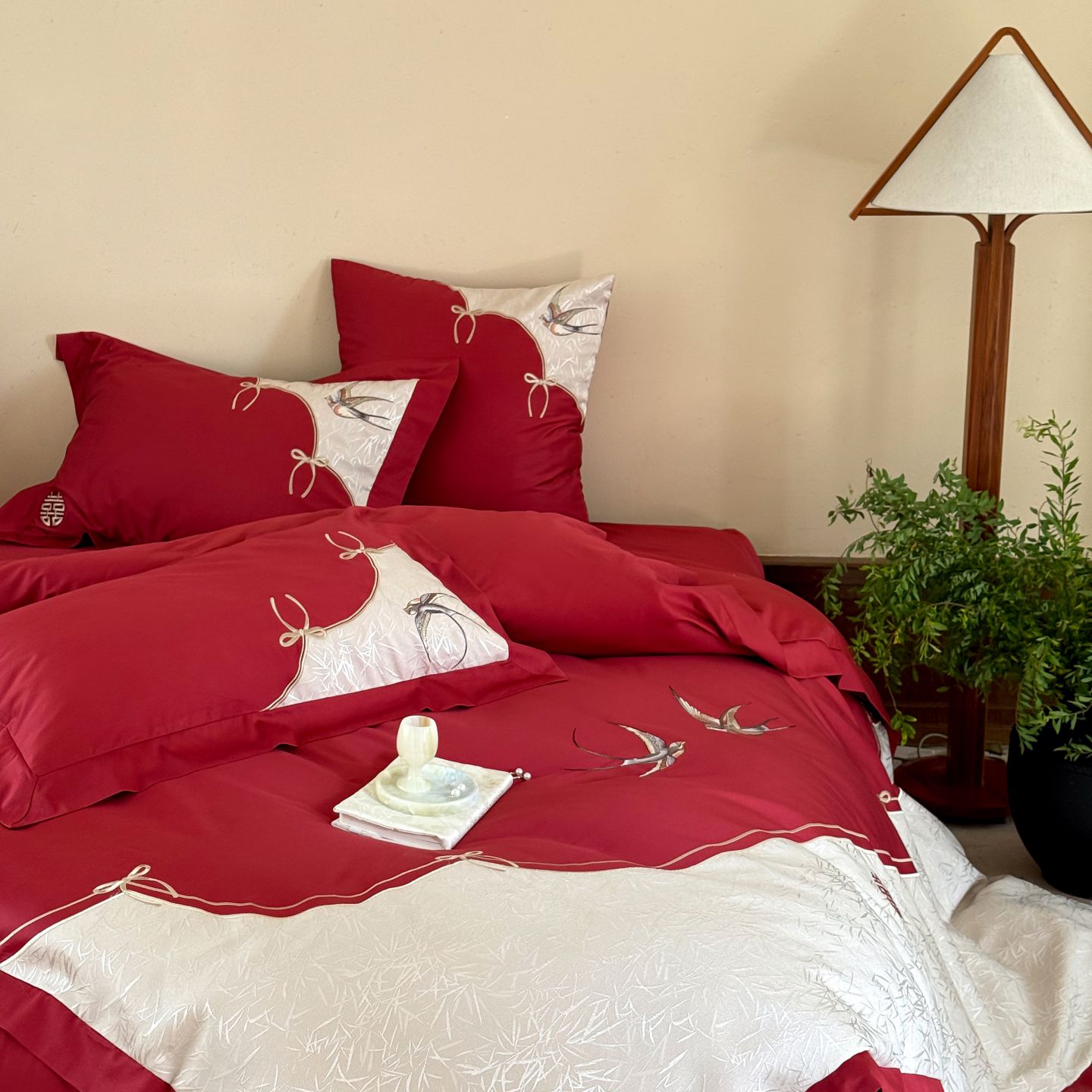 (总)西西家居 25新款100支长绒棉高精密提花拼接大红婚庆四件套-