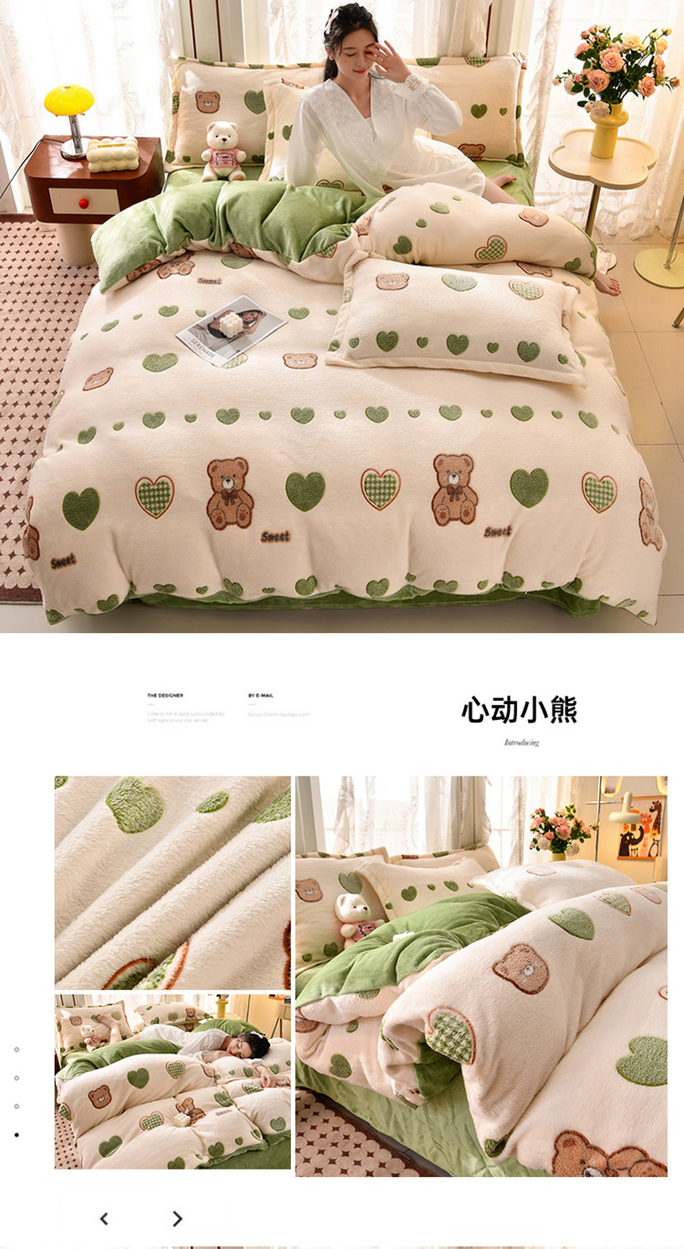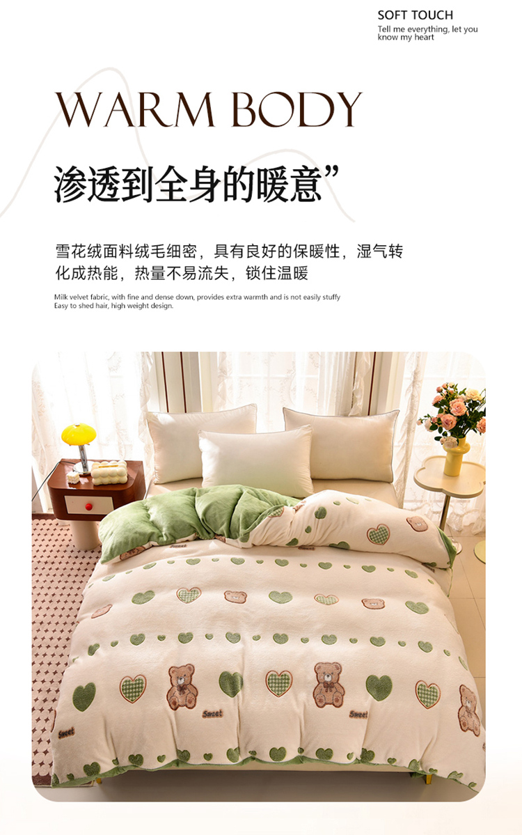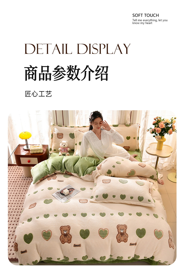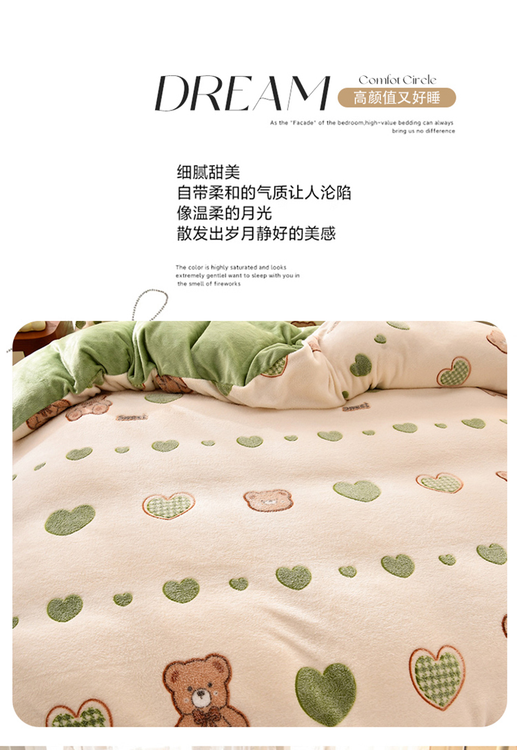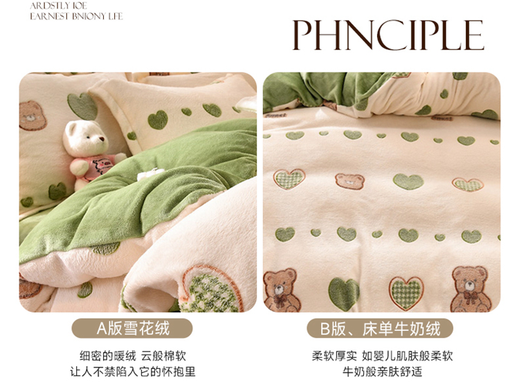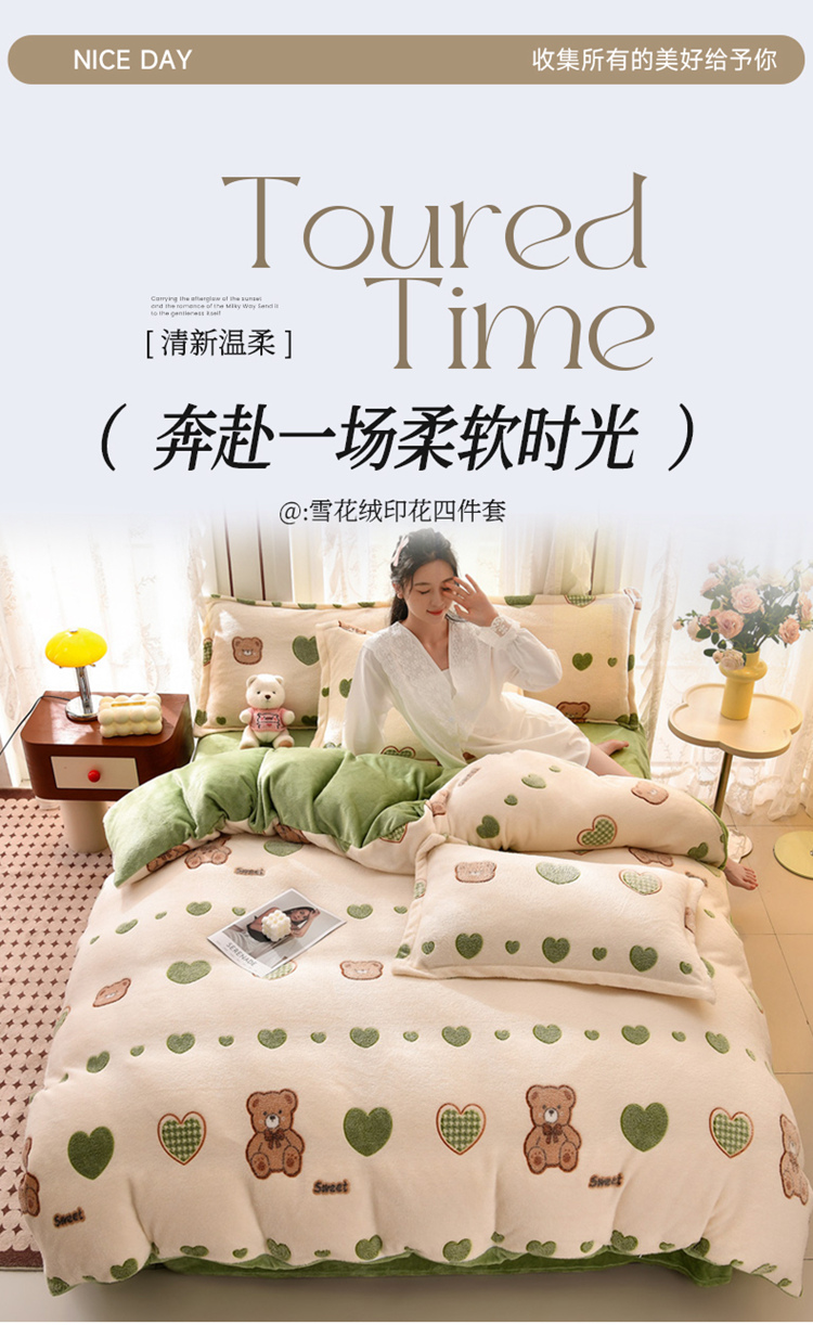 当前位置: 91家纺网 > 商品网购 > 床品套件 > 四件套 > 其它四件套 > 牵梦萦 2025新款雪花绒小清新印花四件套 心动小熊