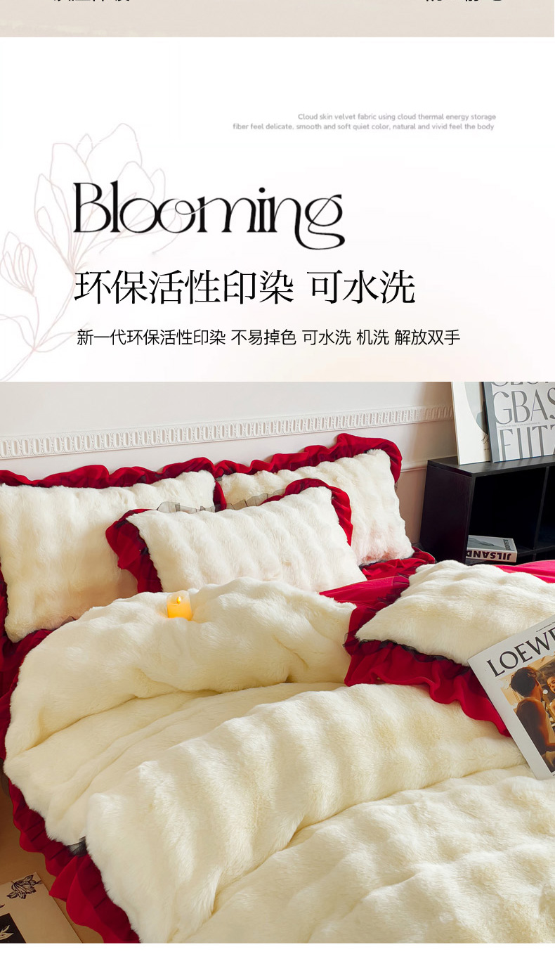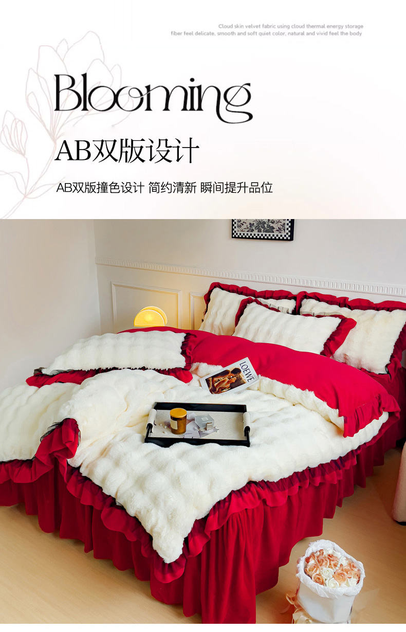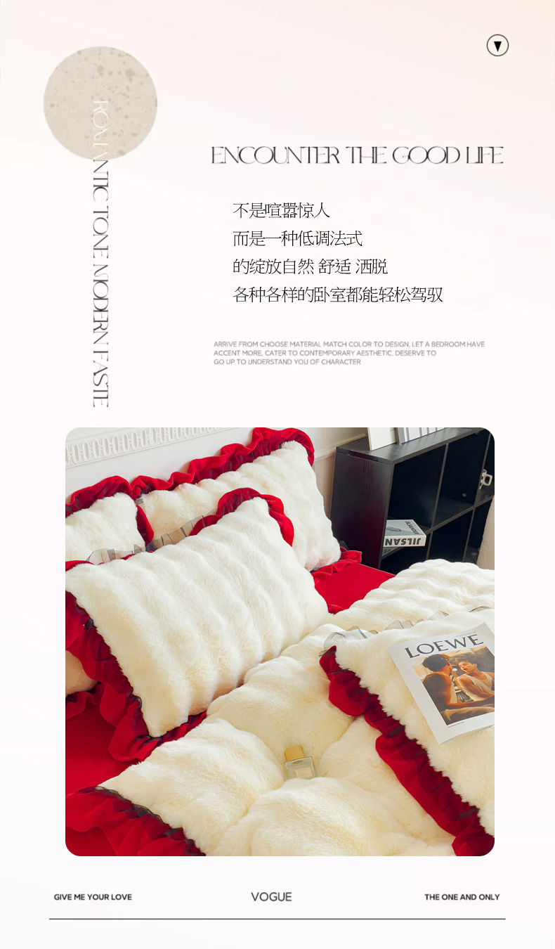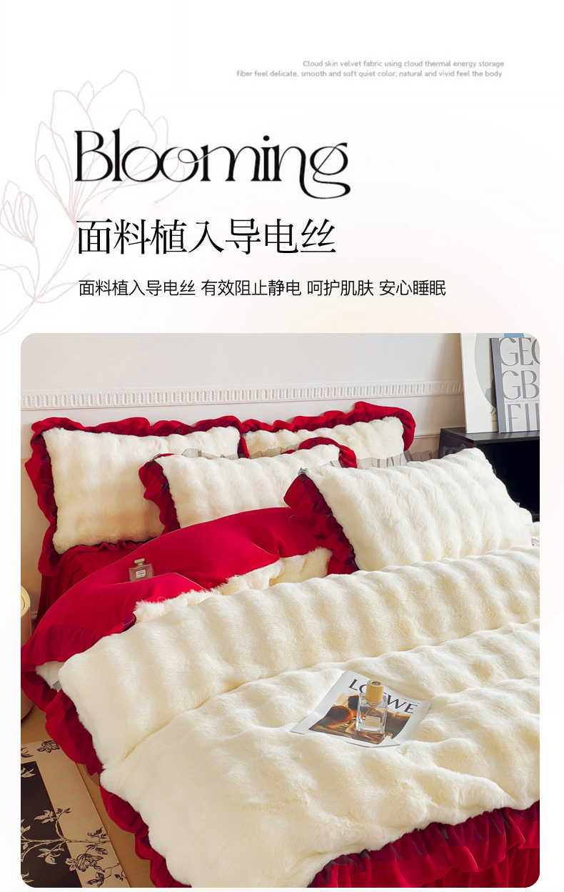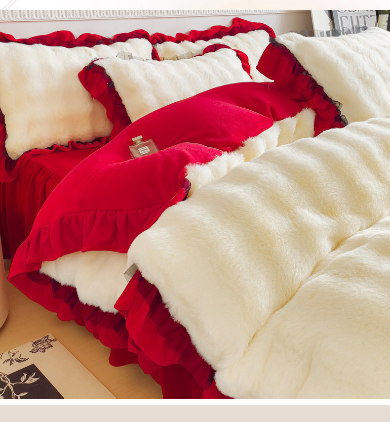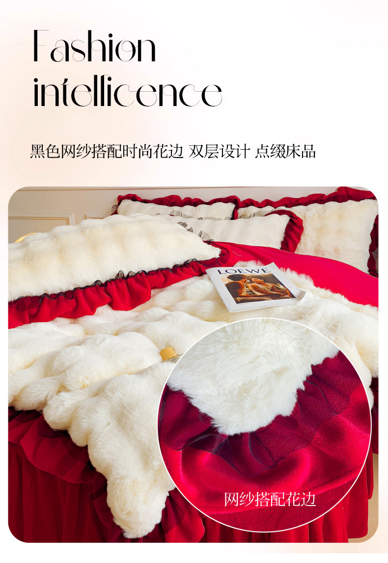 当前位置: 91家纺网 > 商品网购 > 床品套件 > 四件套 > 牛奶绒四件套 > 睡美人 2025韩版兔兔绒牛奶绒床裙床单床笠款公主蕾丝四件套 兔兔绒-中国红
