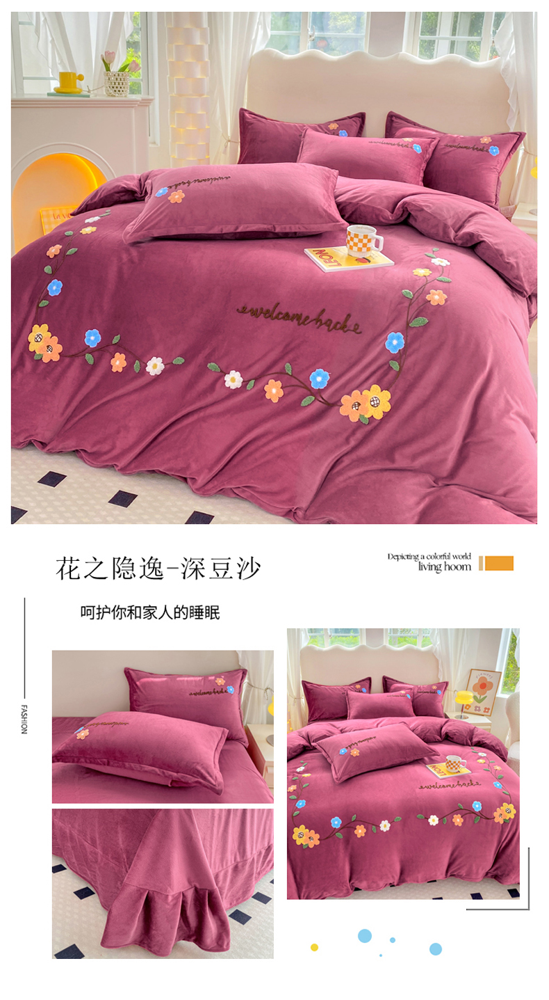 (总)2025新款保暖水晶绒床裙款四件套,紫色,浅豆沙,玫红,深豆沙,酒红,大红,深紫,灰色,蓝色,粉玉,果绿色,橘色,米色,驼色,雾蓝色