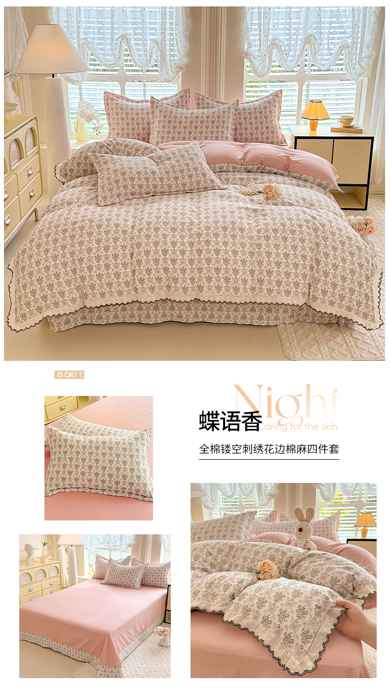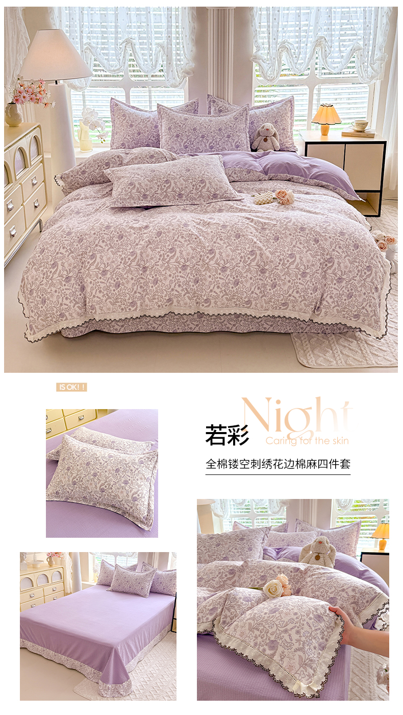 韩约家纺 2025新款1全棉镂空双色刺绣花边床单款加厚棉麻四件套 若彩
