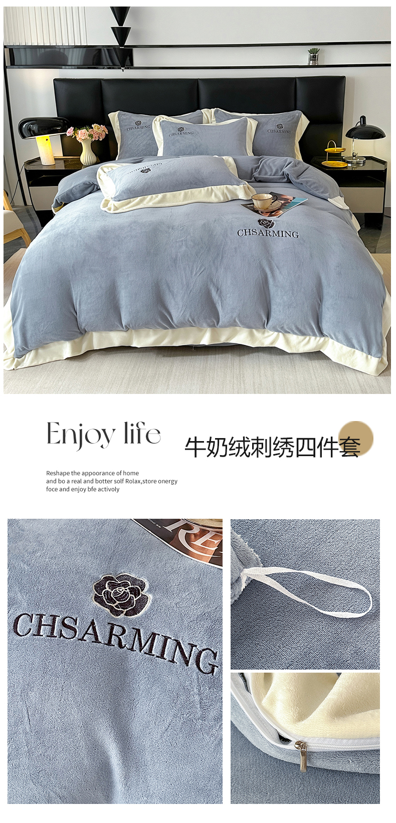 商品名称:爱洛 2025新款牛奶绒四件套牛奶绒刺绣四件套纯色牛奶绒四件套 山茶花-蓝灰色