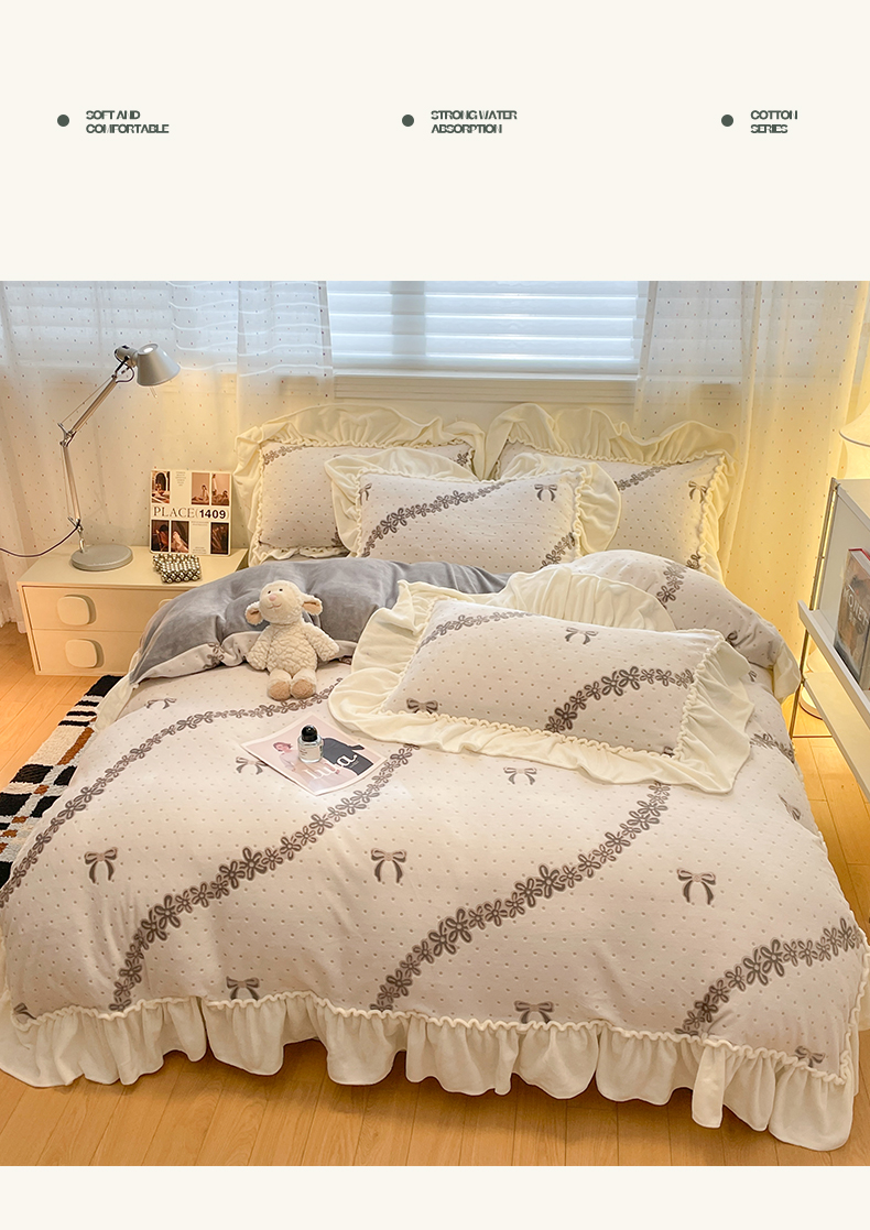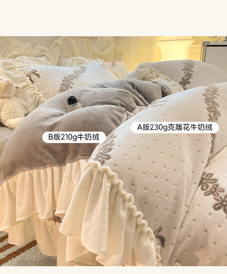 商品名称:利欧 2025新款褶皱边雕花牛奶绒四件套 少女结-粉