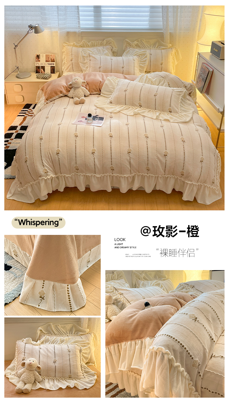 (总)利欧 2025新款褶皱边雕花牛奶绒四件套,玫影-紫,蝶舞-蓝,蝶舞-绿,玫影-橙,少女结-粉,少女结-灰,少女结-蓝,舞蝶-粉