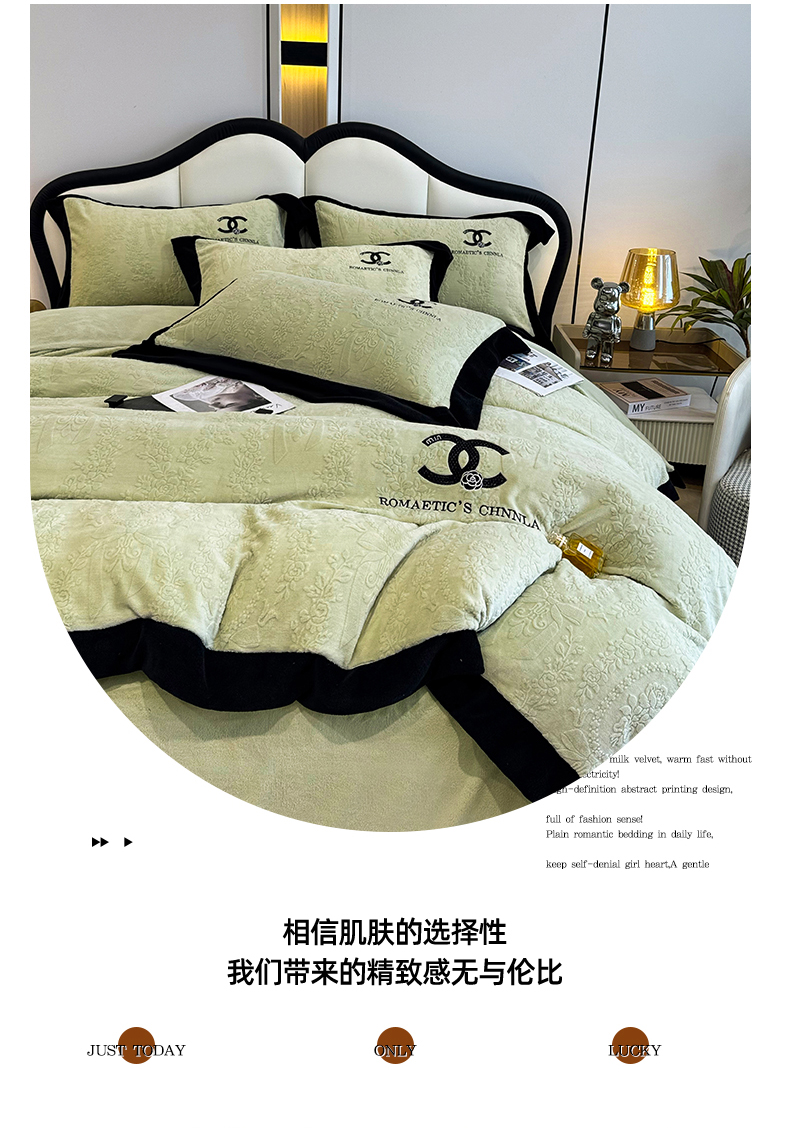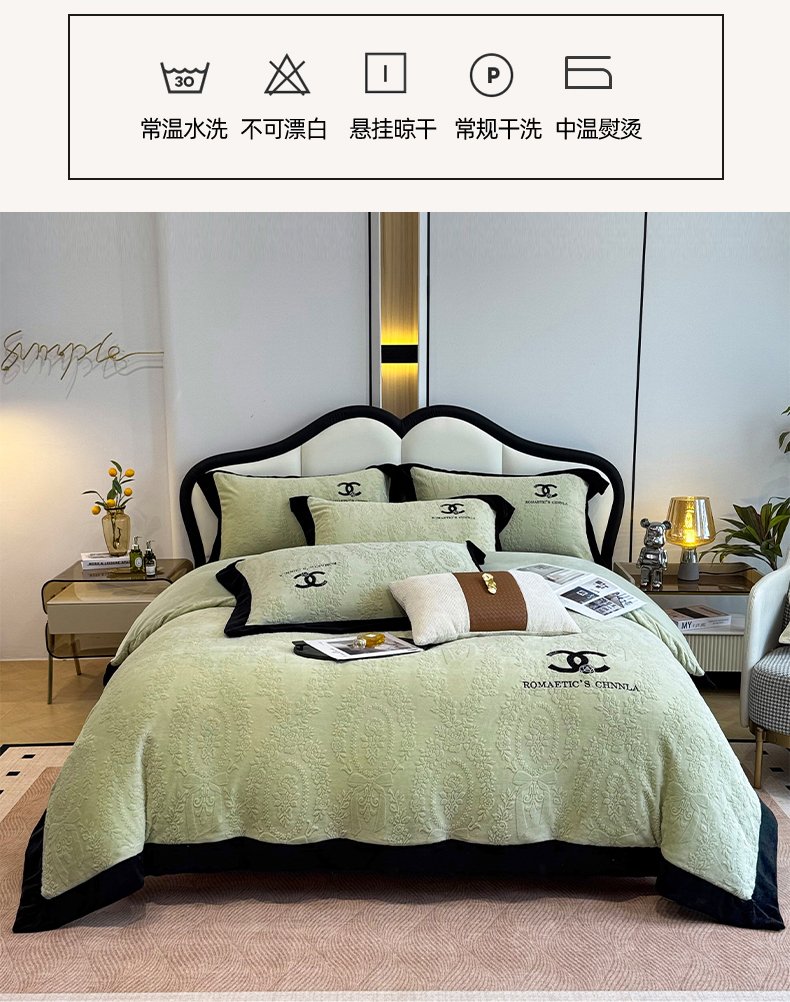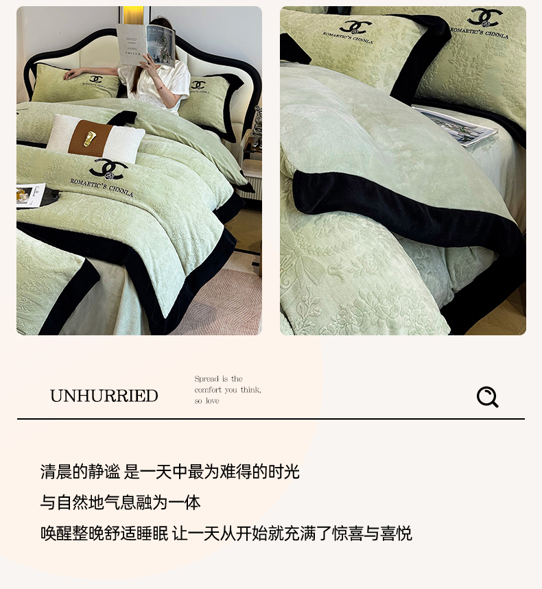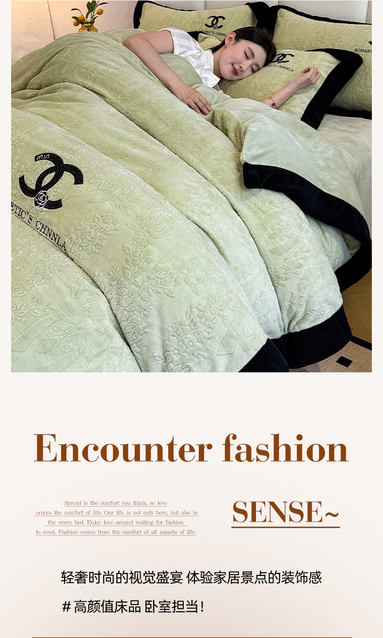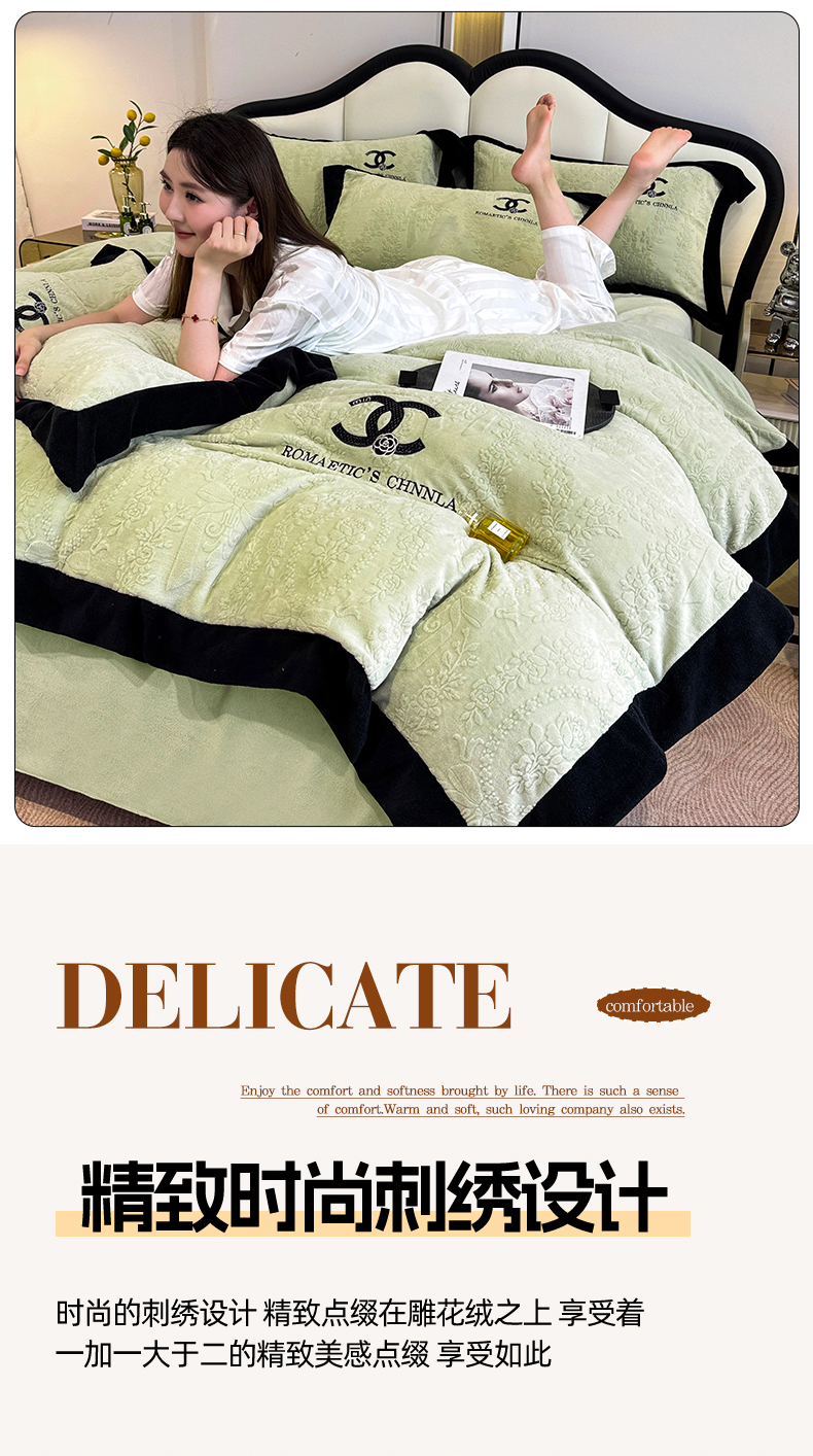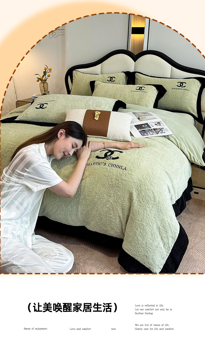 当前位置: 91家纺网 > 商品网购 > 床品套件 > 四件套 > 牛奶绒四件套 > 言熙居家纺 2025新款全消光240克雕花牛奶绒四件套一套重9斤小香风系列 小香风-抹茶绿