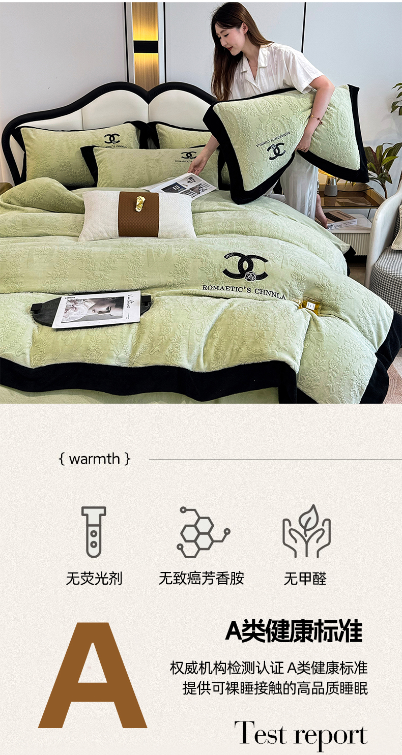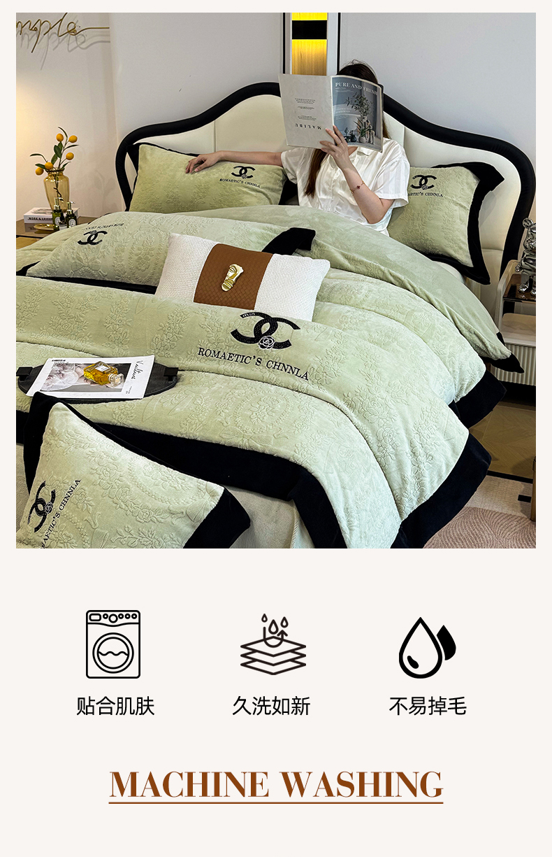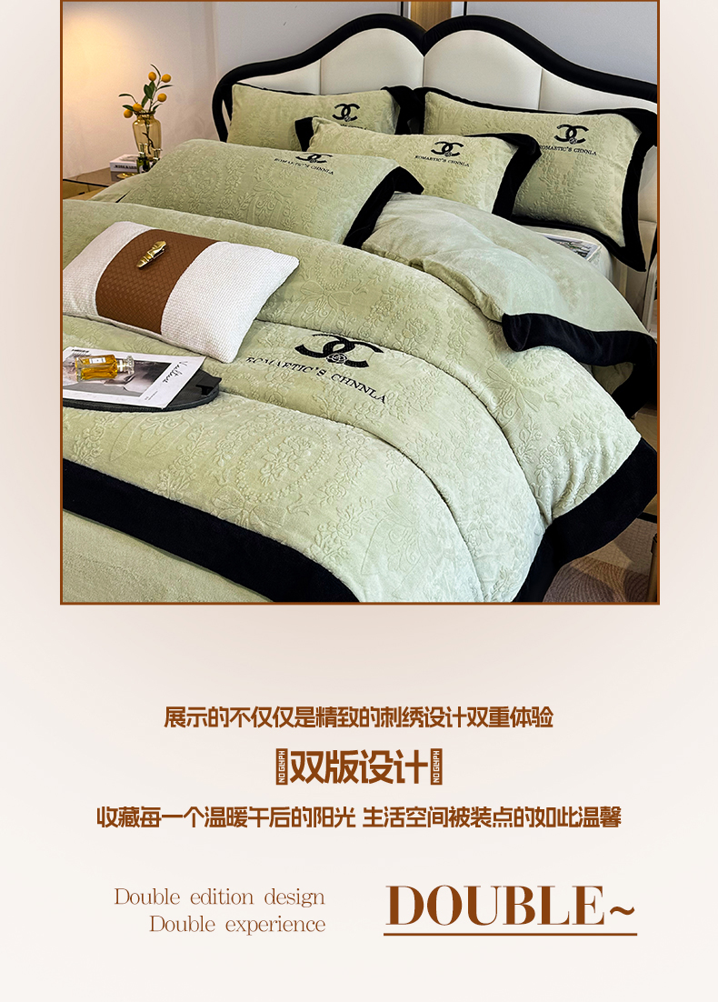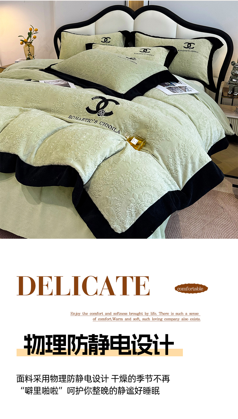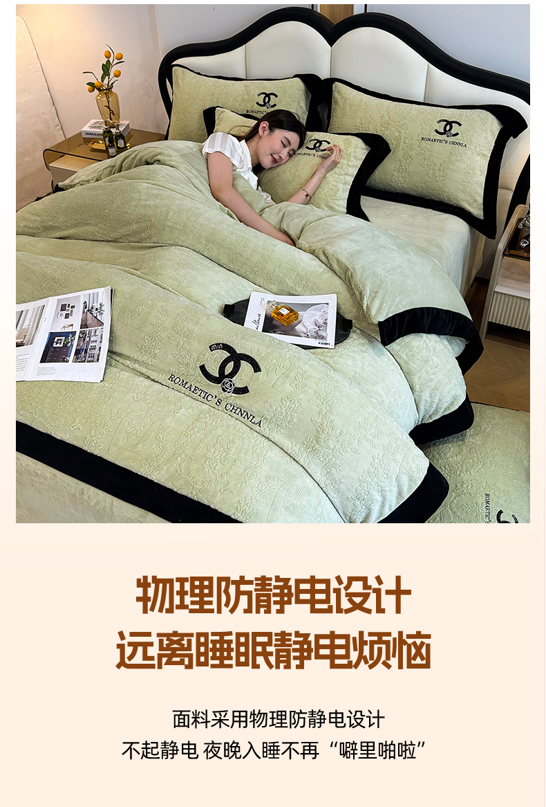 当前位置: 91家纺网 > 商品网购 > 床品套件 > 四件套 > 牛奶绒四件套 > 言熙居家纺 2025新款全消光240克雕花牛奶绒四件套一套重9斤小香风系列 小香风-抹茶绿