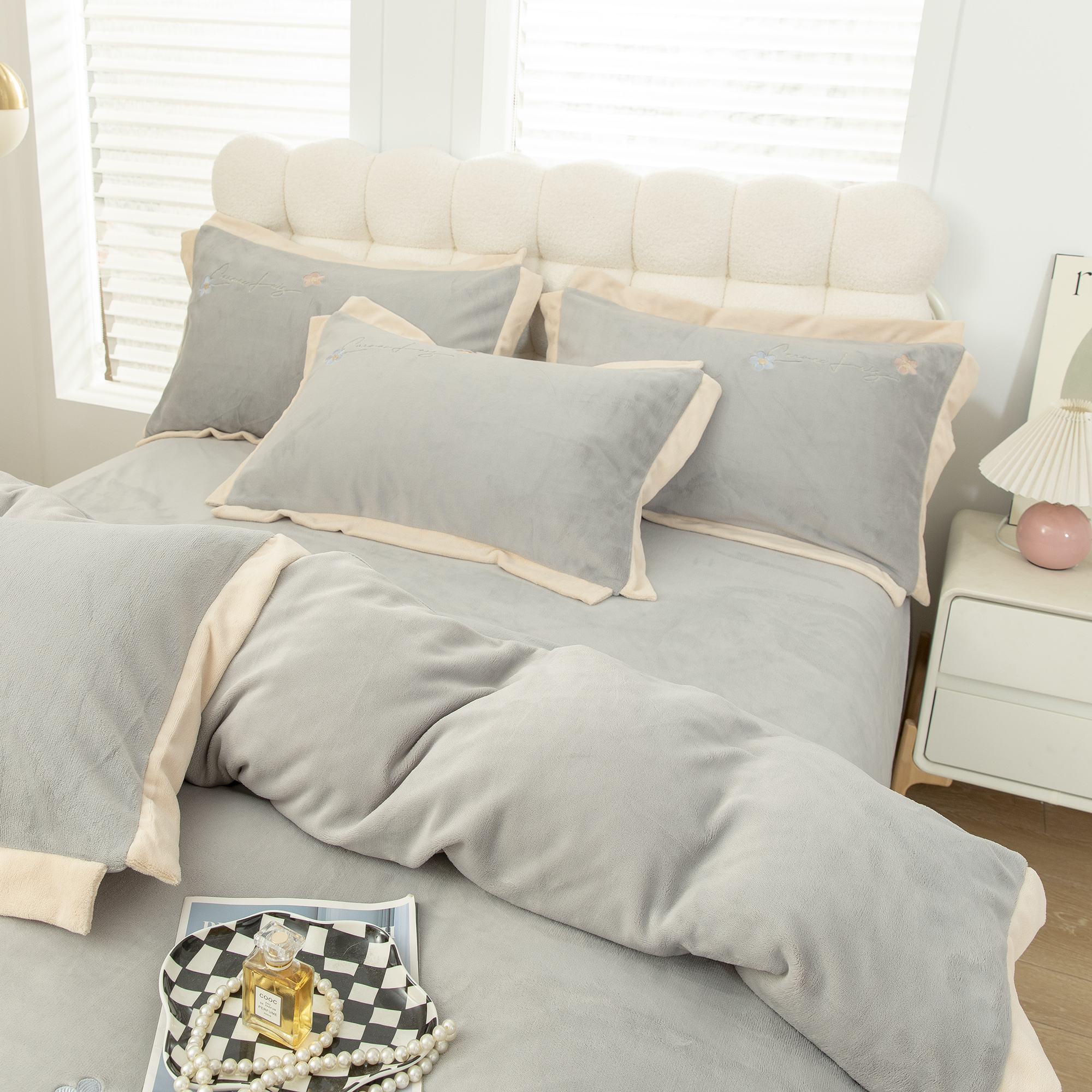 贝尔 2025新款纯色高克重牛奶绒刺绣四件套-羽魅 羽魅-豆沙,羽魅-豆沙
