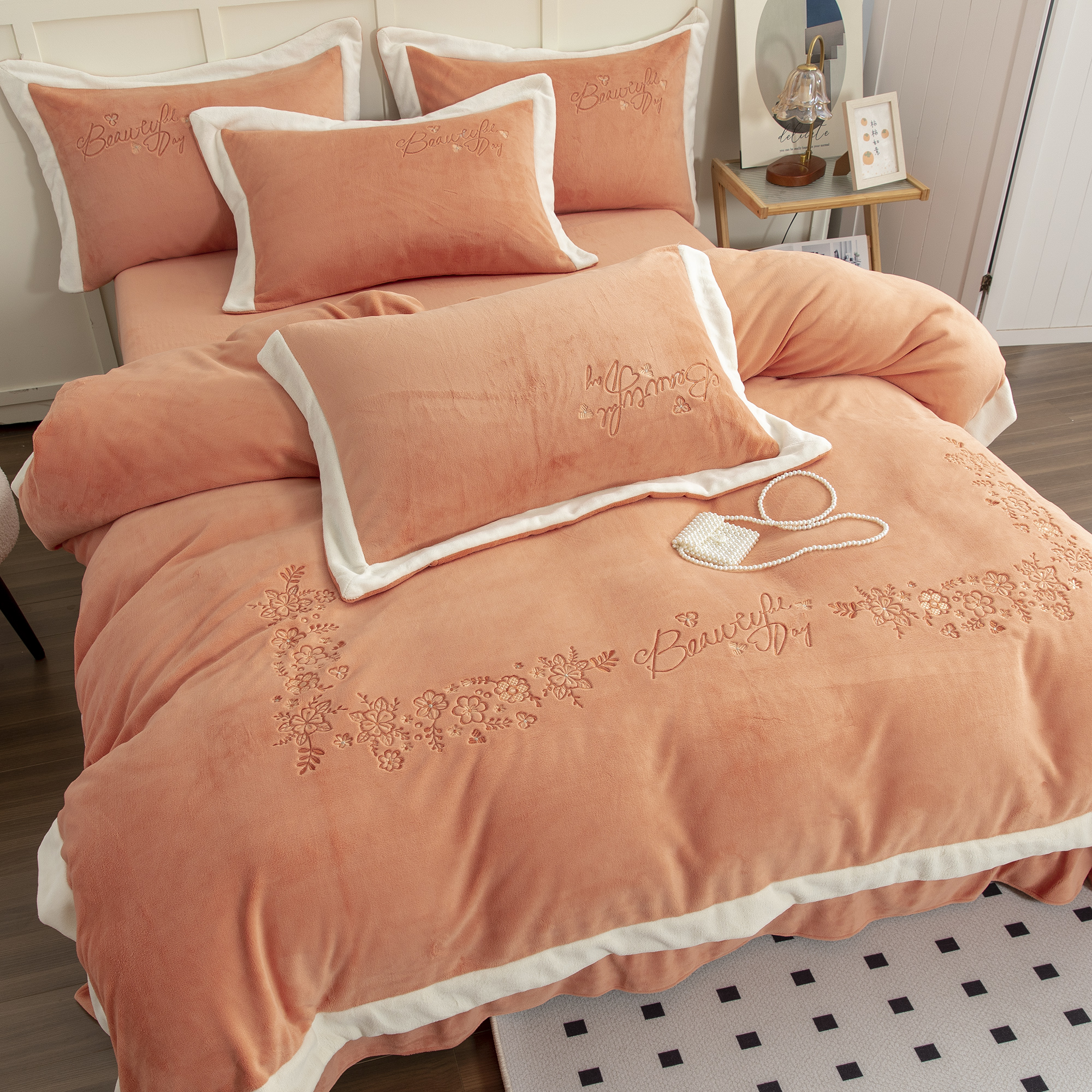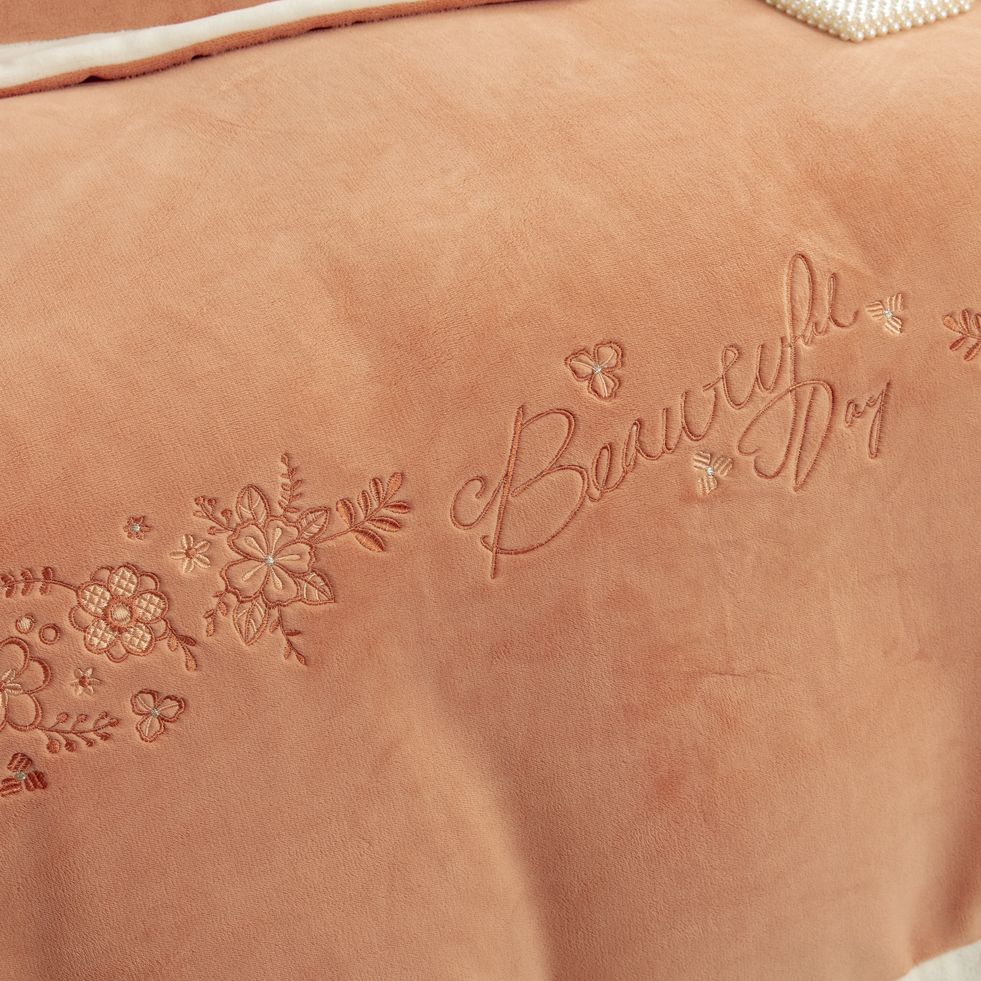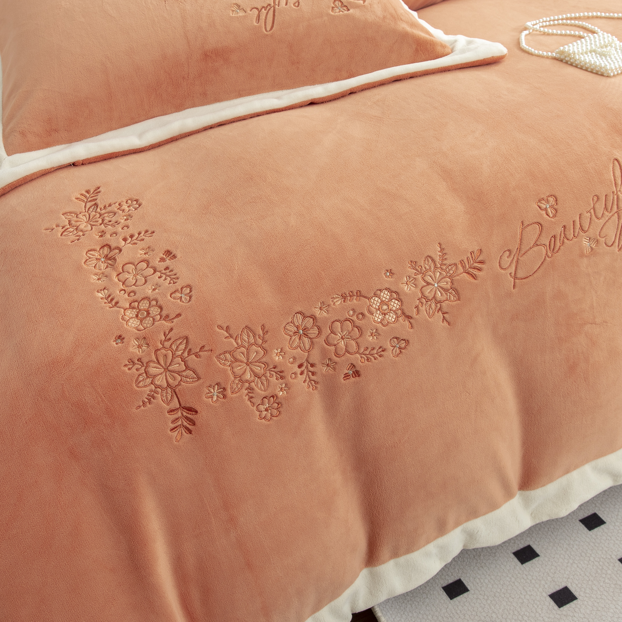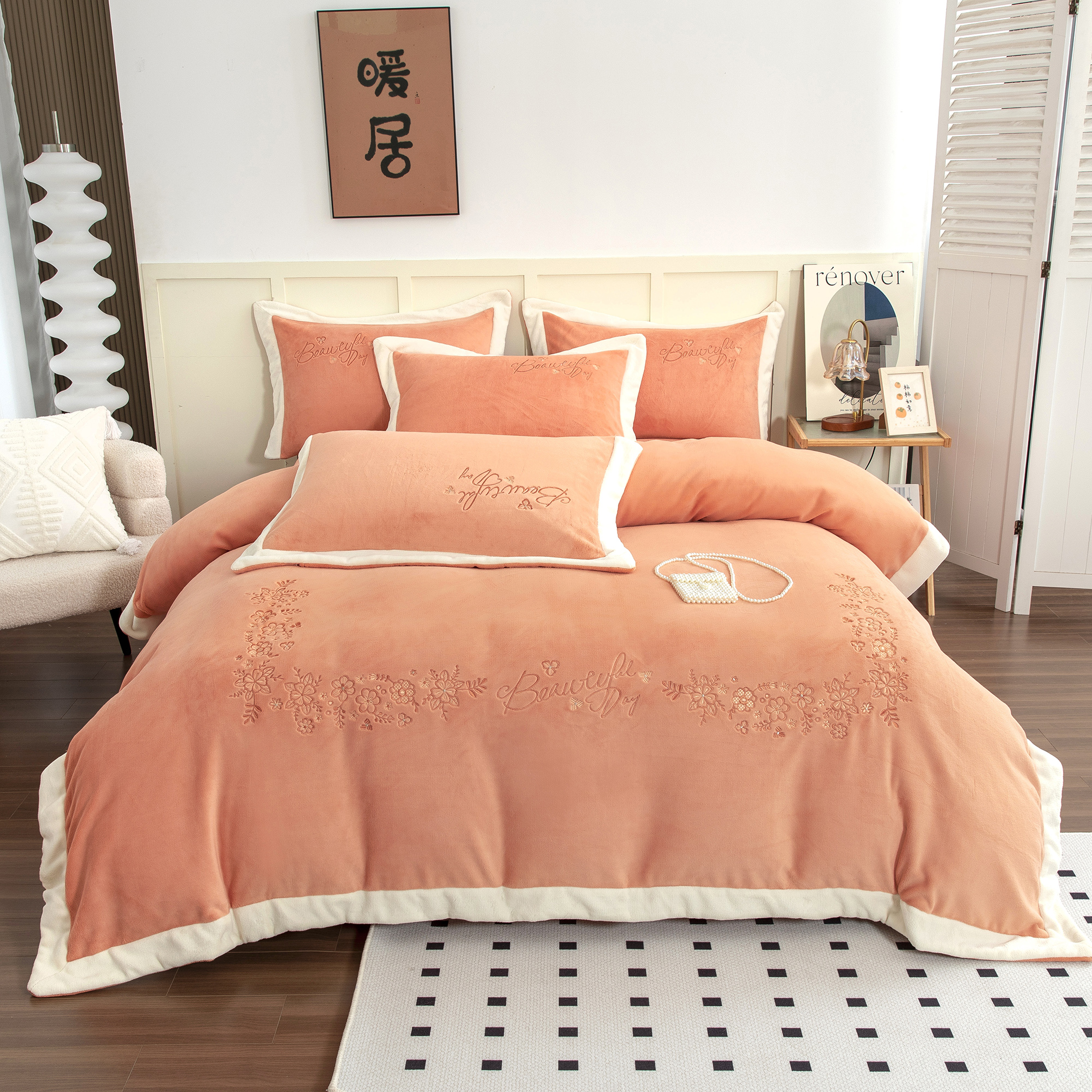 贝尔 2025新款纯色高克重牛奶绒刺绣四件套-羽魅 羽魅-豆沙,羽魅-豆沙