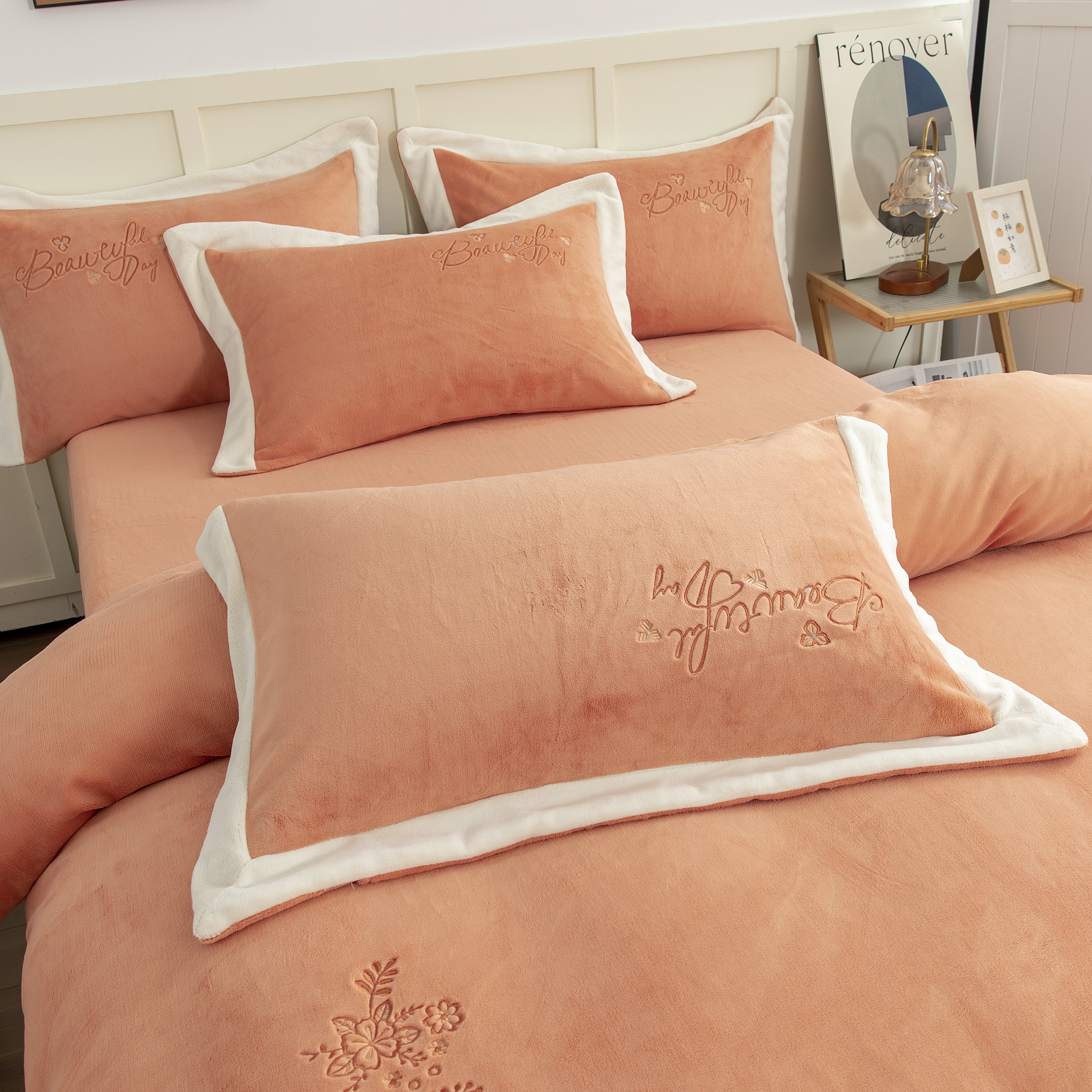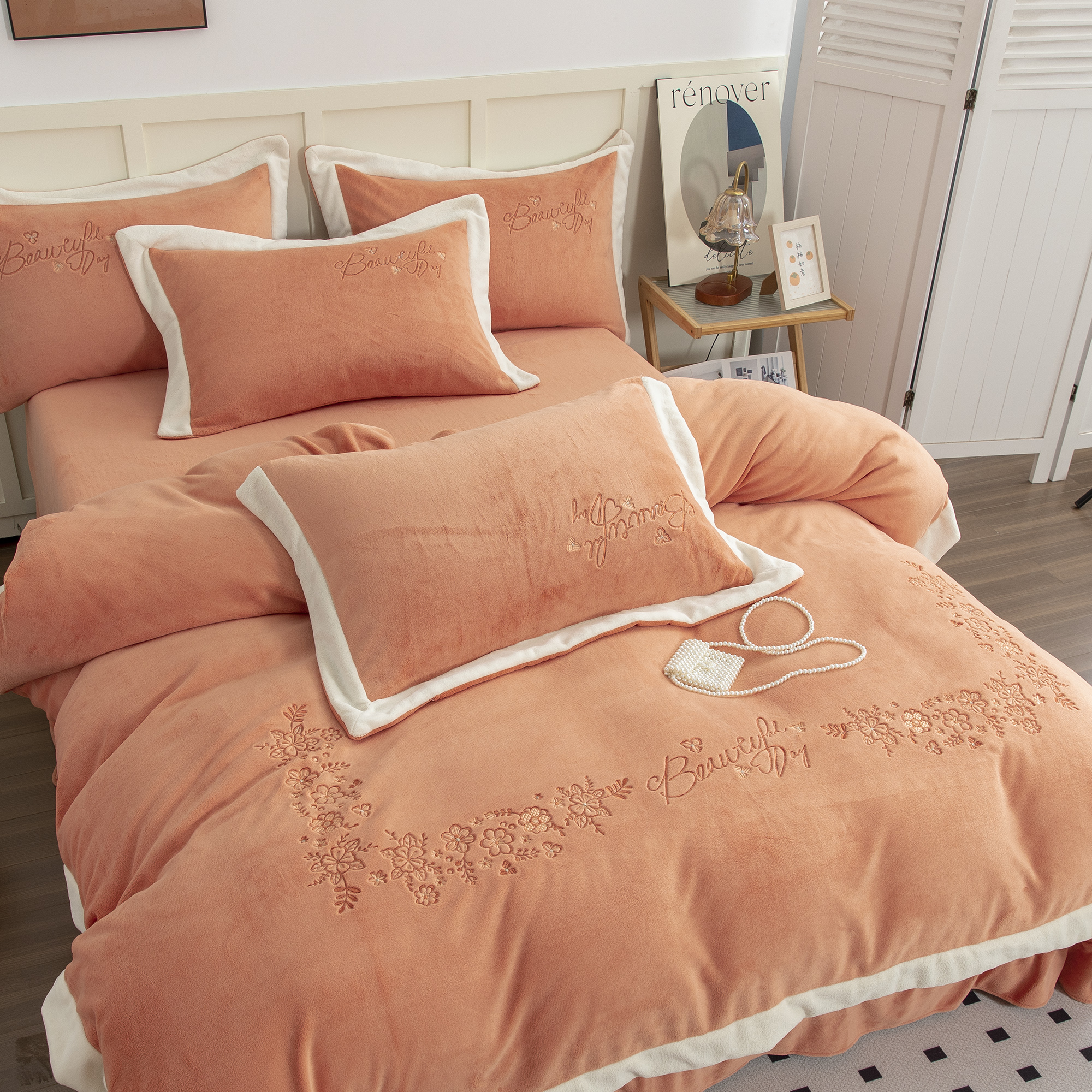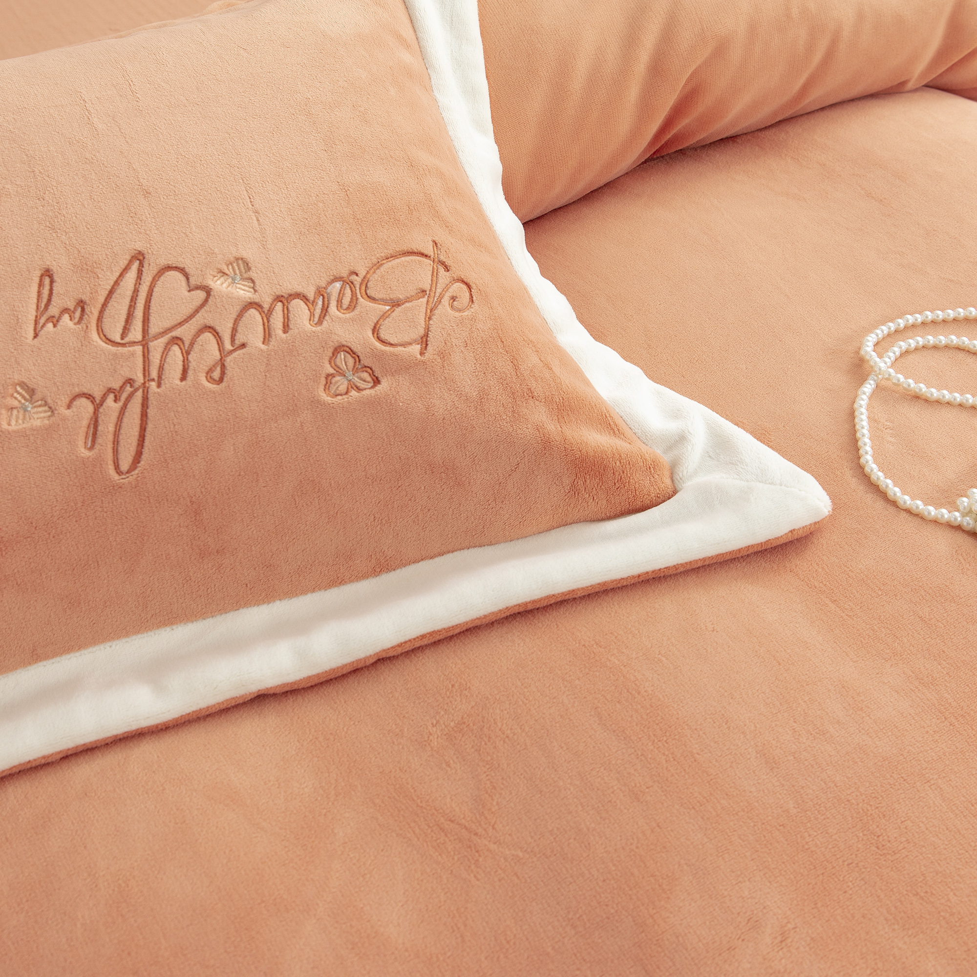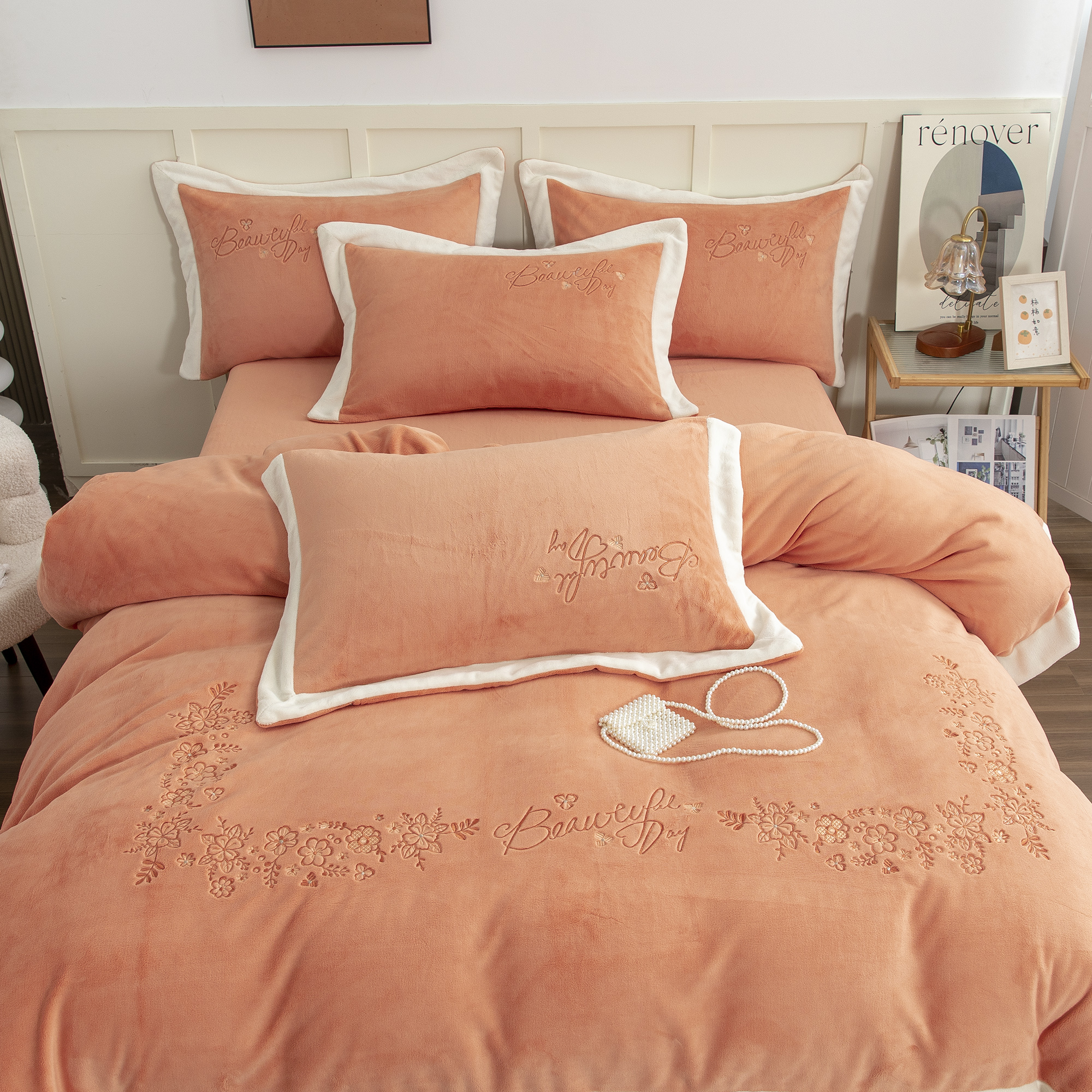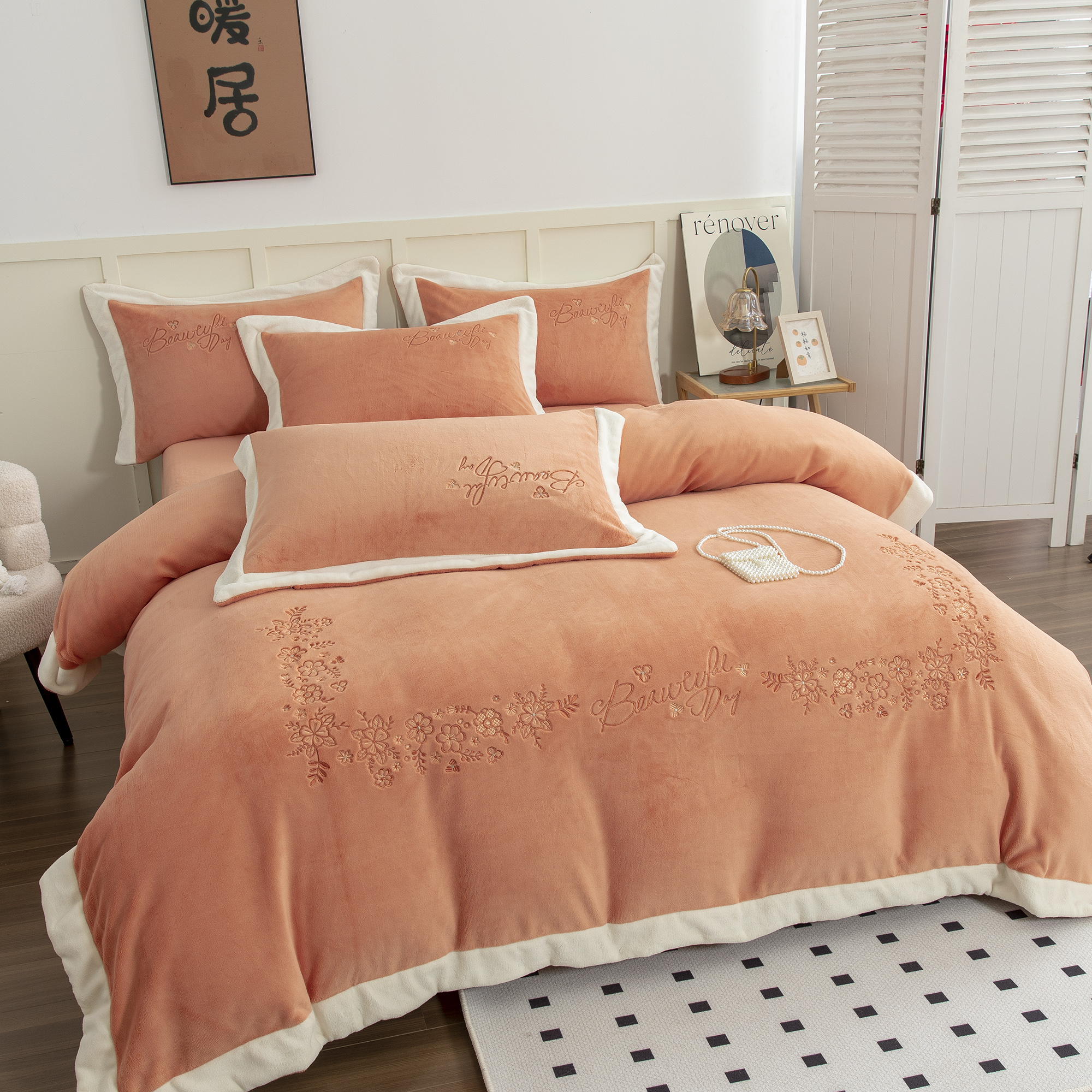 贝尔 2025新款纯色高克重牛奶绒刺绣四件套-羽魅 羽魅-豆沙,羽魅-豆沙