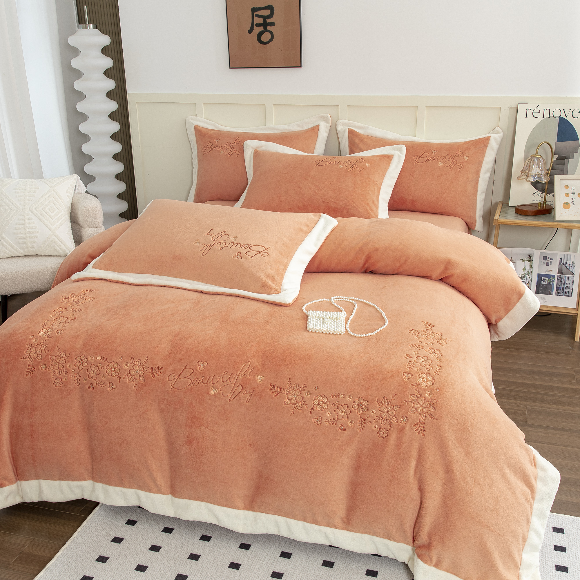 商品名称:贝尔 2025新款青黛-纯色高克重全消光蚕丝绒(赠送拎袋)拼角刺绣四件套 橘色