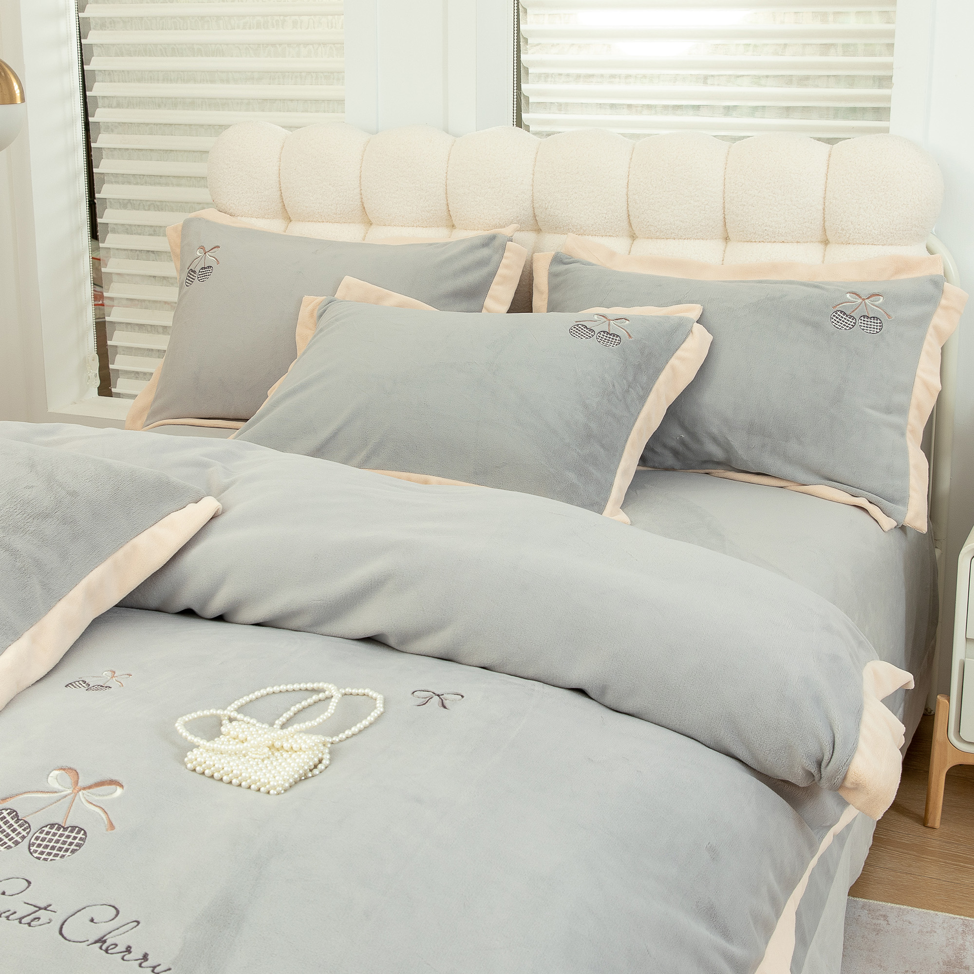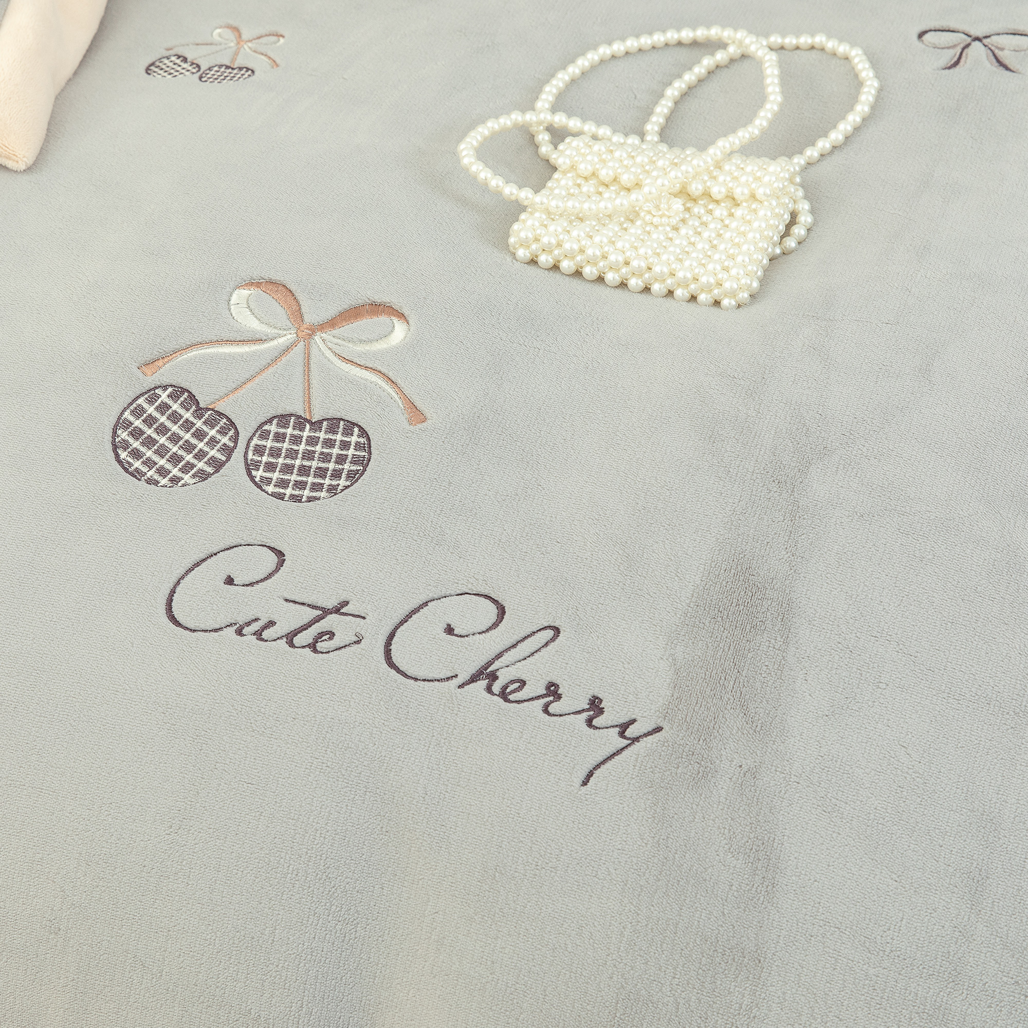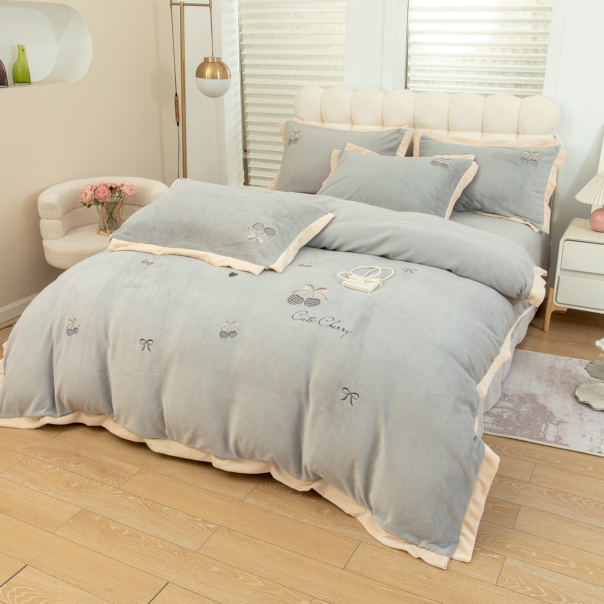 商品名称:贝尔 2025新款甜蜜樱桃-纯色高克重全消光蚕丝绒(赠送拎袋)-段角刺绣四件套 甜蜜樱桃-银灰