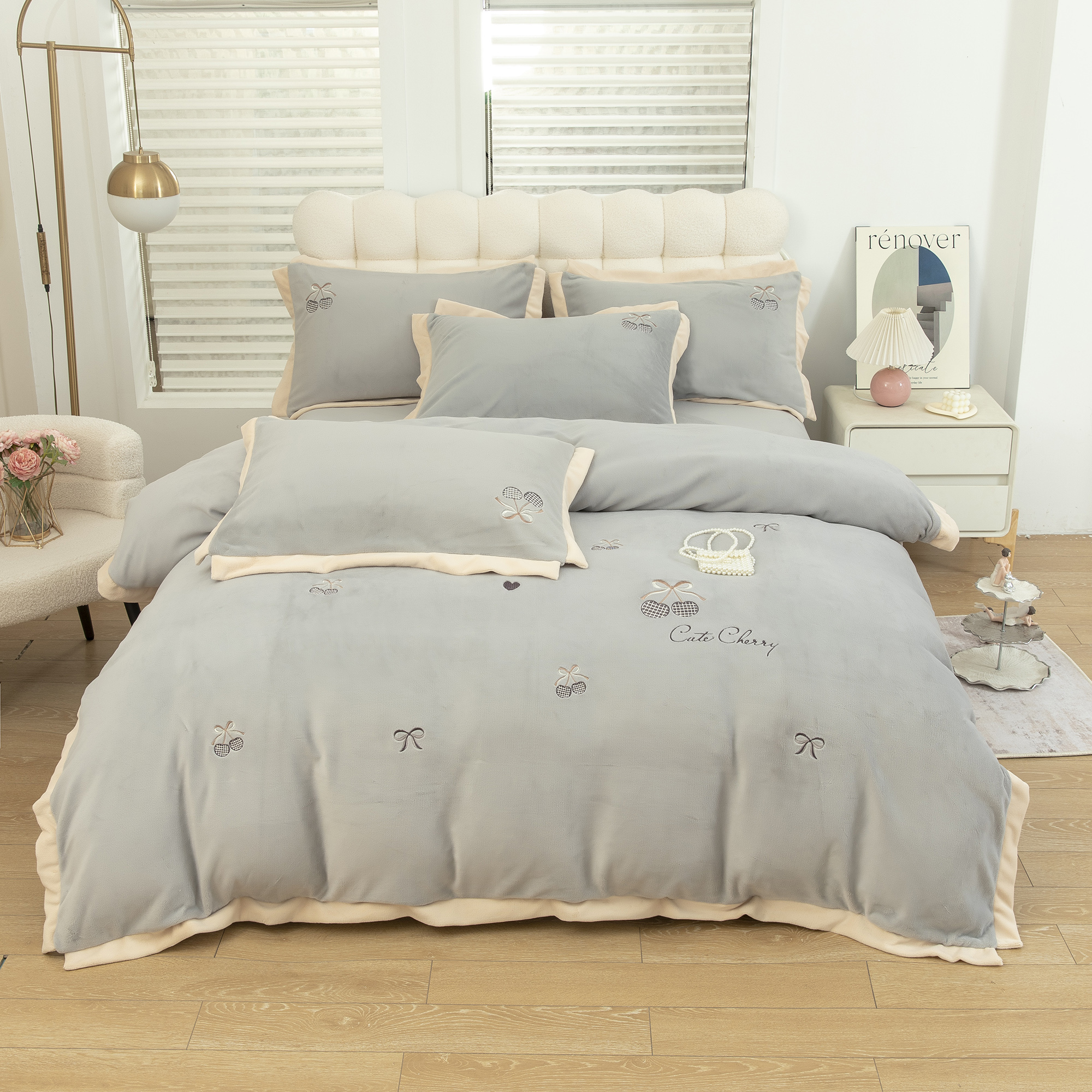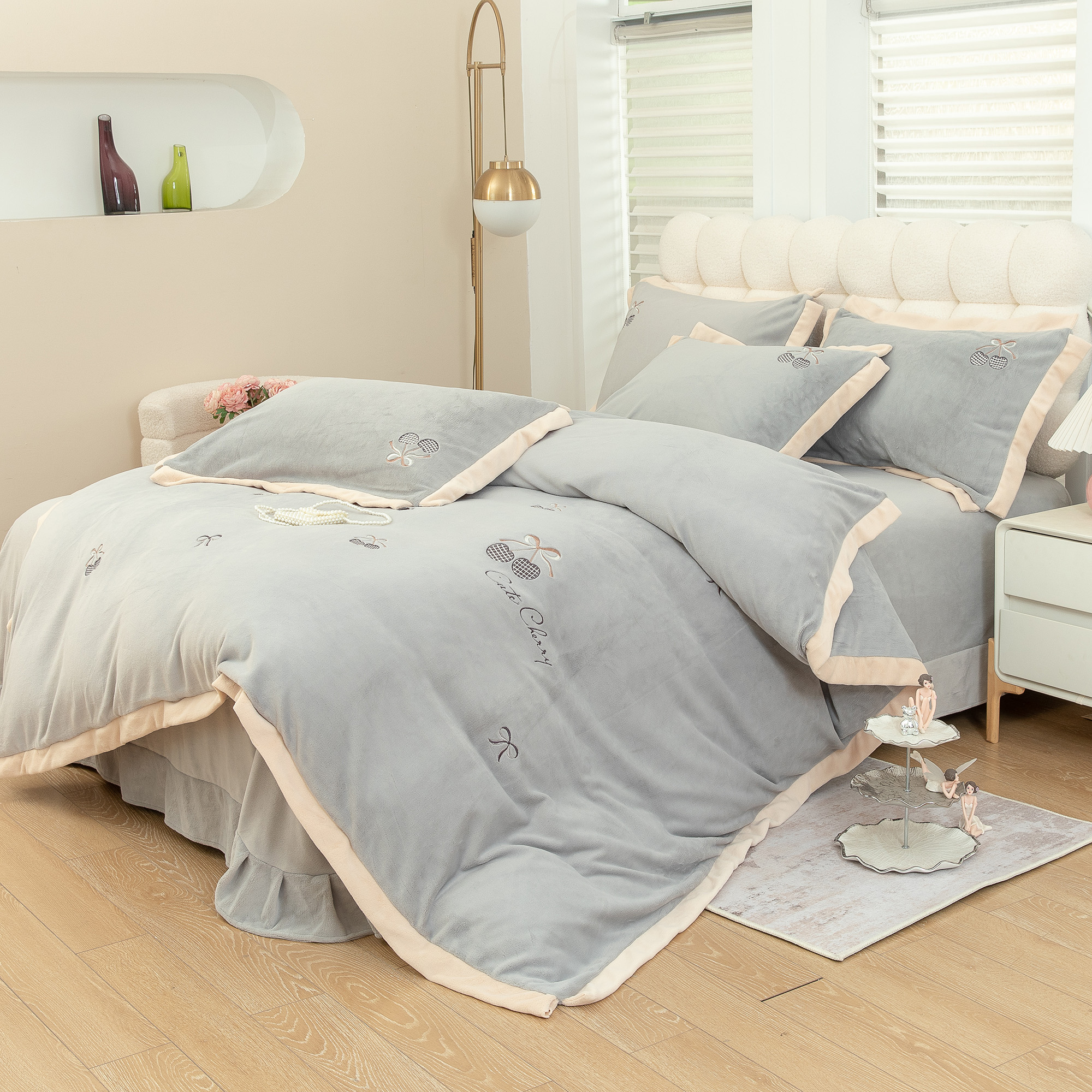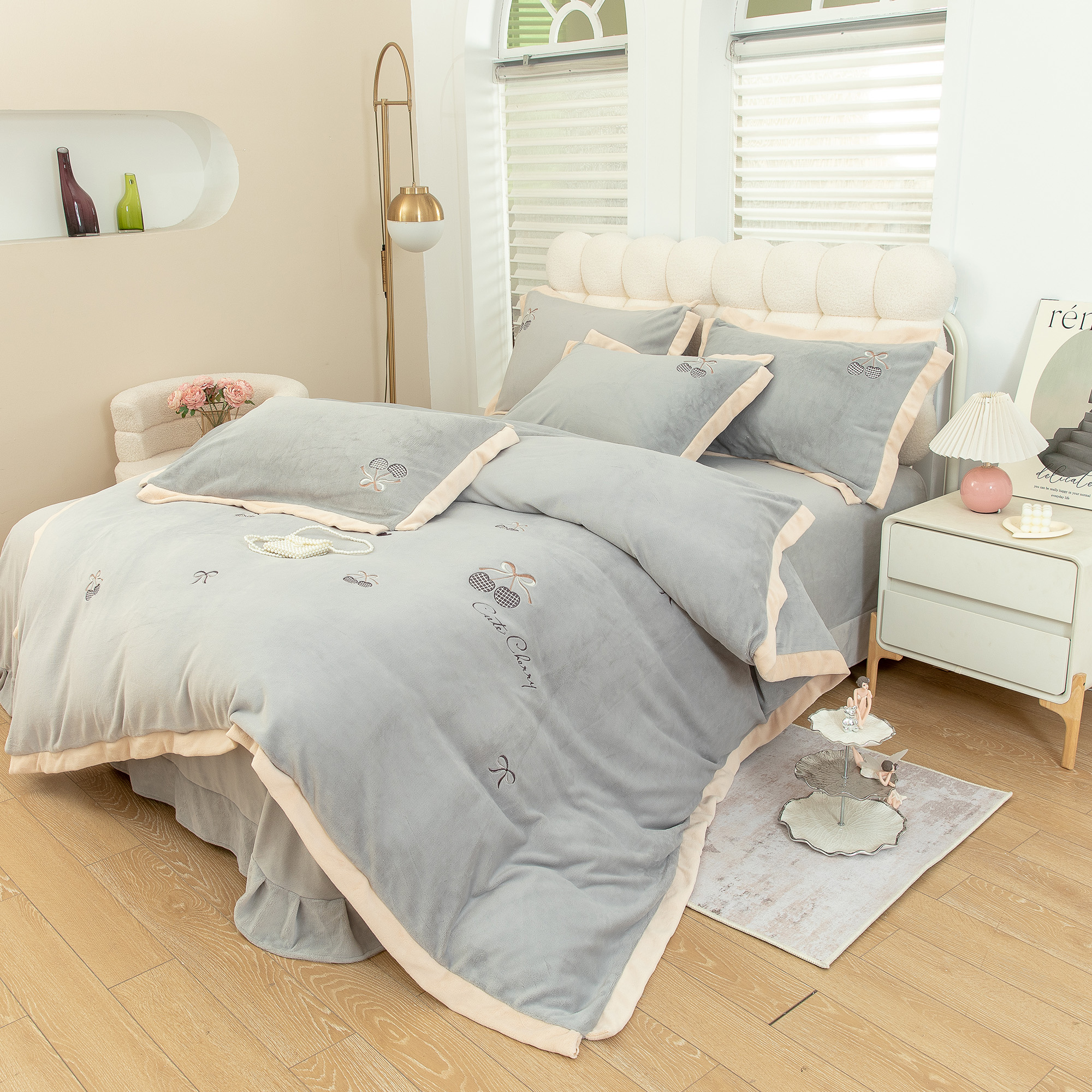 商品名称:贝尔 2025新款甜蜜樱桃-纯色高克重全消光蚕丝绒(赠送拎袋)-段角刺绣四件套 甜蜜樱桃-银灰