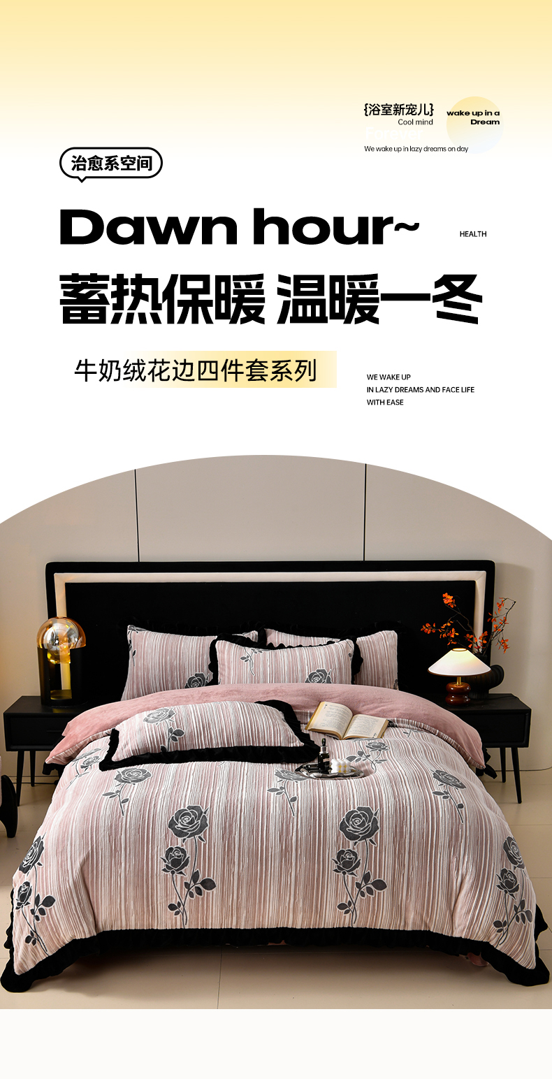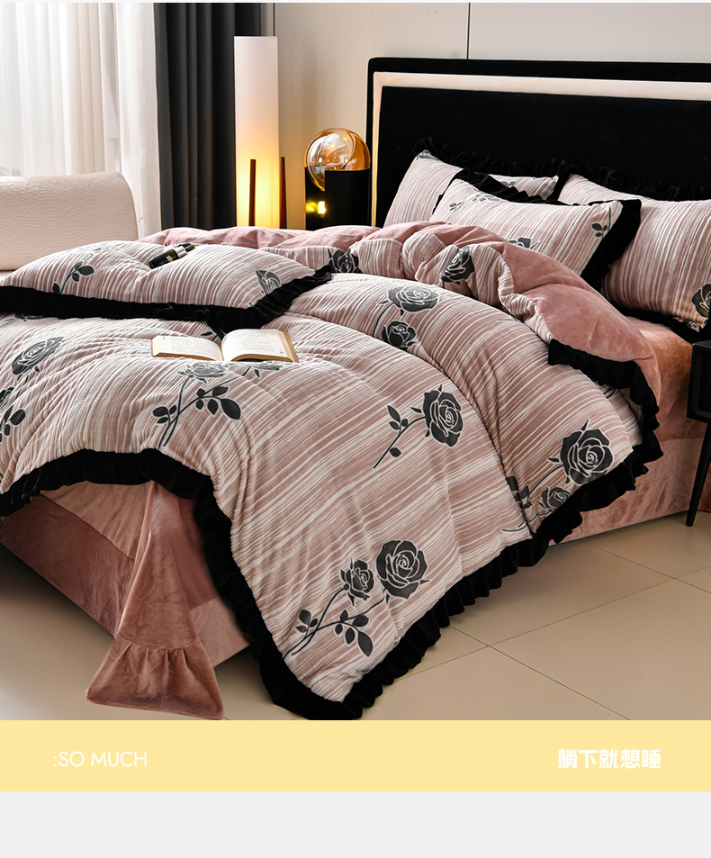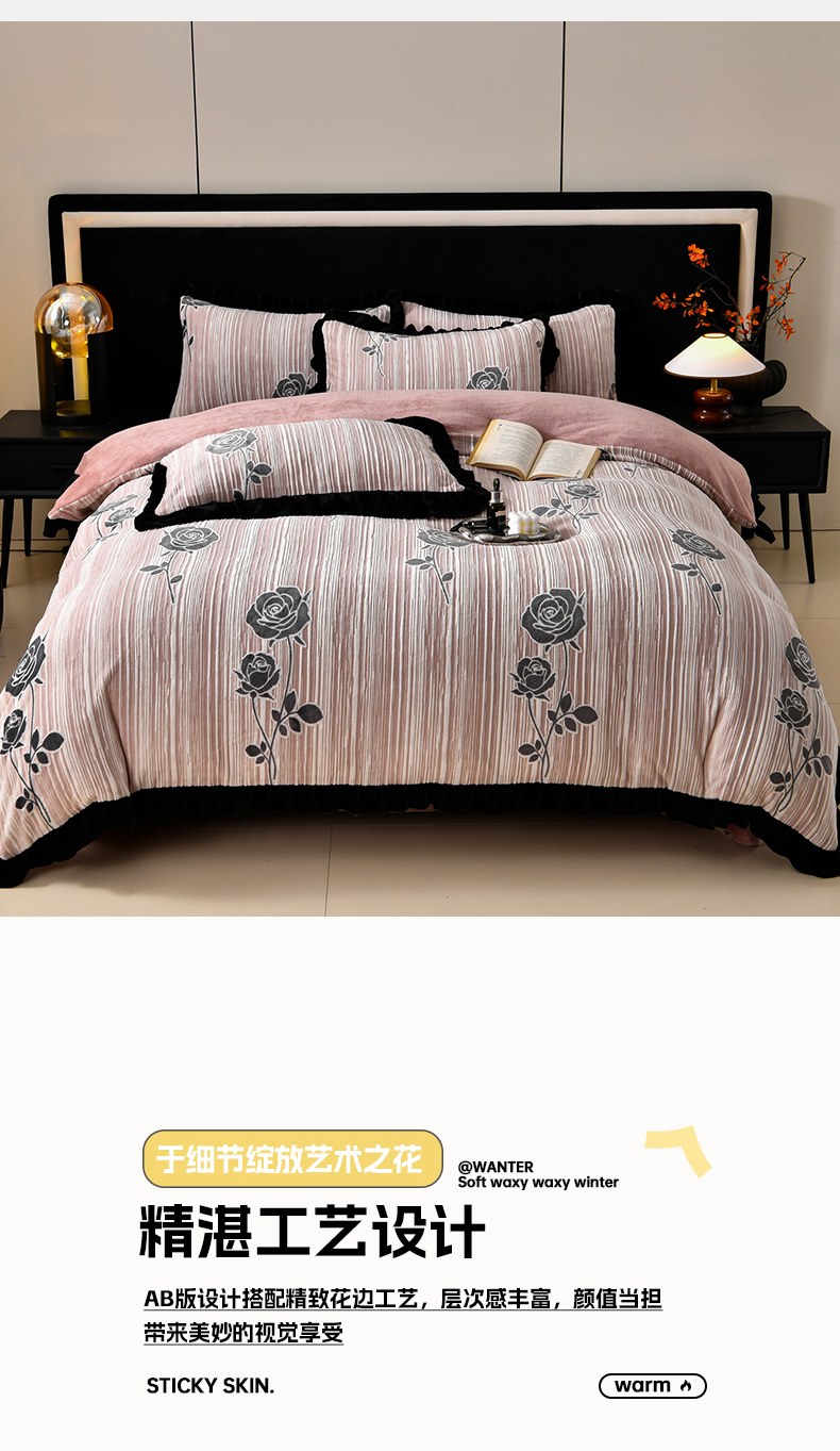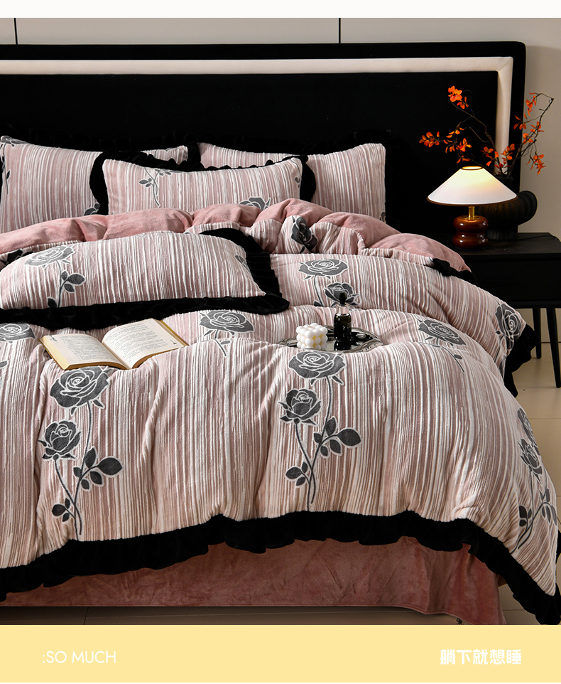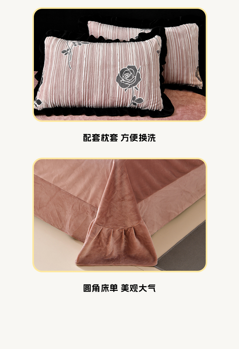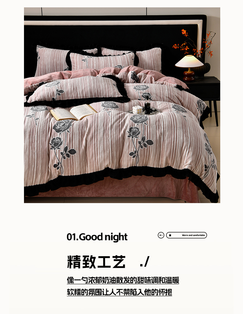 商品名称:畅畅家纺 2025新款冬季雕花绒赫本风牛奶绒花边四件套花边蝴蝶系列 玫瑰-粉