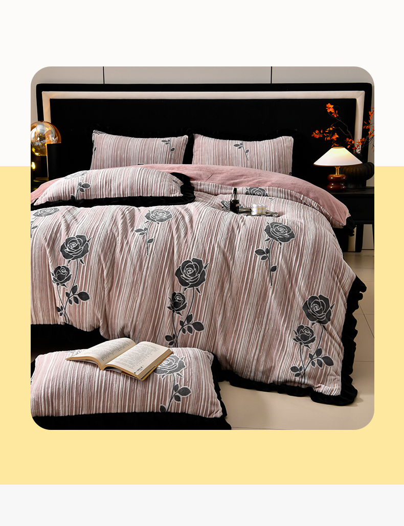 畅畅家纺 2025新款冬季雕花绒赫本风牛奶绒花边四件套花边蝴蝶系列 玫瑰-粉