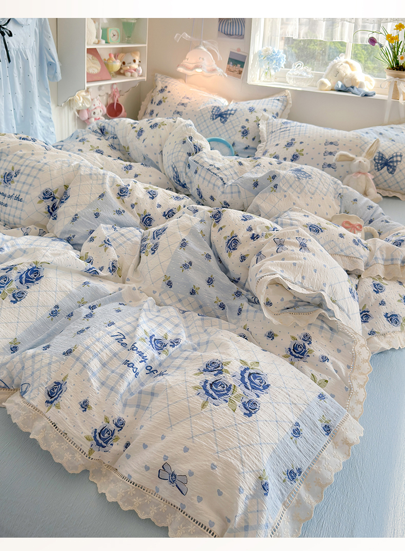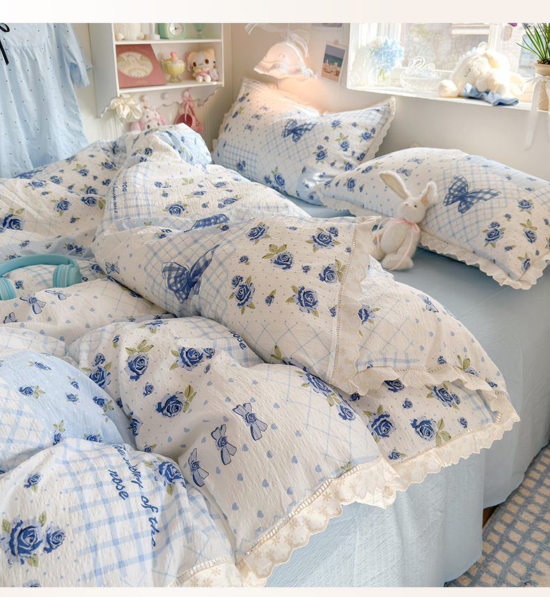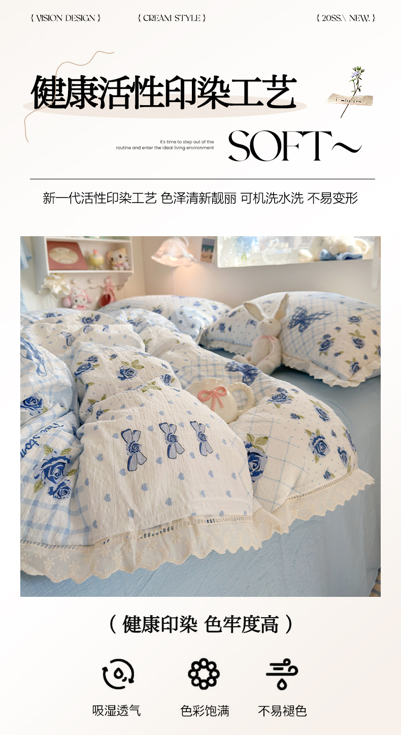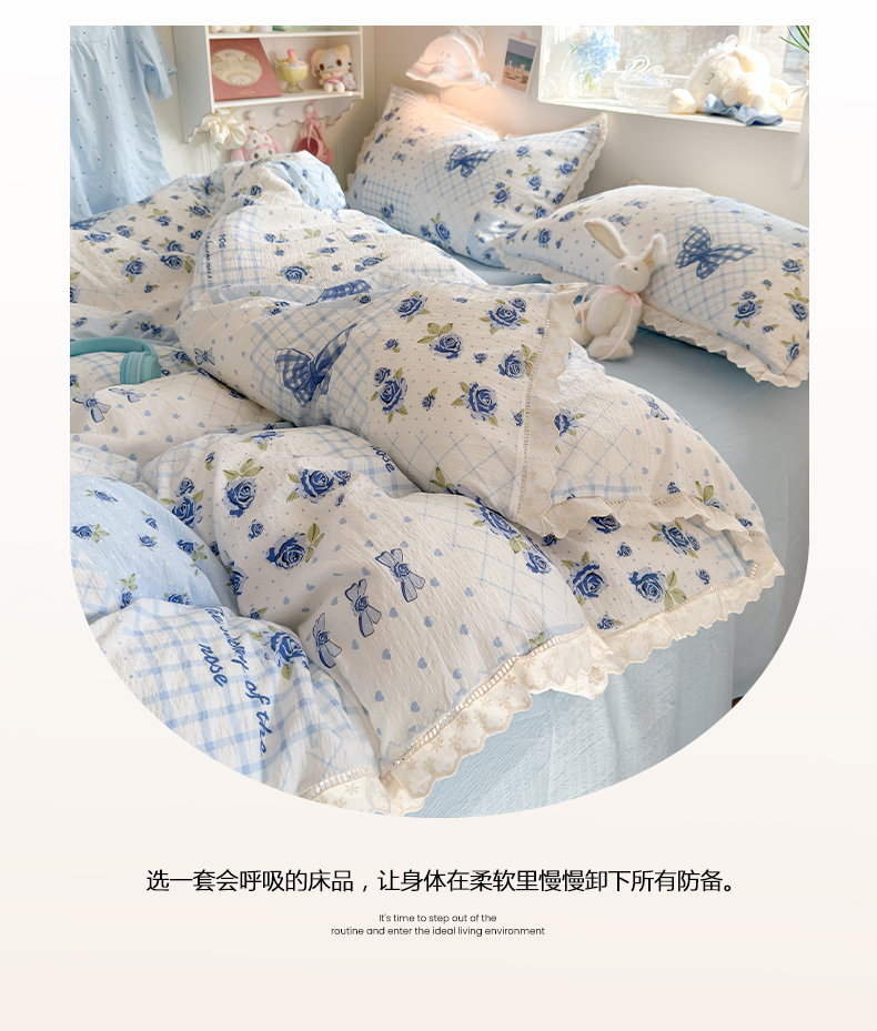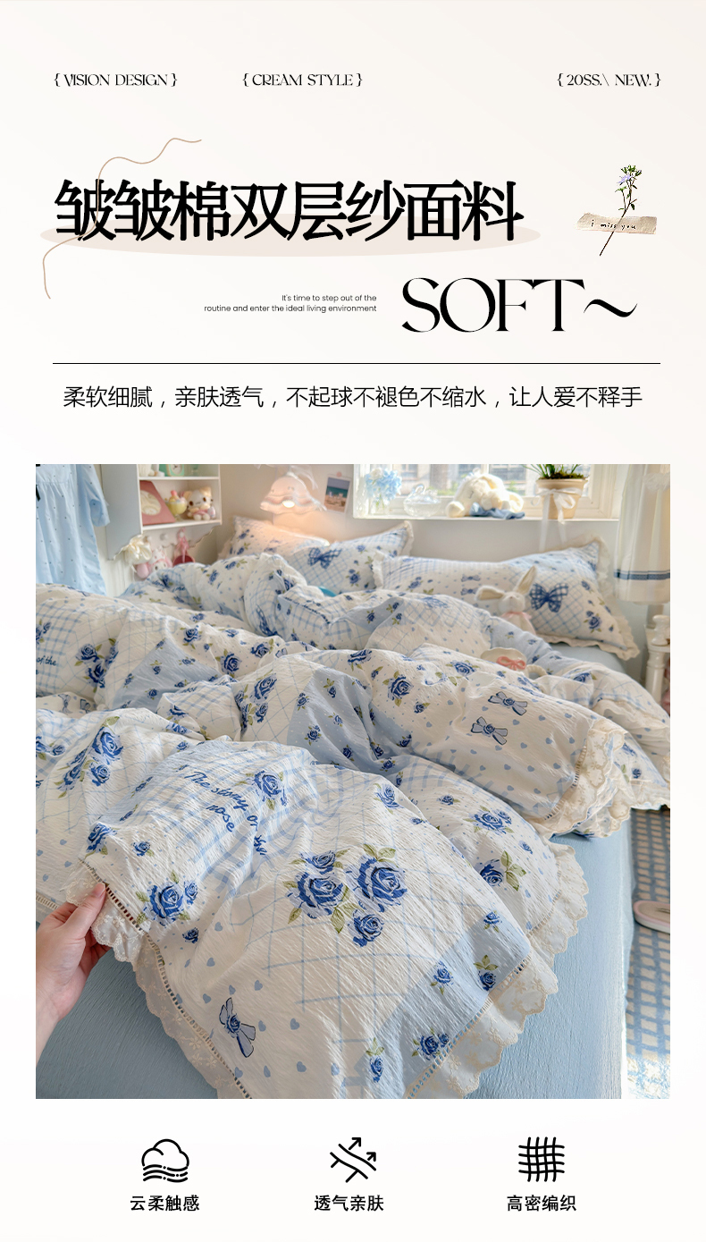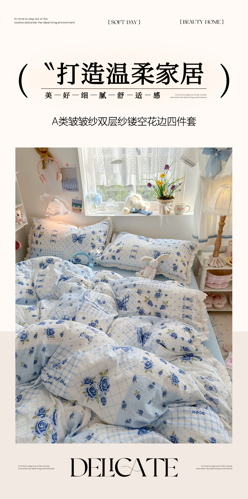当前位置: 91家纺网 > 商品网购 > 床品套件 > 四件套 > 双层纱四件套 > 优卡迪家纺馆 2025新款A类全棉镂空花边皱皱棉双层纱四件套 蓝玫之约