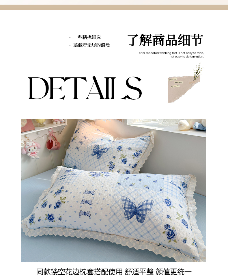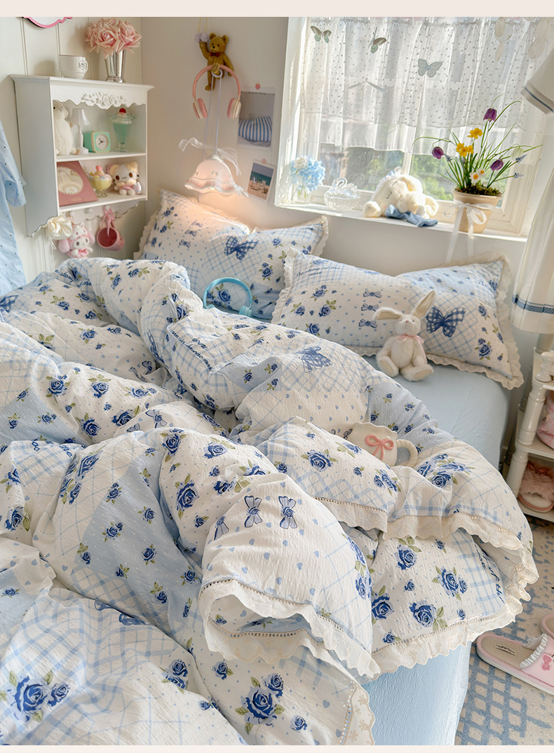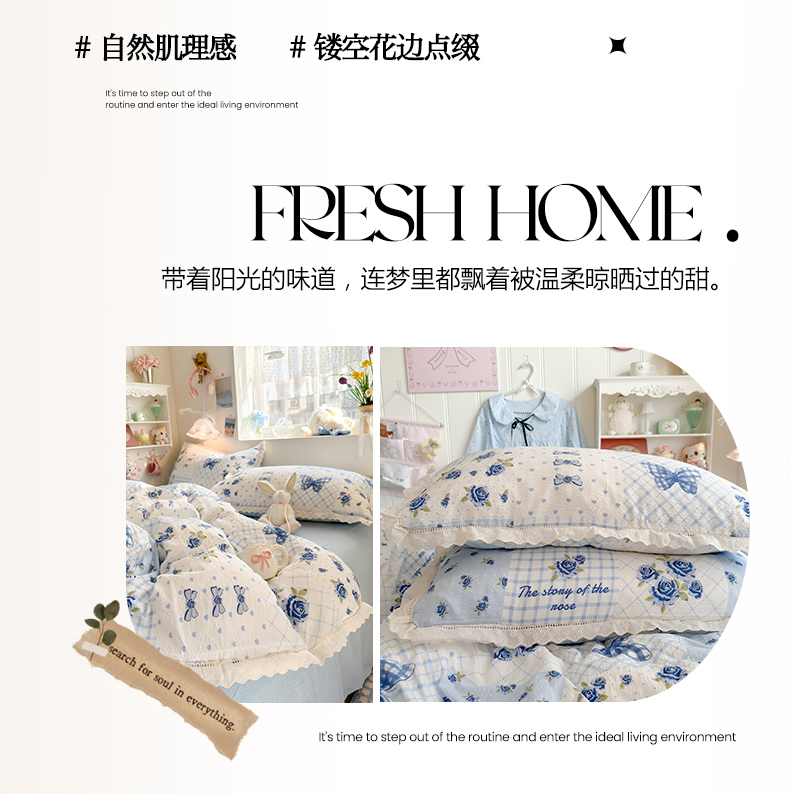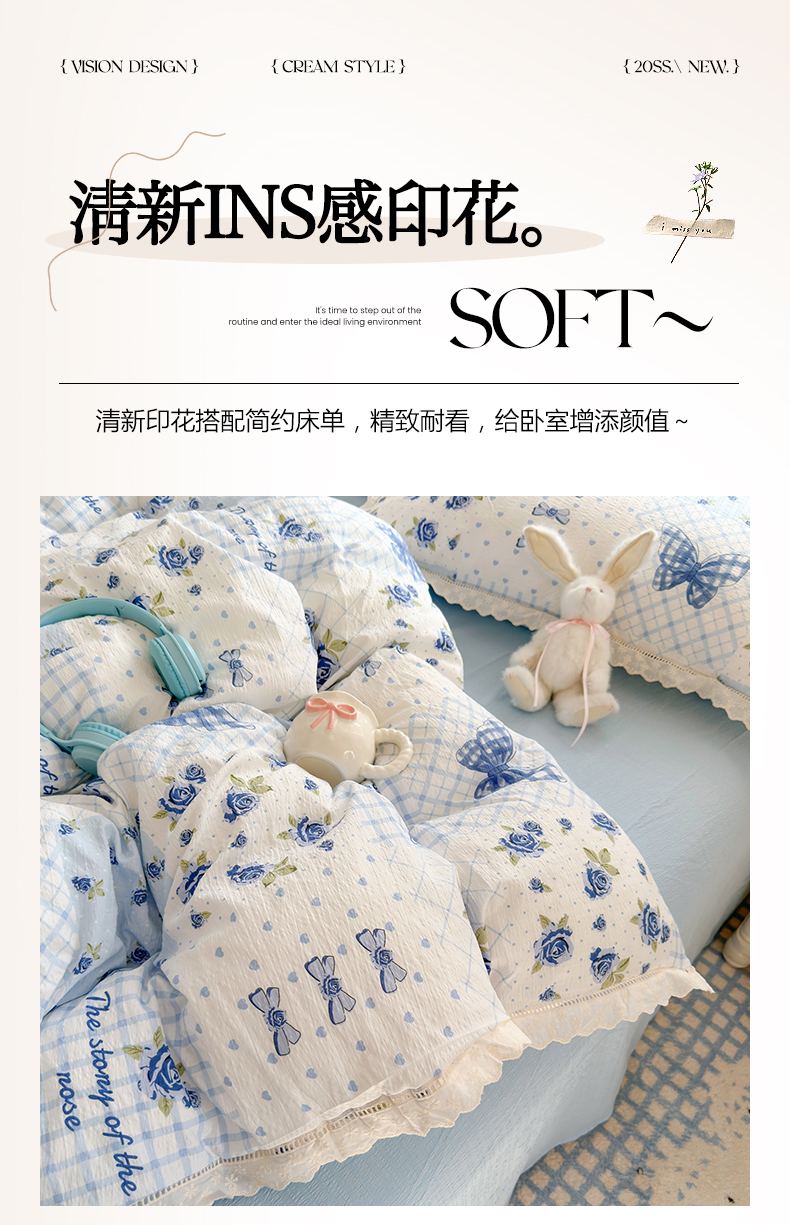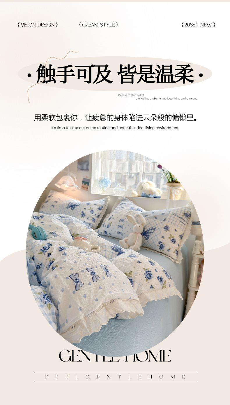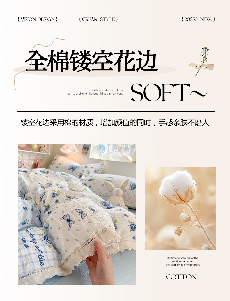 当前位置: 91家纺网 > 商品网购 > 床品套件 > 四件套 > 双层纱四件套 > 优卡迪家纺馆 2025新款A类全棉镂空花边皱皱棉双层纱四件套 蓝玫之约