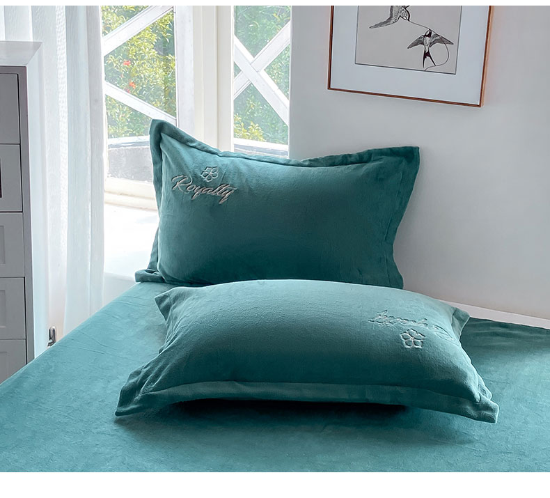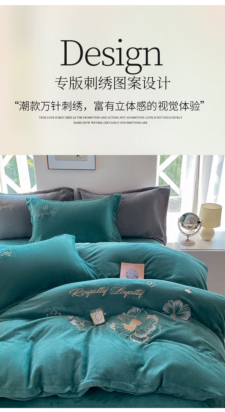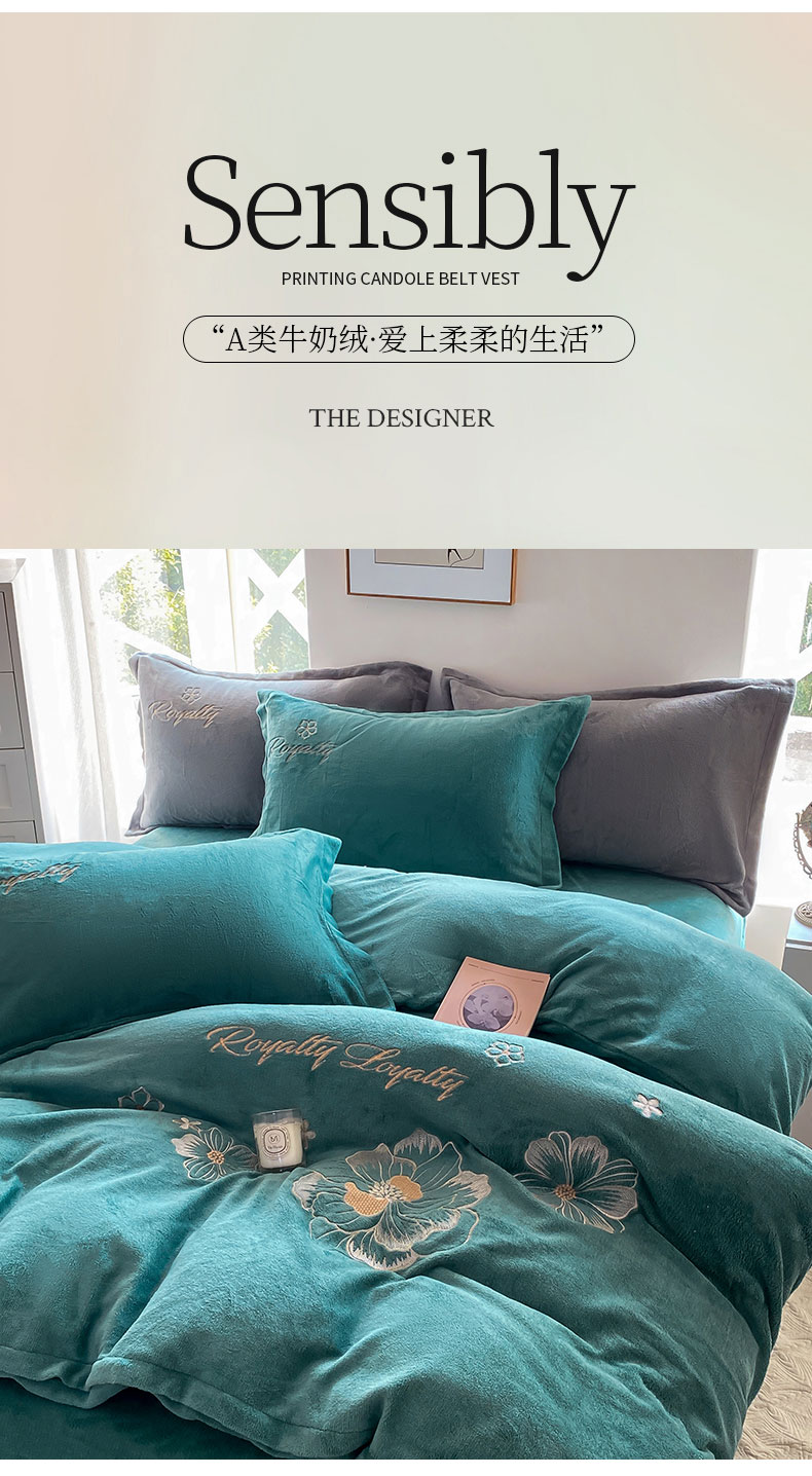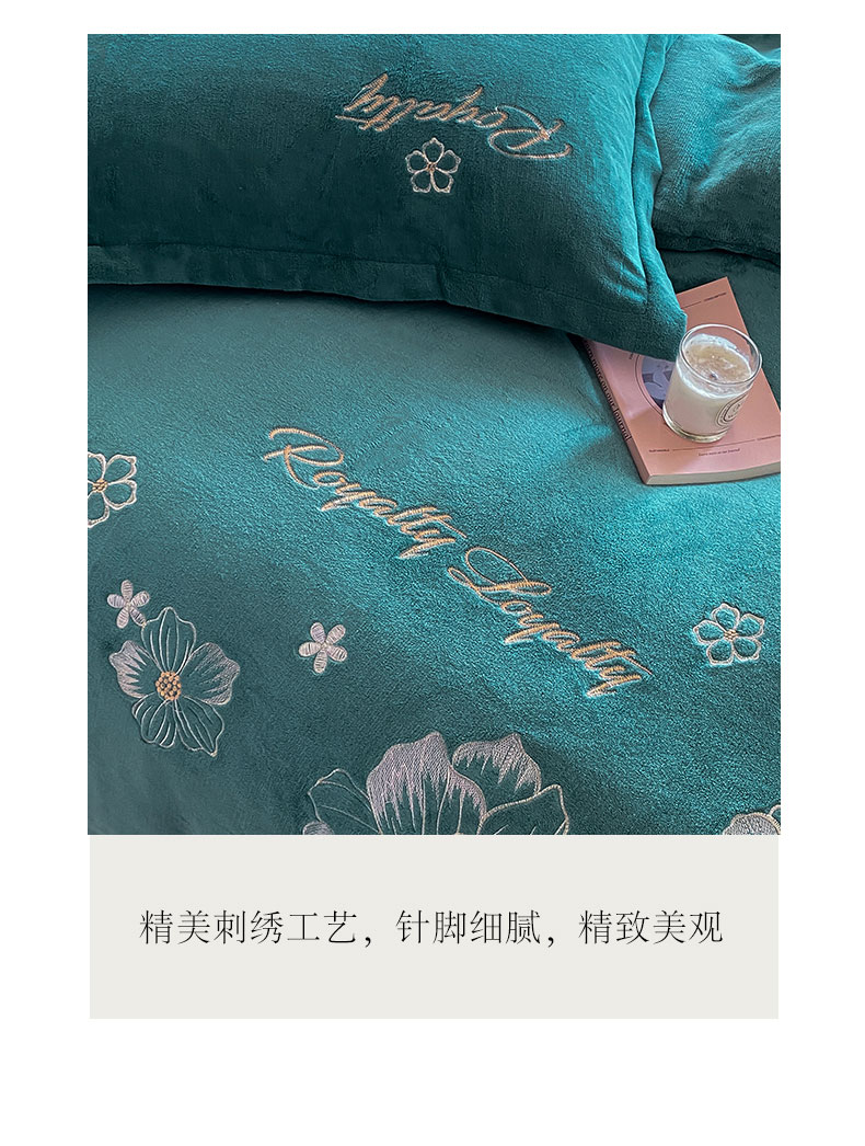 商品名称:悦织湾家纺 2025新款绣花200克重牛奶绒四件套刺绣3.5万针7斤重高密加厚保暖跨境专供外贸出口电商热销款 花语-墨绿