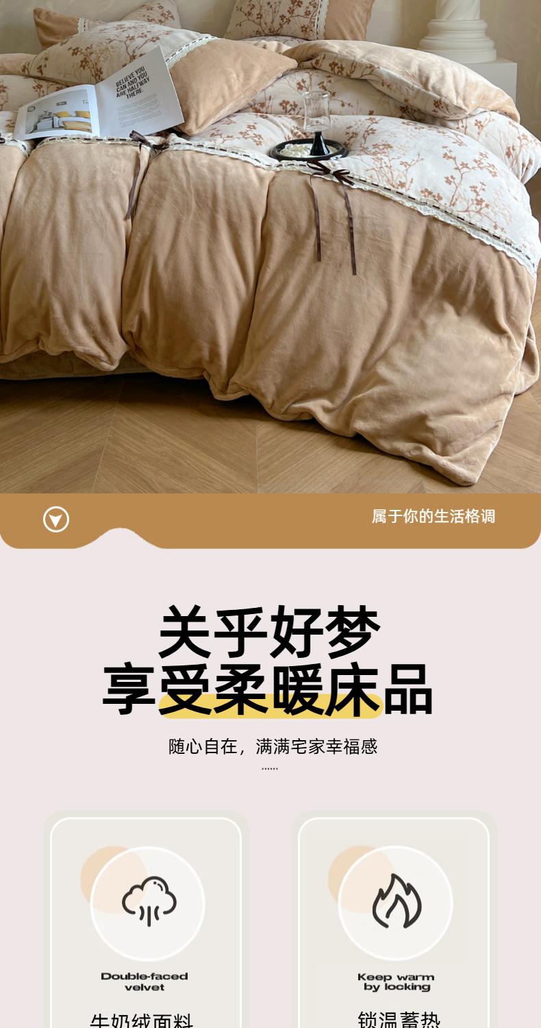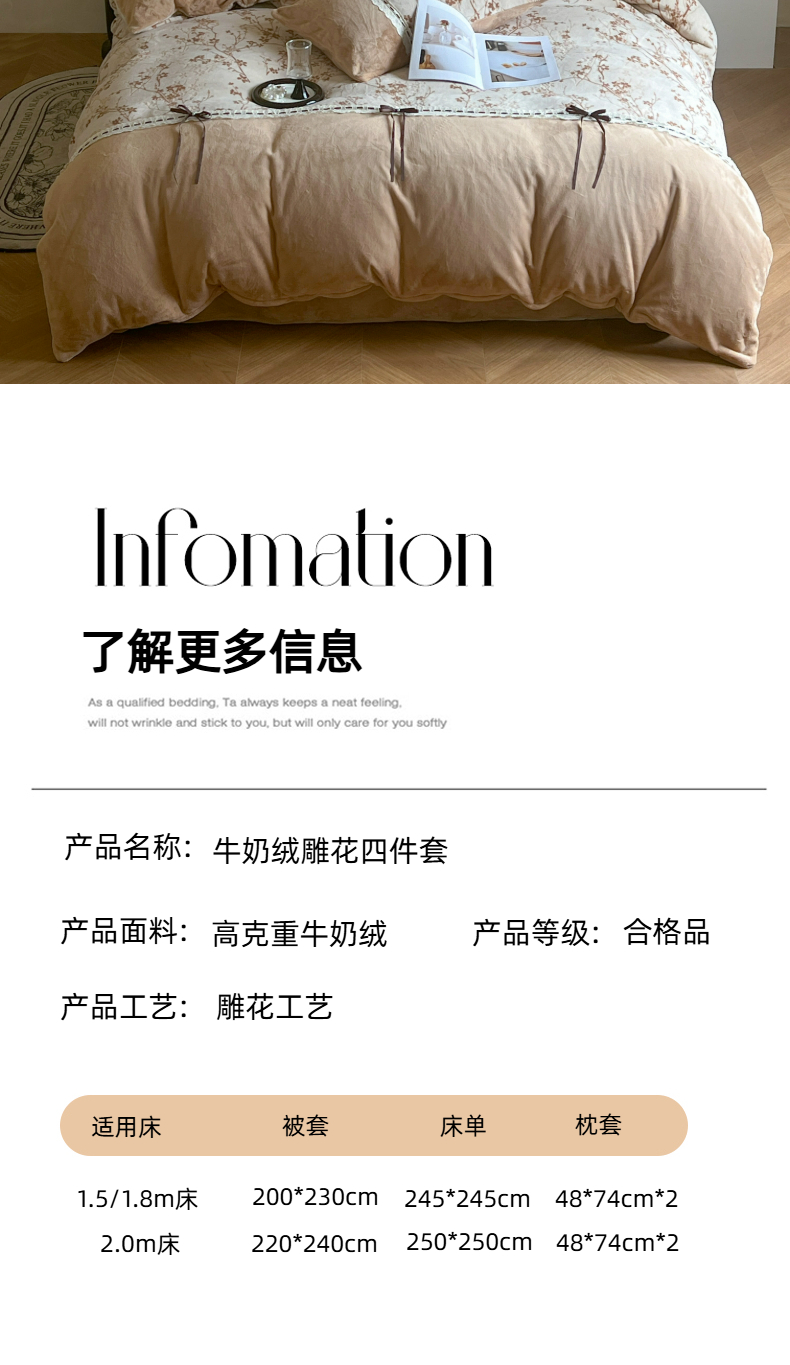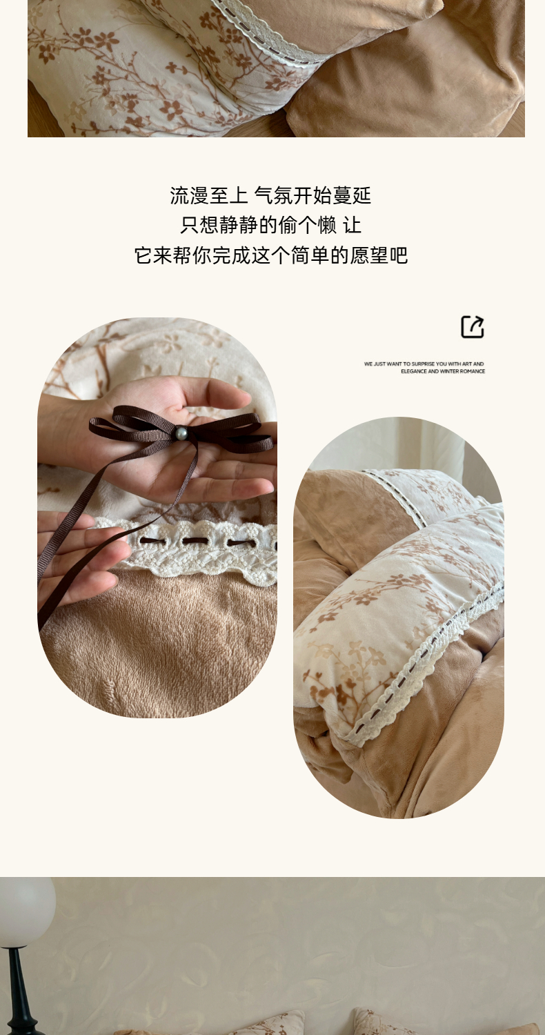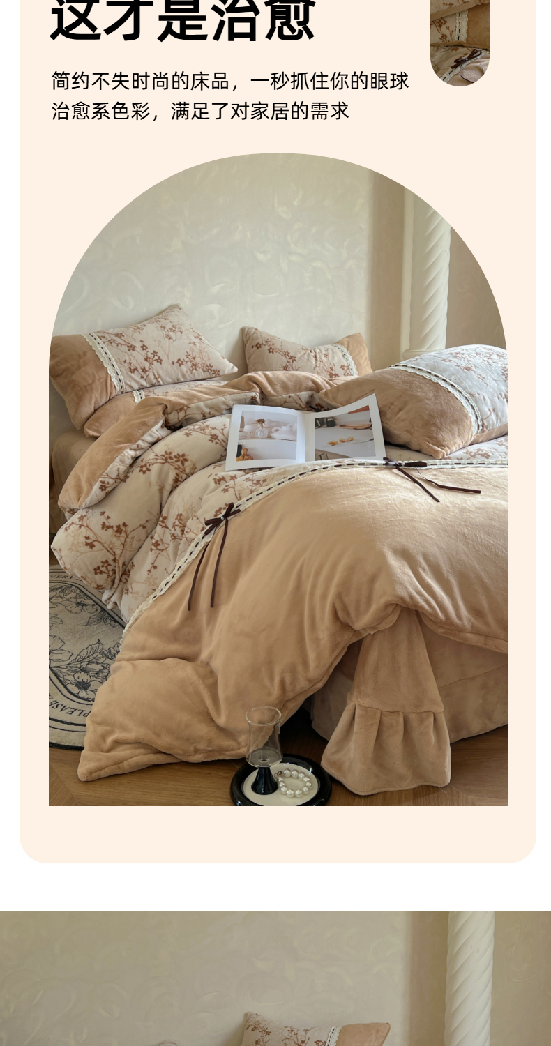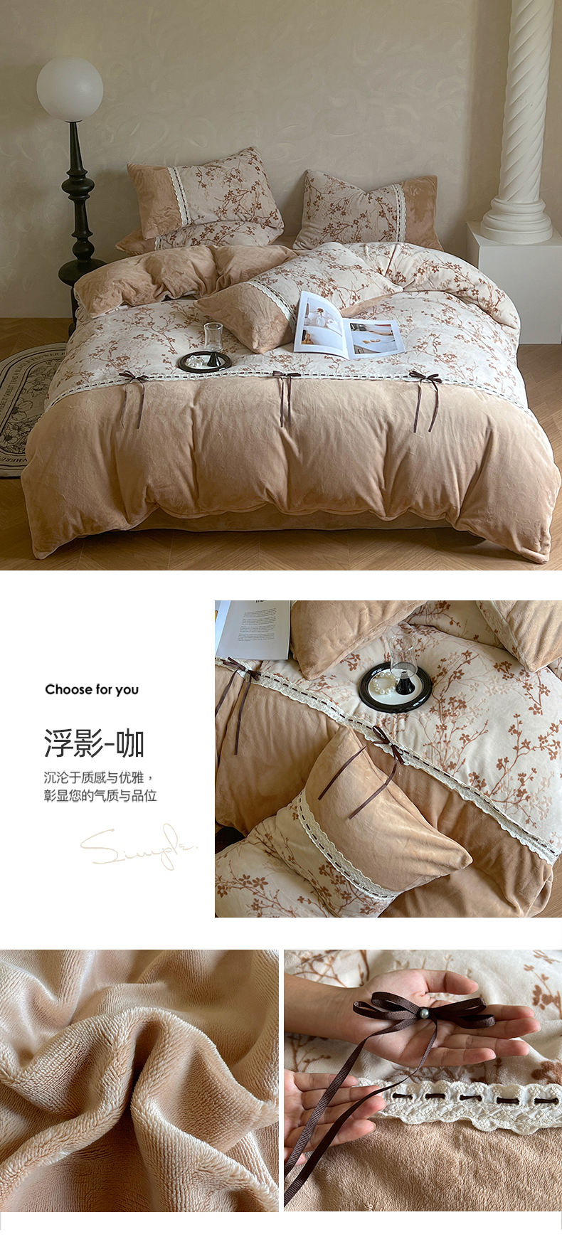 当前位置: 91家纺网 > 商品网购 > 床品套件 > 四件套 > 牛奶绒四件套 > 昊川家纺 2025新款牛奶绒雕花绒轻奢花边蝴蝶结拼接款四件套 浮影-咖