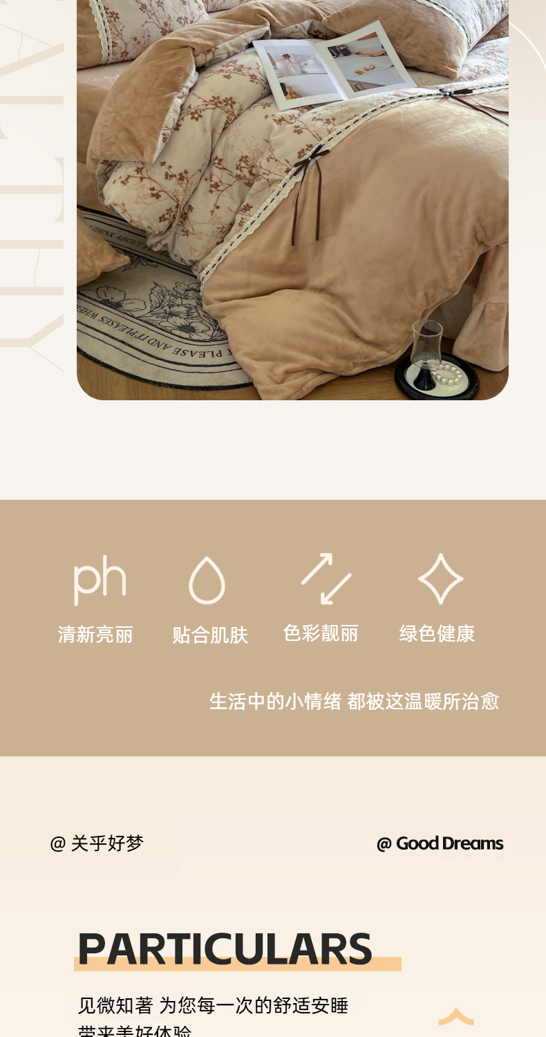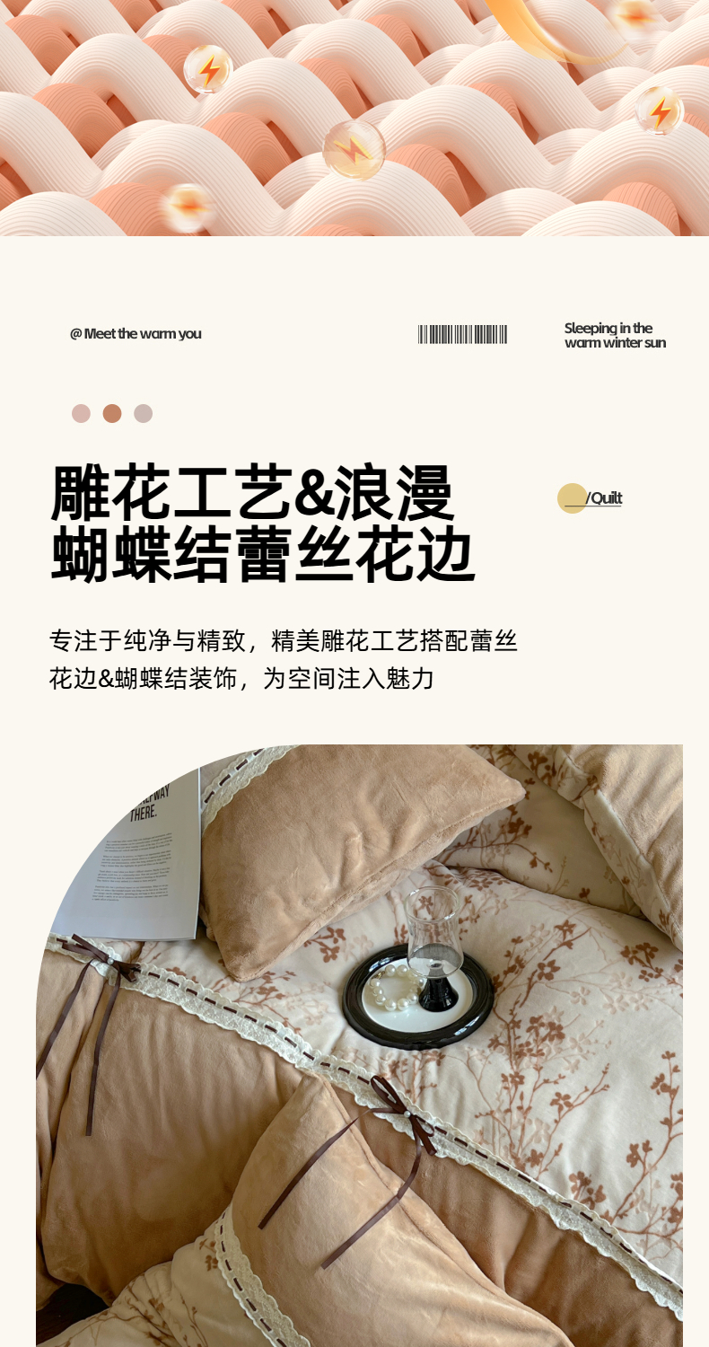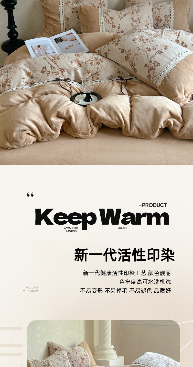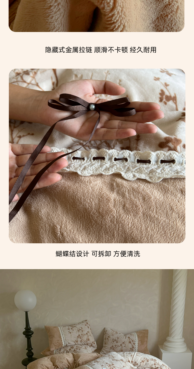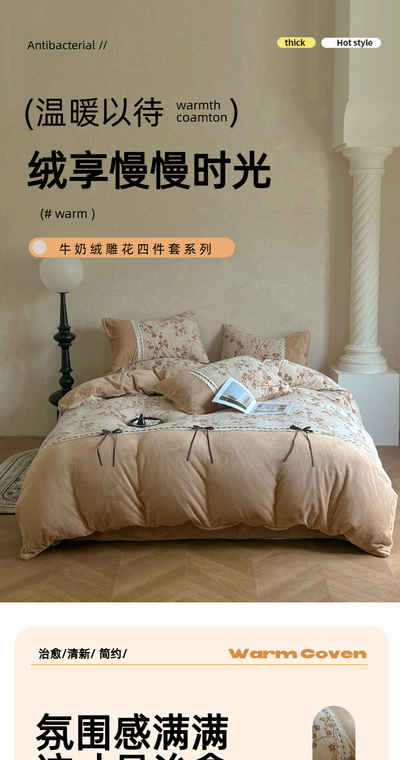 当前位置: 91家纺网 > 商品网购 > 床品套件 > 四件套 > 牛奶绒四件套 > 昊川家纺 2025新款牛奶绒雕花绒轻奢花边蝴蝶结拼接款四件套 浮影-咖