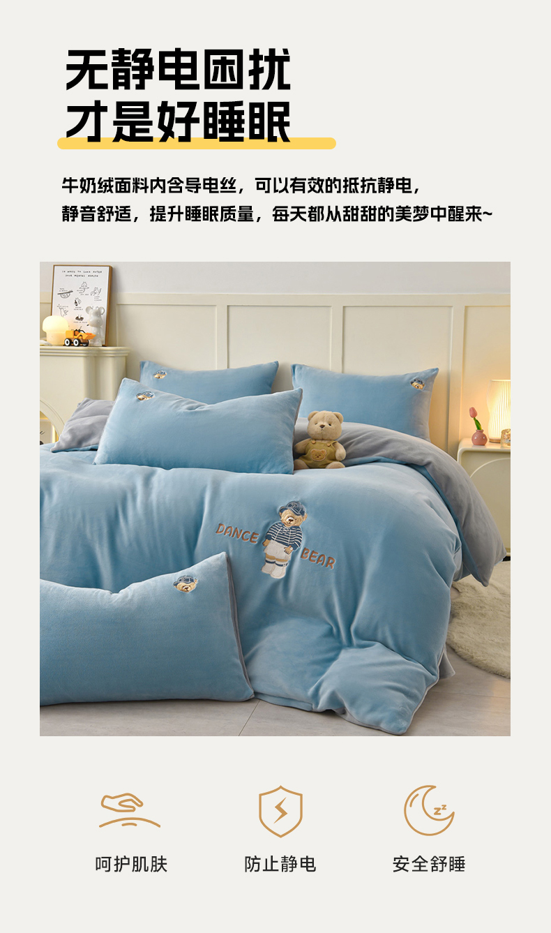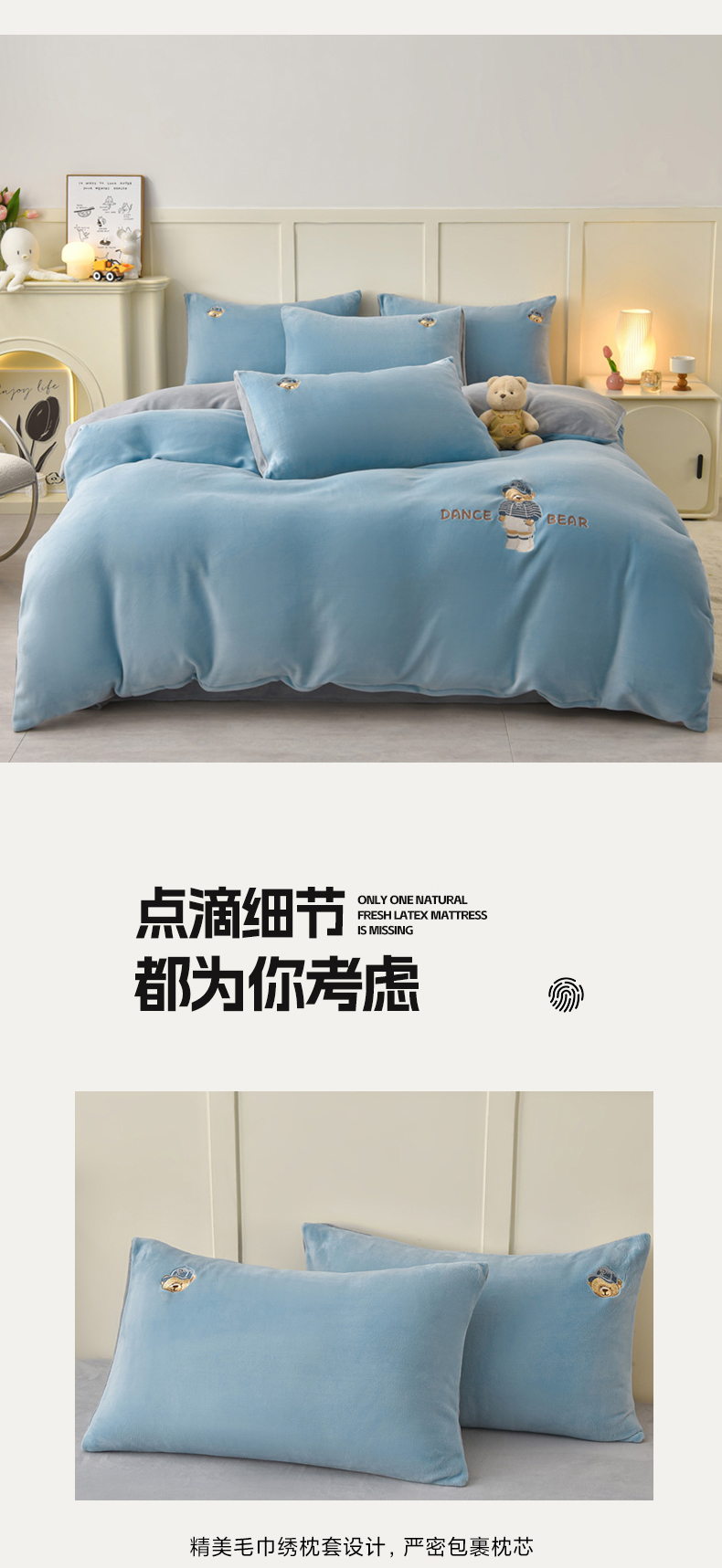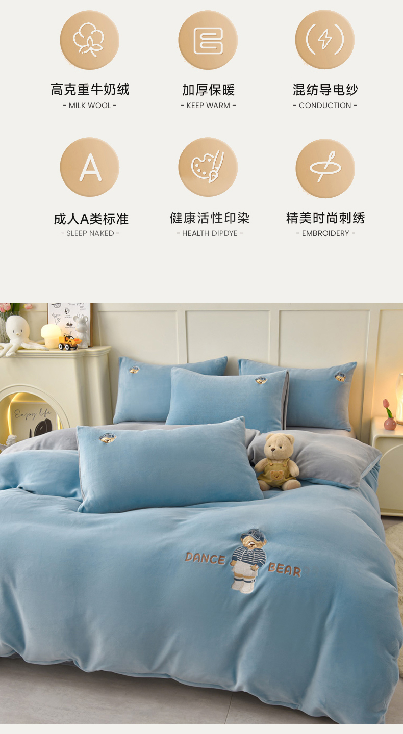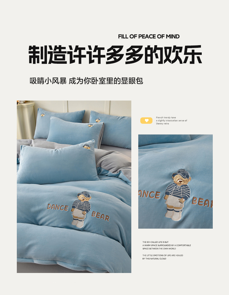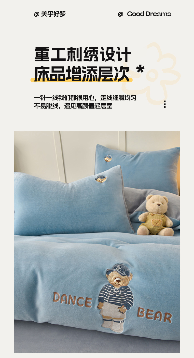 商品名称:牵依 2025新款高克重绣花牛奶绒四件套 可可熊-宾利蓝