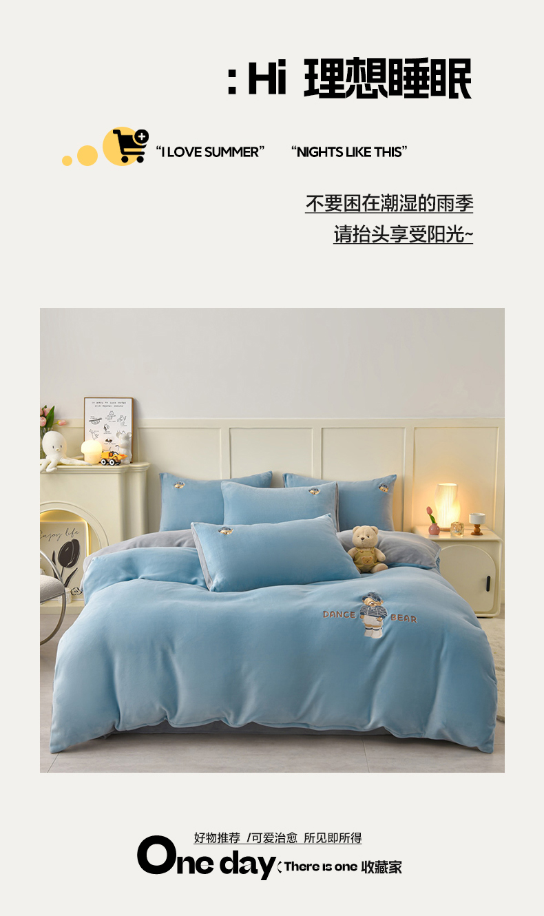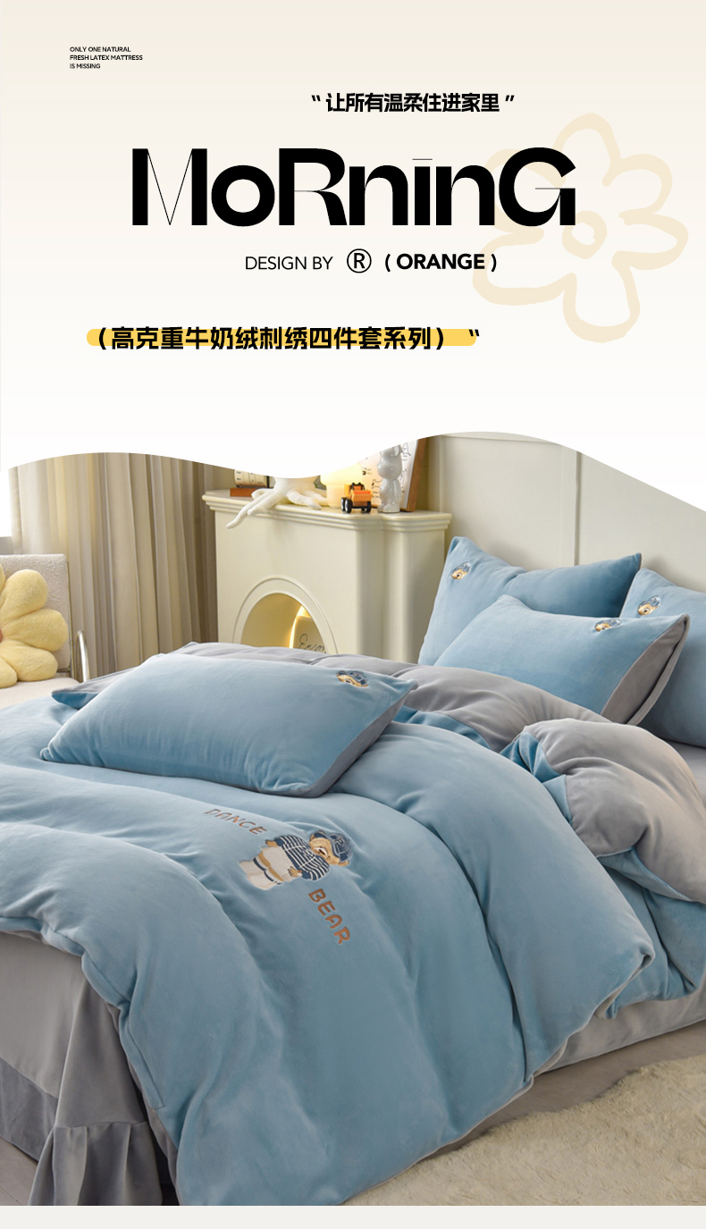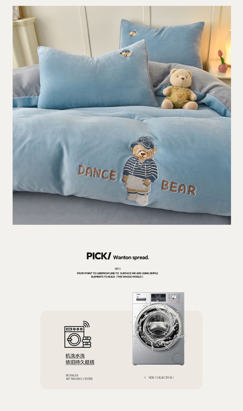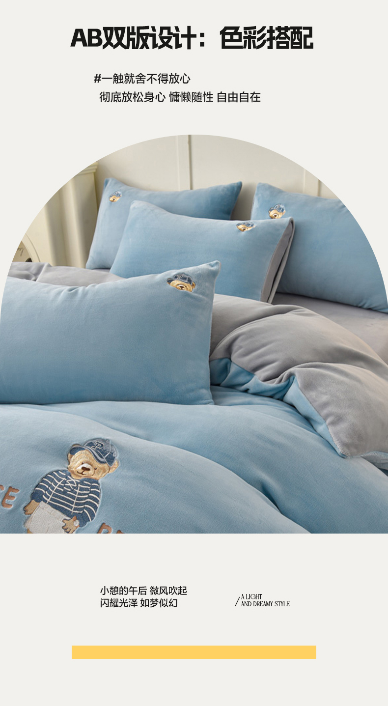 商品名称:牵依 2025新款高克重绣花牛奶绒四件套 可可熊-宾利蓝