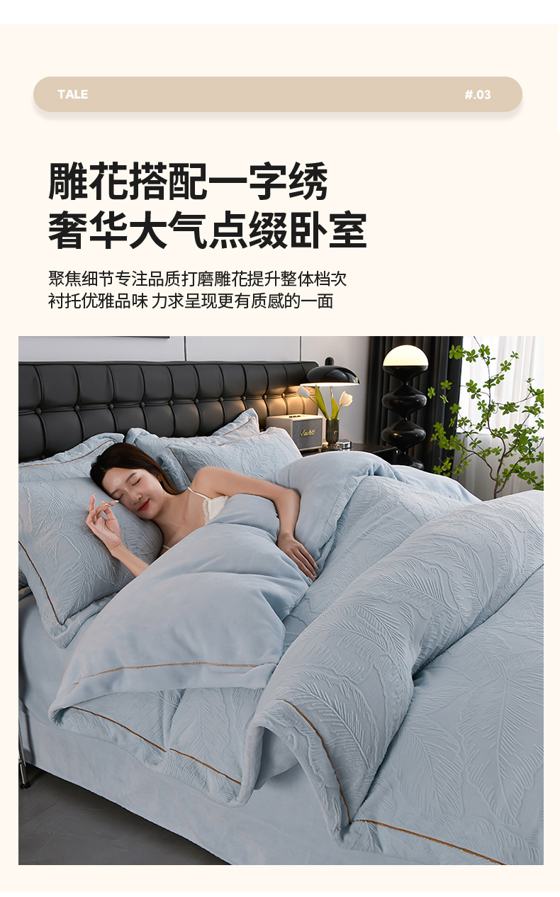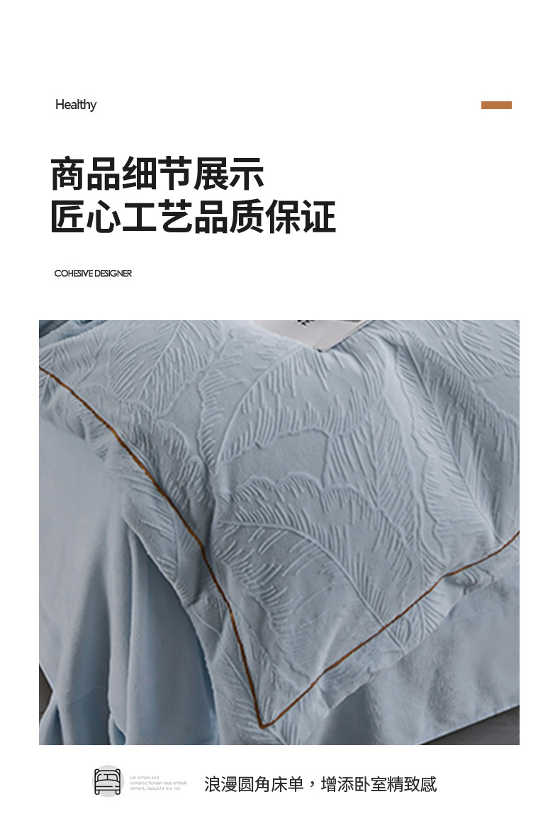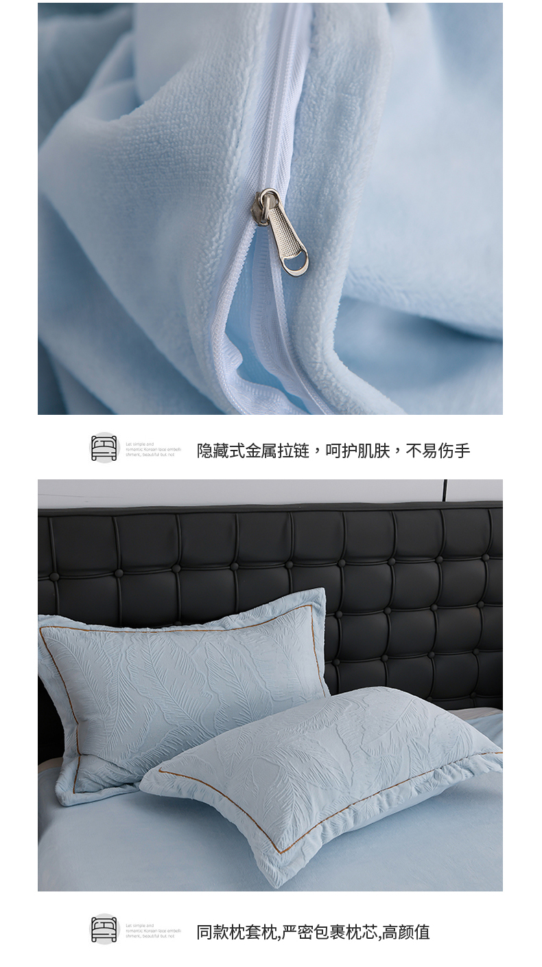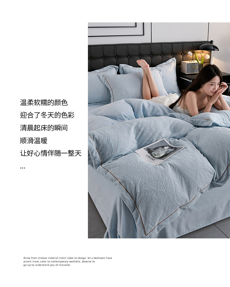 商品名称:苏迪网销供货 2025新款牛奶绒四件套A类高克重全消光雕花一字绣工艺款 芭蕉叶-湖小蓝