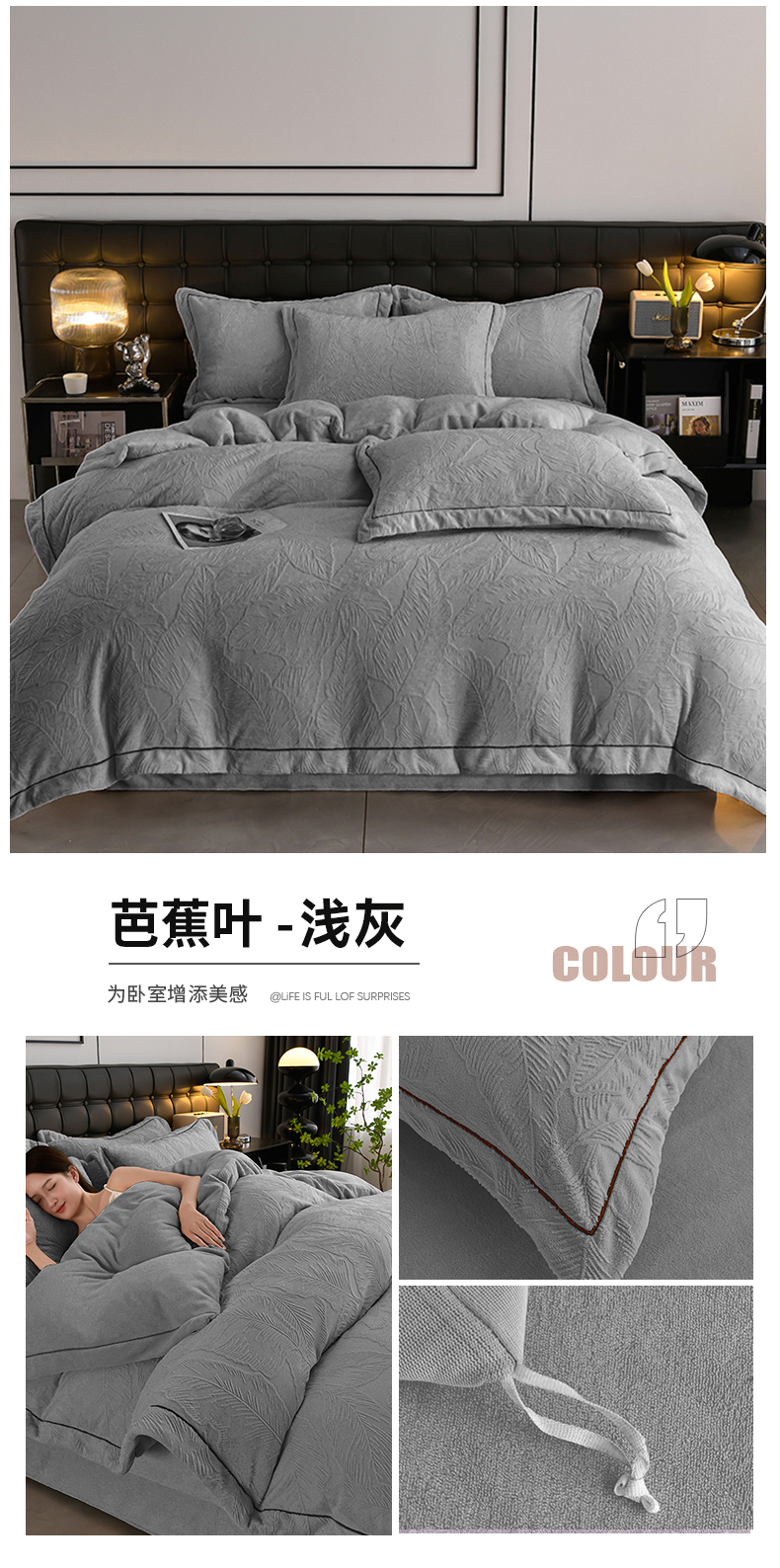 苏迪网销供货 2025新款牛奶绒四件套A类高克重全消光雕花一字绣工艺款 芭蕉叶-湖小蓝