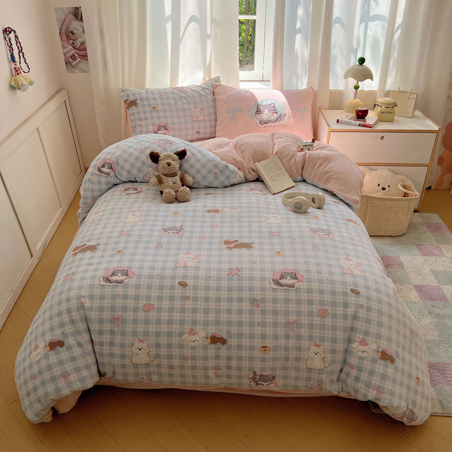 (总)桃喜 2026新款全棉混搭卡通印花学生三件套四件套,费尔岛蝴蝶结小狗,费尔岛小熊,可爱动物团,可爱小兔子,星星猫咪