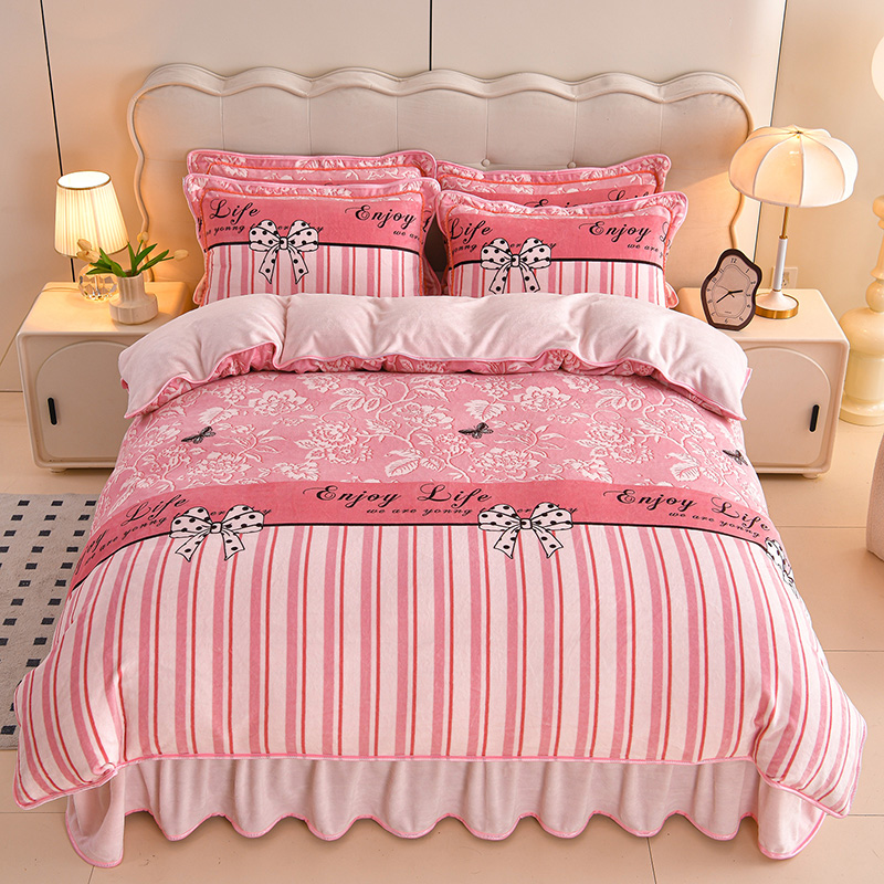 当前位置: 91家纺网 > 商品网购 > 床品套件 > 四件套 > 牛奶绒四件套 > 德比尔斯 2025新款牛奶绒床裙四件套8-9斤法莱绒直播爆款日产2万套 粉色蝴蝶结