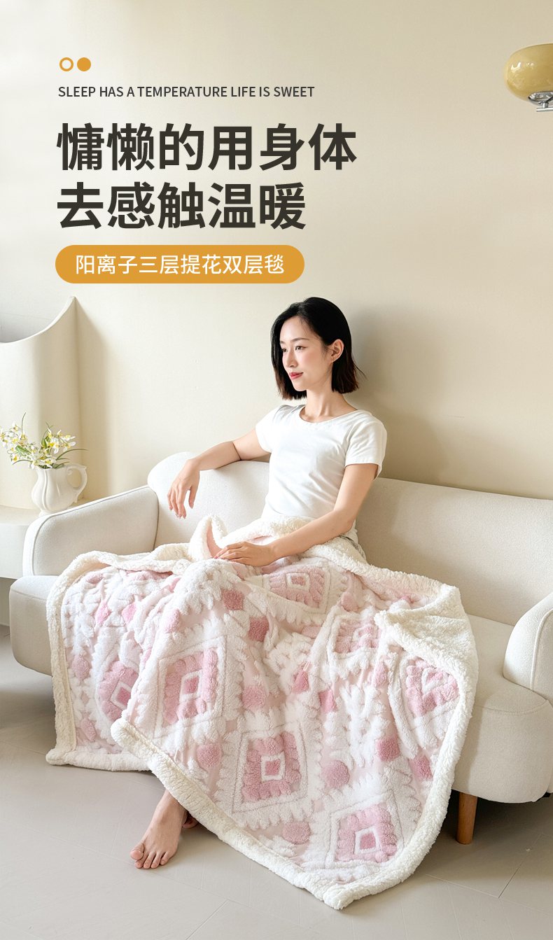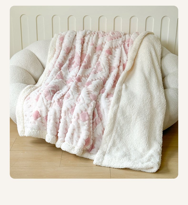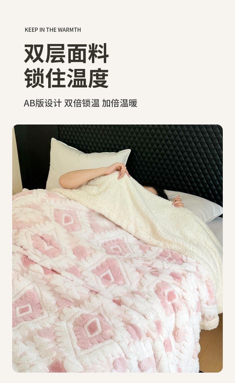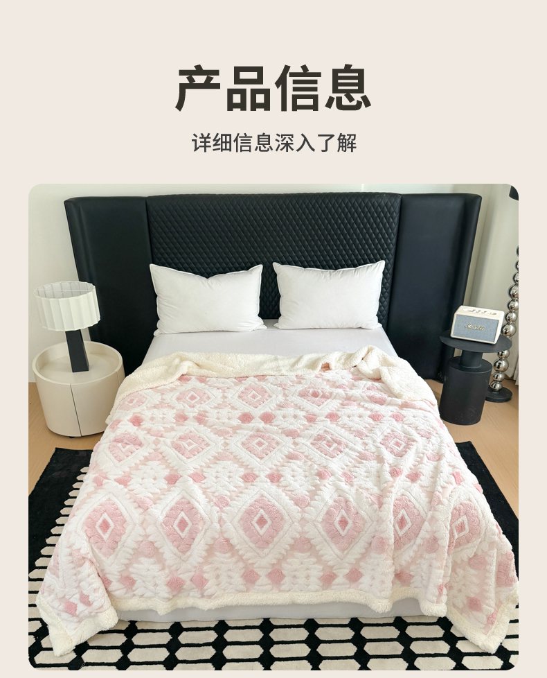 商品名称:梵克保罗 2025新款轻奢阳离子提花镂空塔芙绒羊羔绒保暖午睡双层毛毯办公室盖毯 粉色