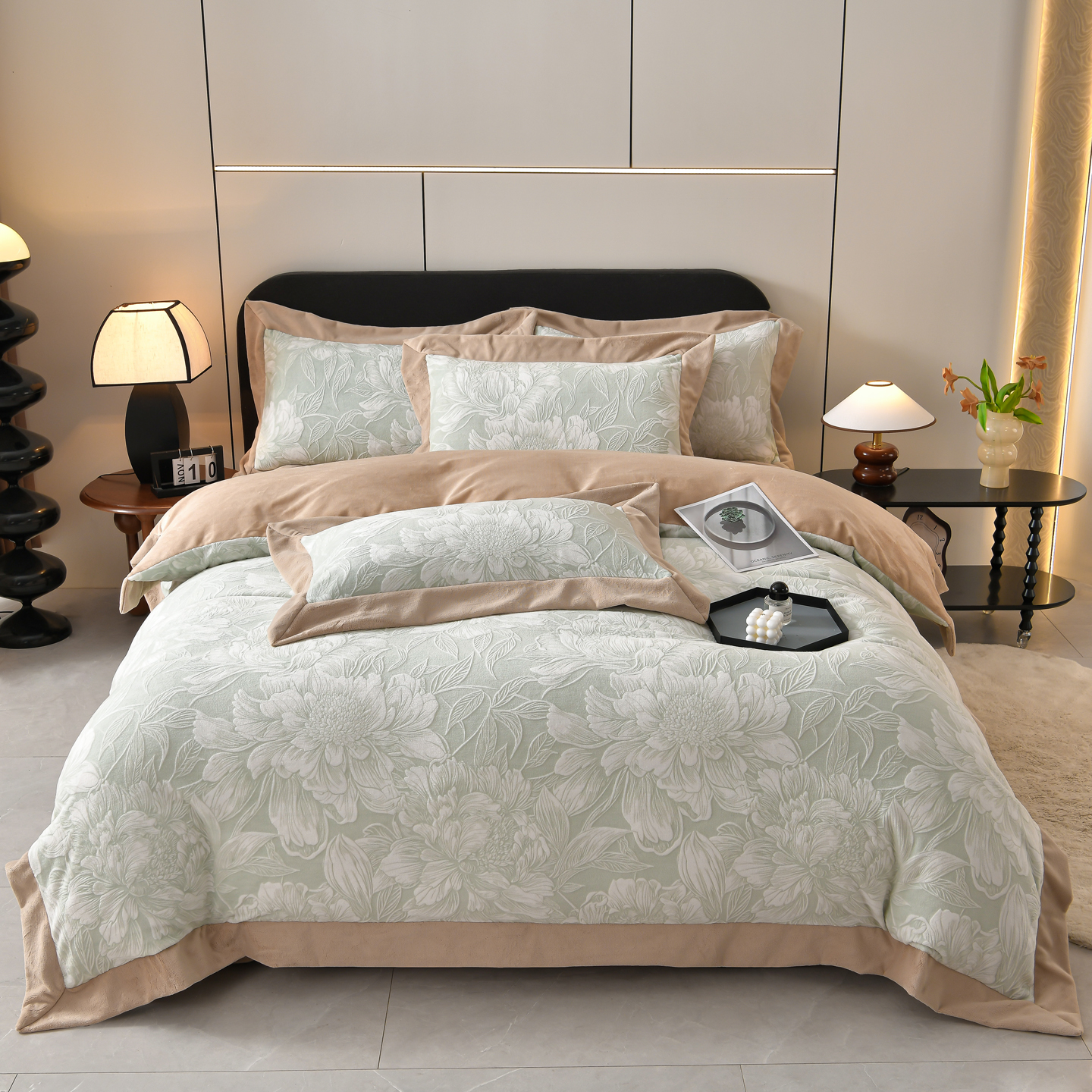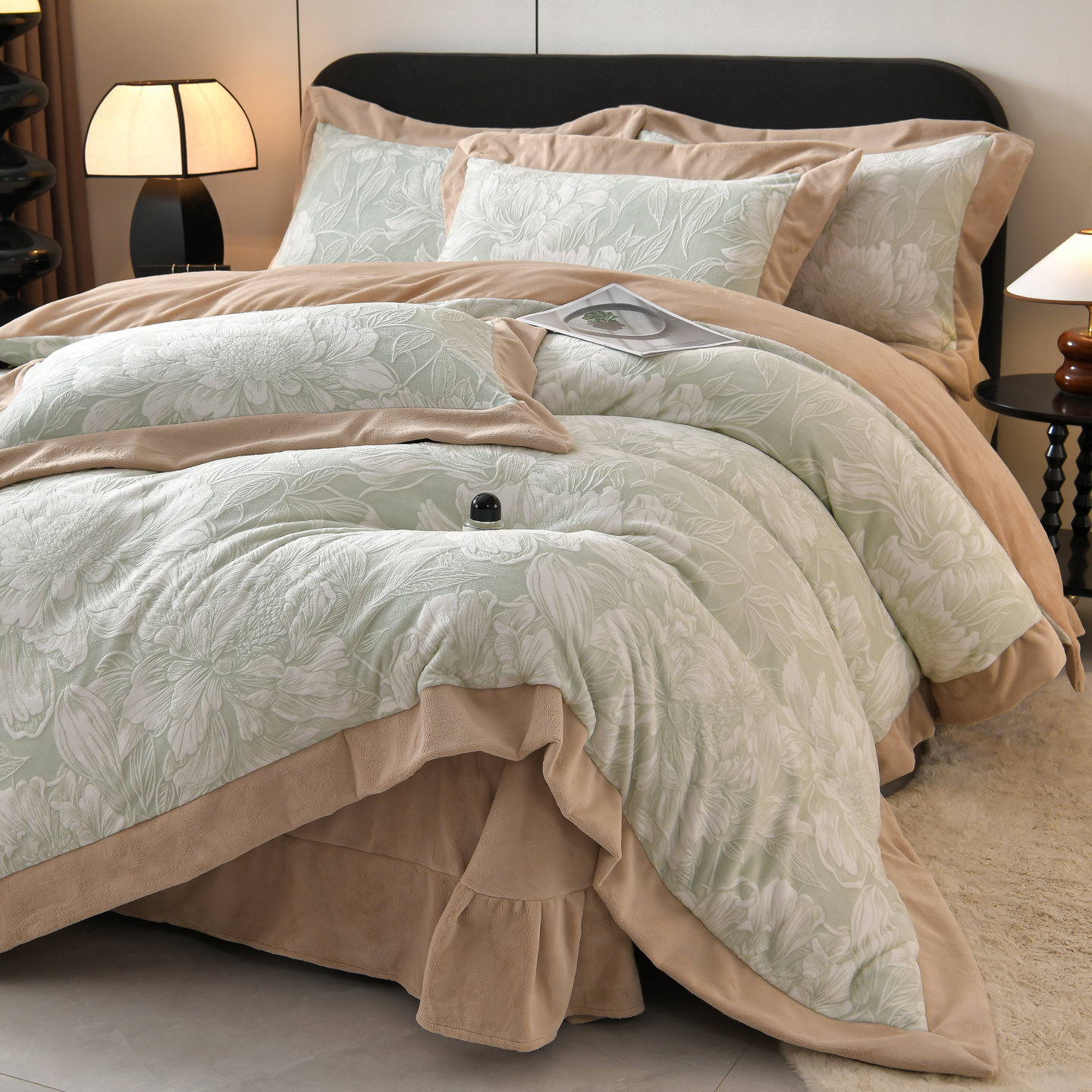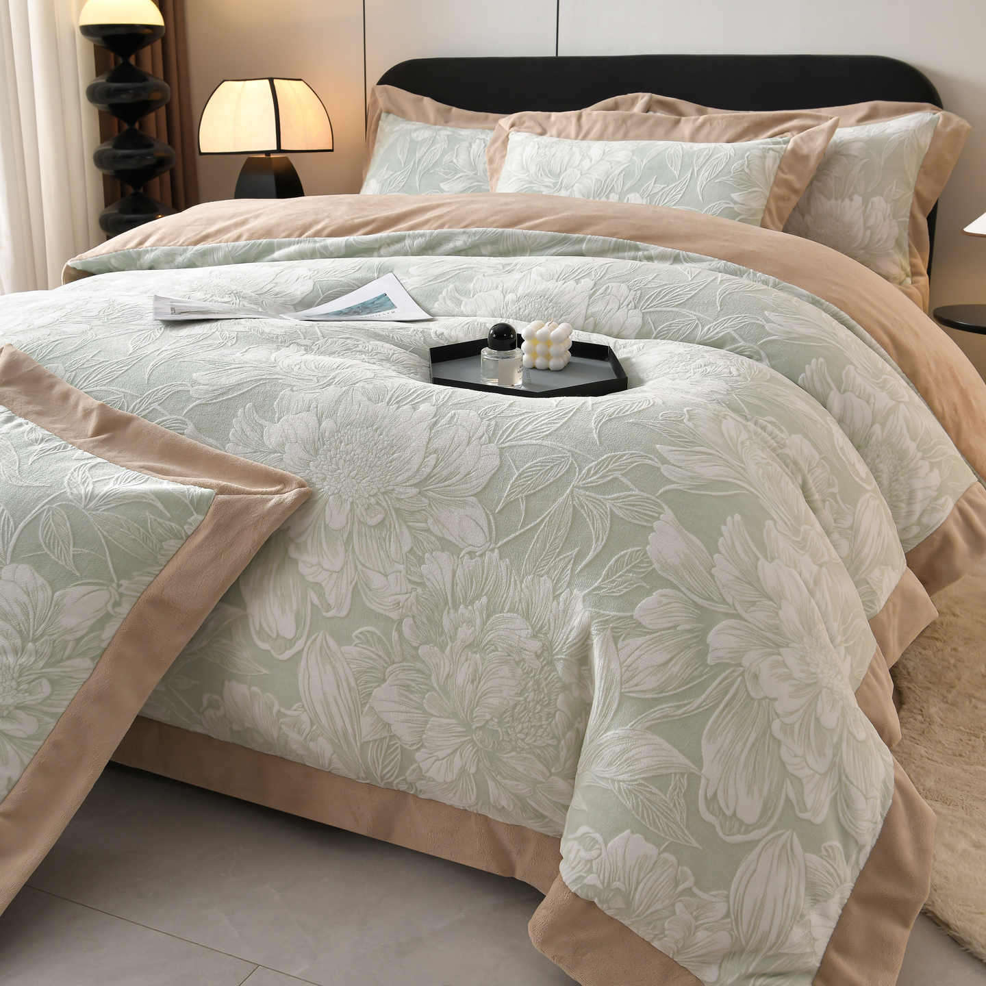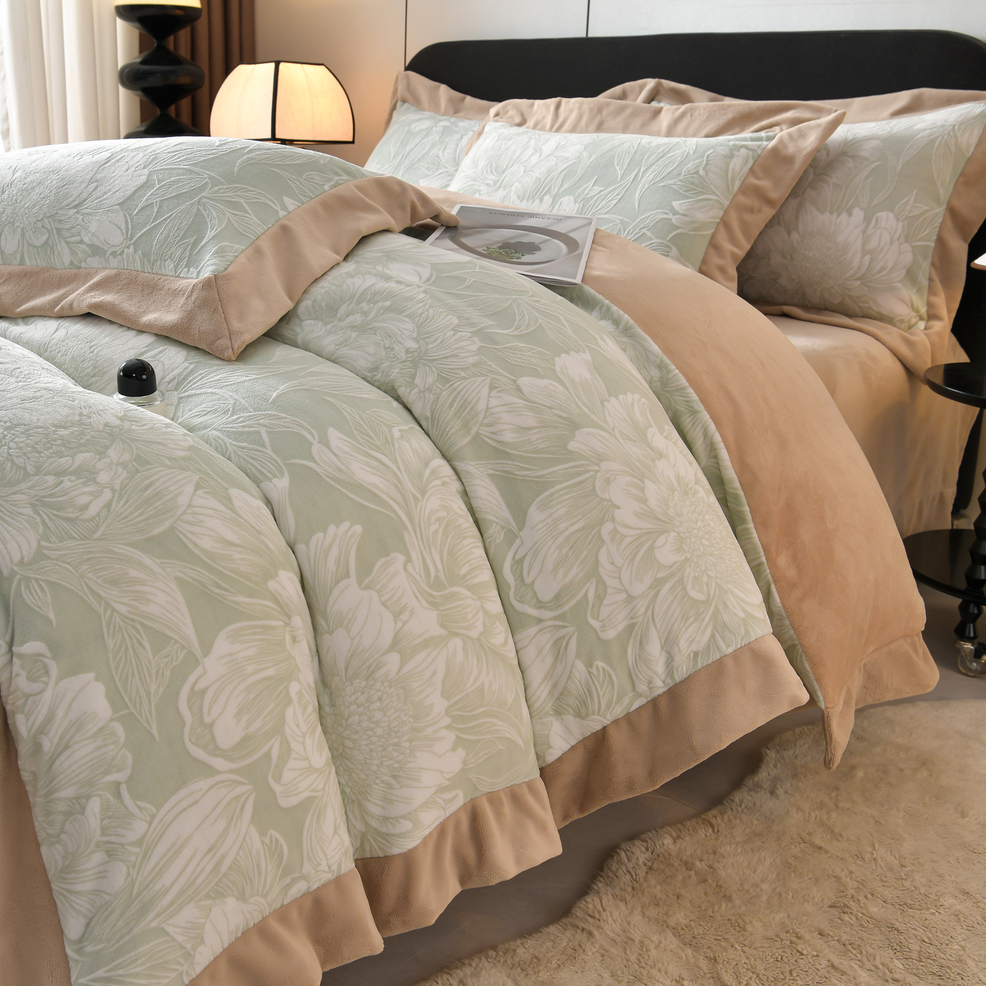 商品名称:湘雪家居 2025新款高克重雕花牛奶绒四件套 梦娜-浅绿