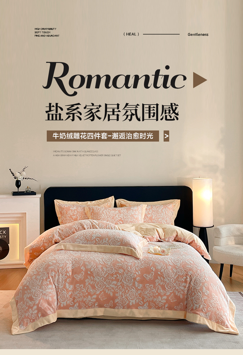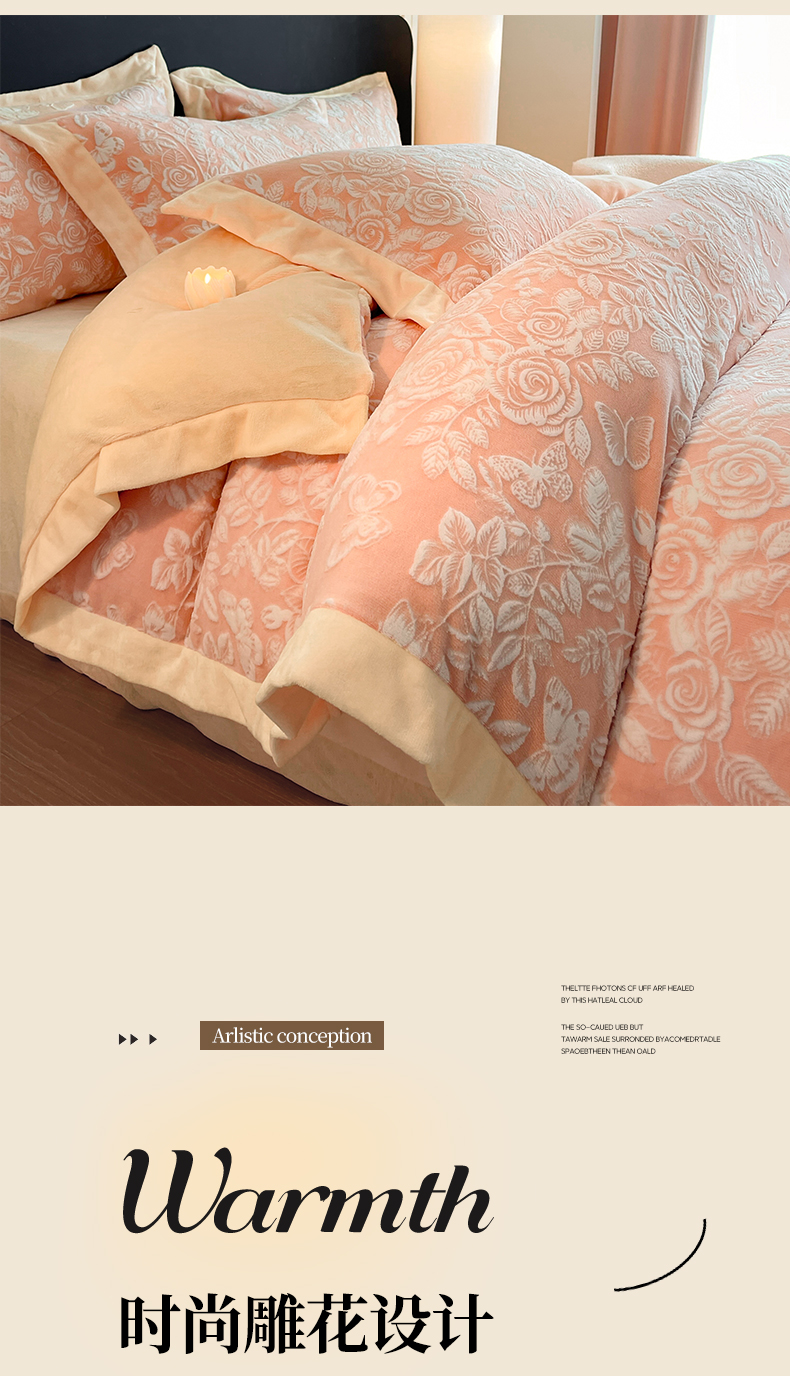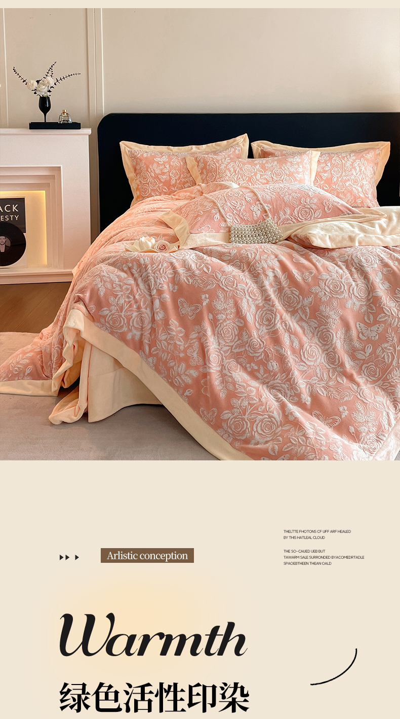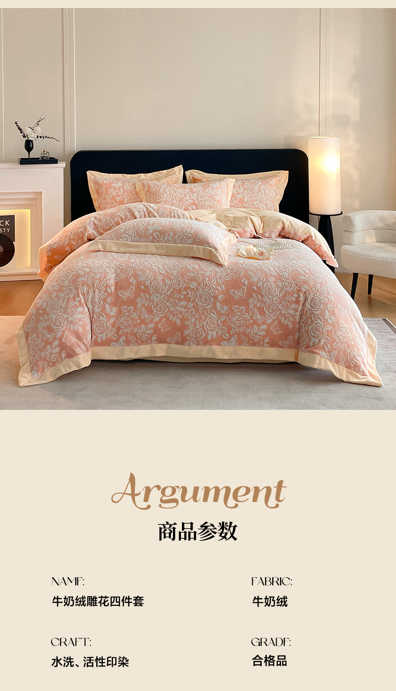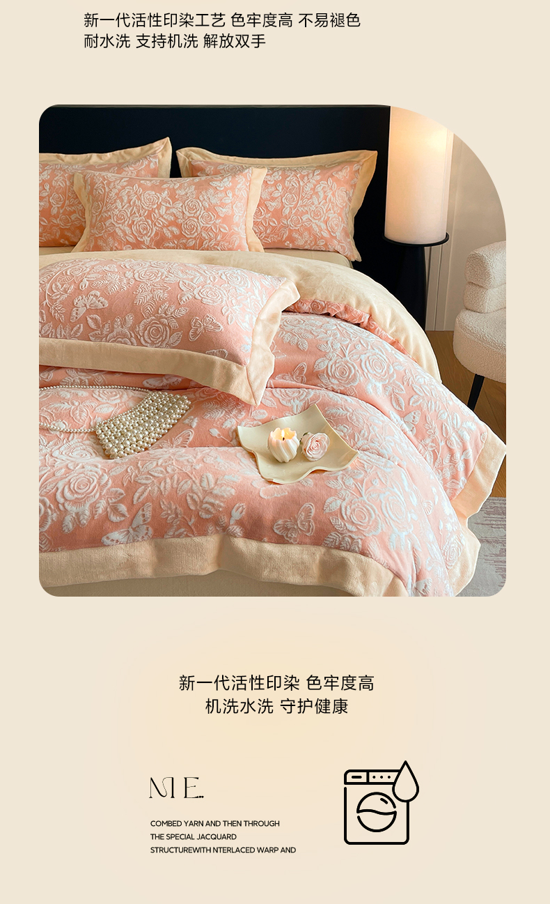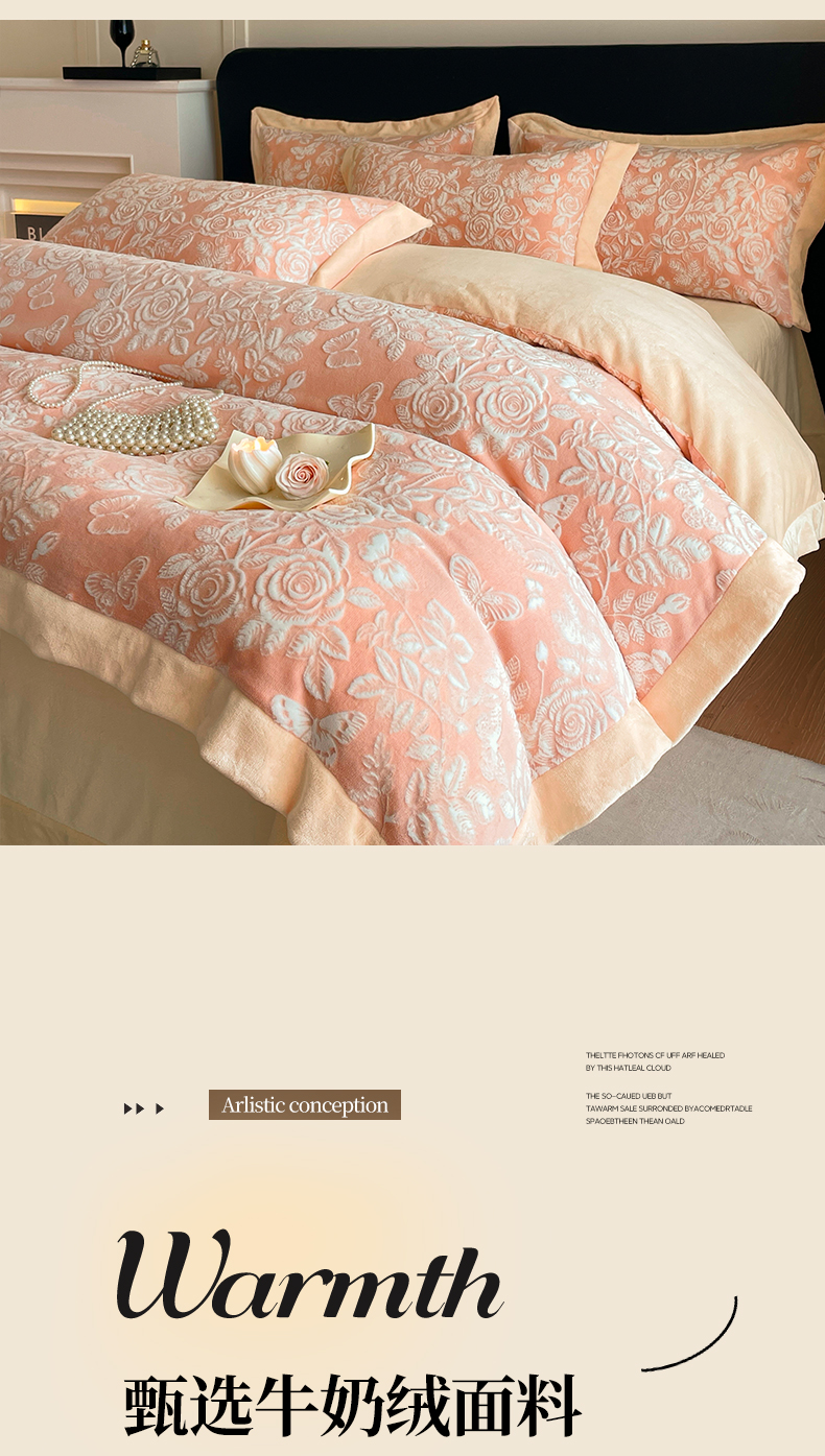 商品名称:民新家纺 2025新款牛奶绒宽包边雕花四件套 永恒之爱-暖粉
