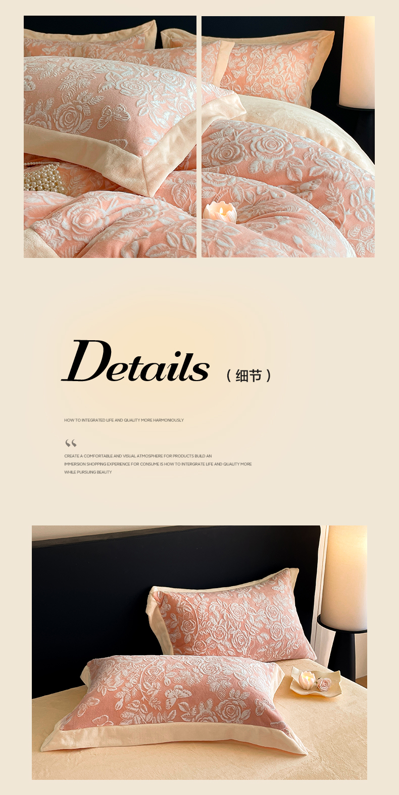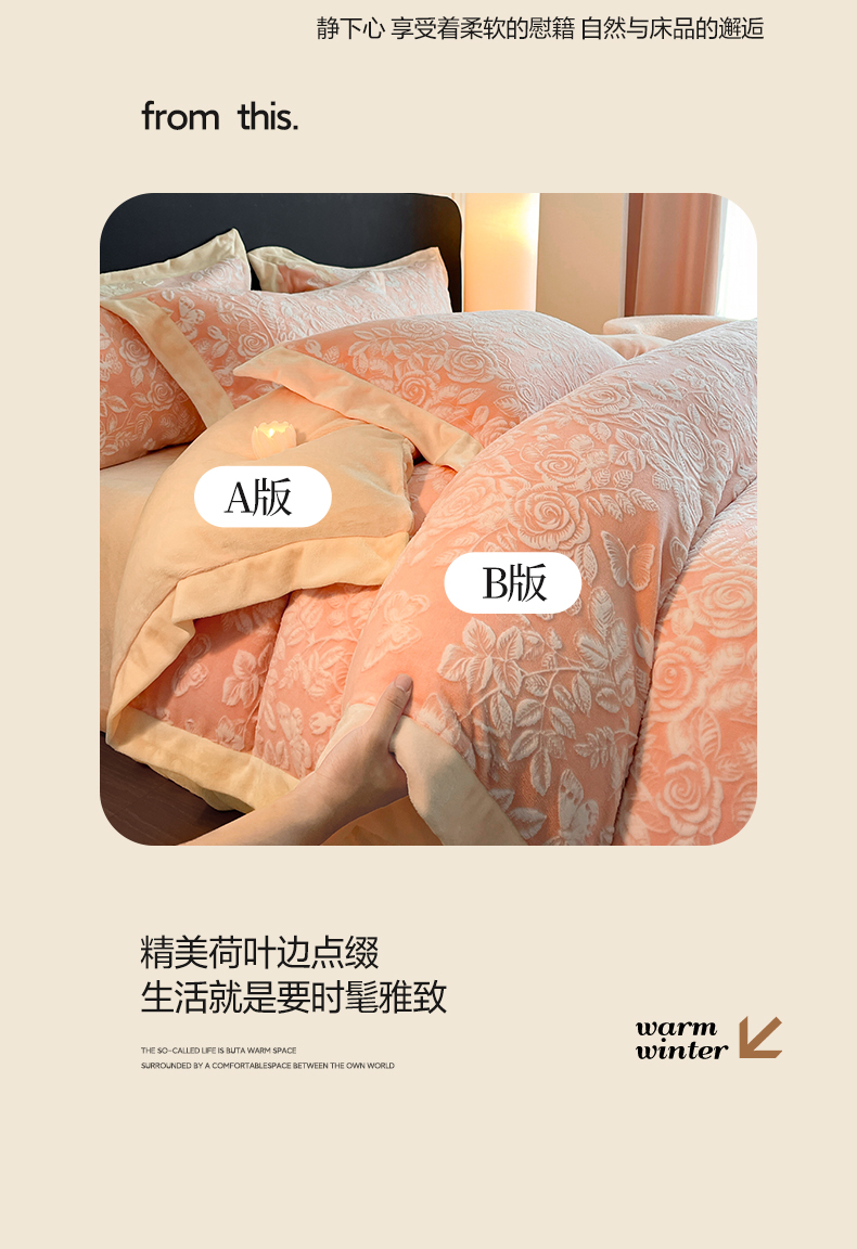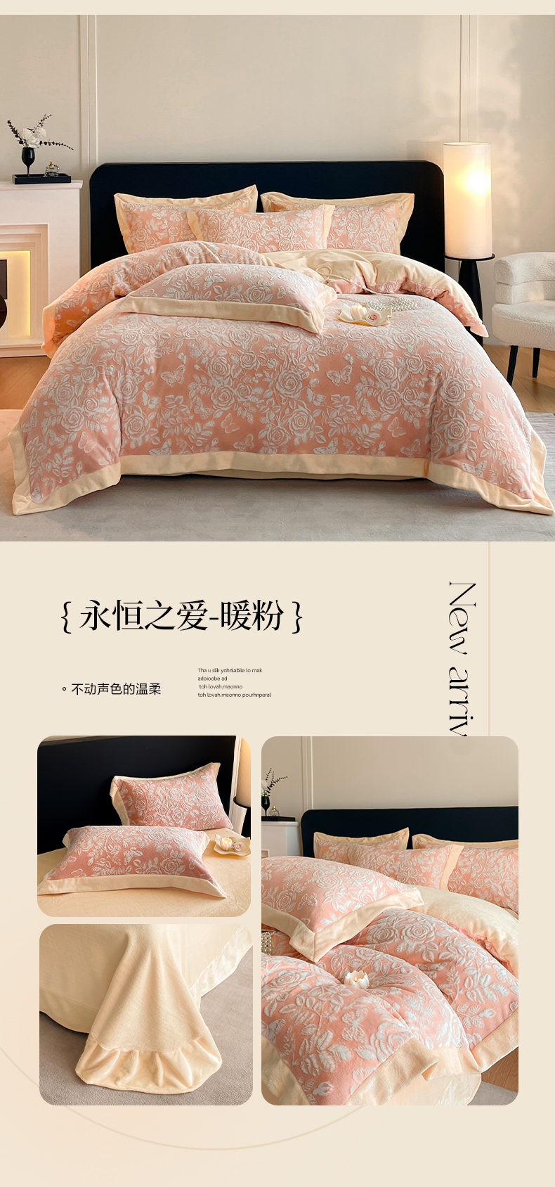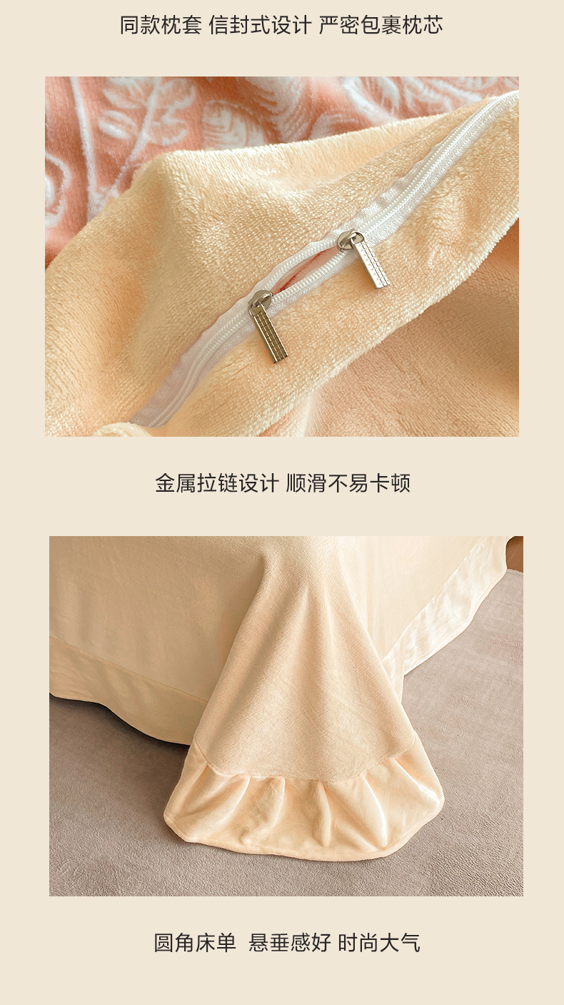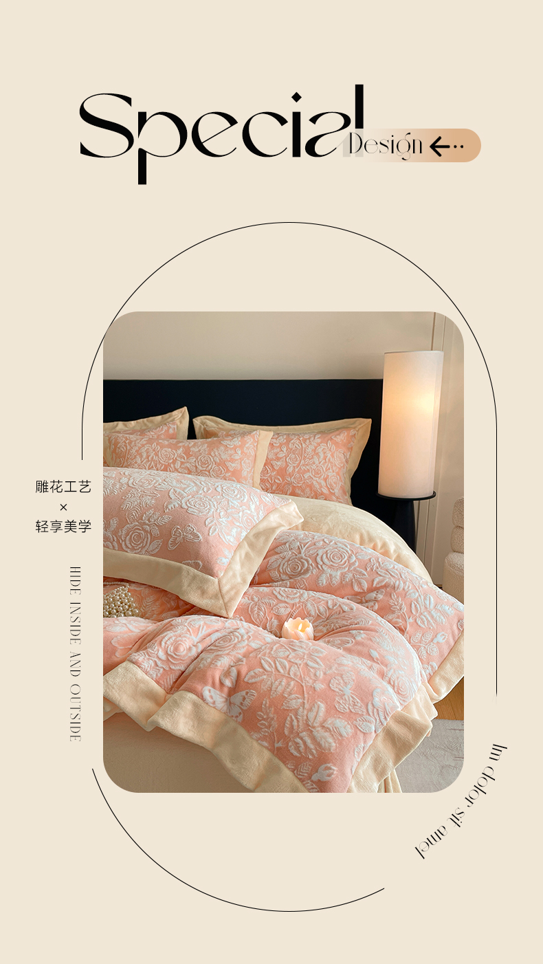 商品名称:民新家纺 2025新款牛奶绒宽包边雕花四件套 永恒之爱-暖粉