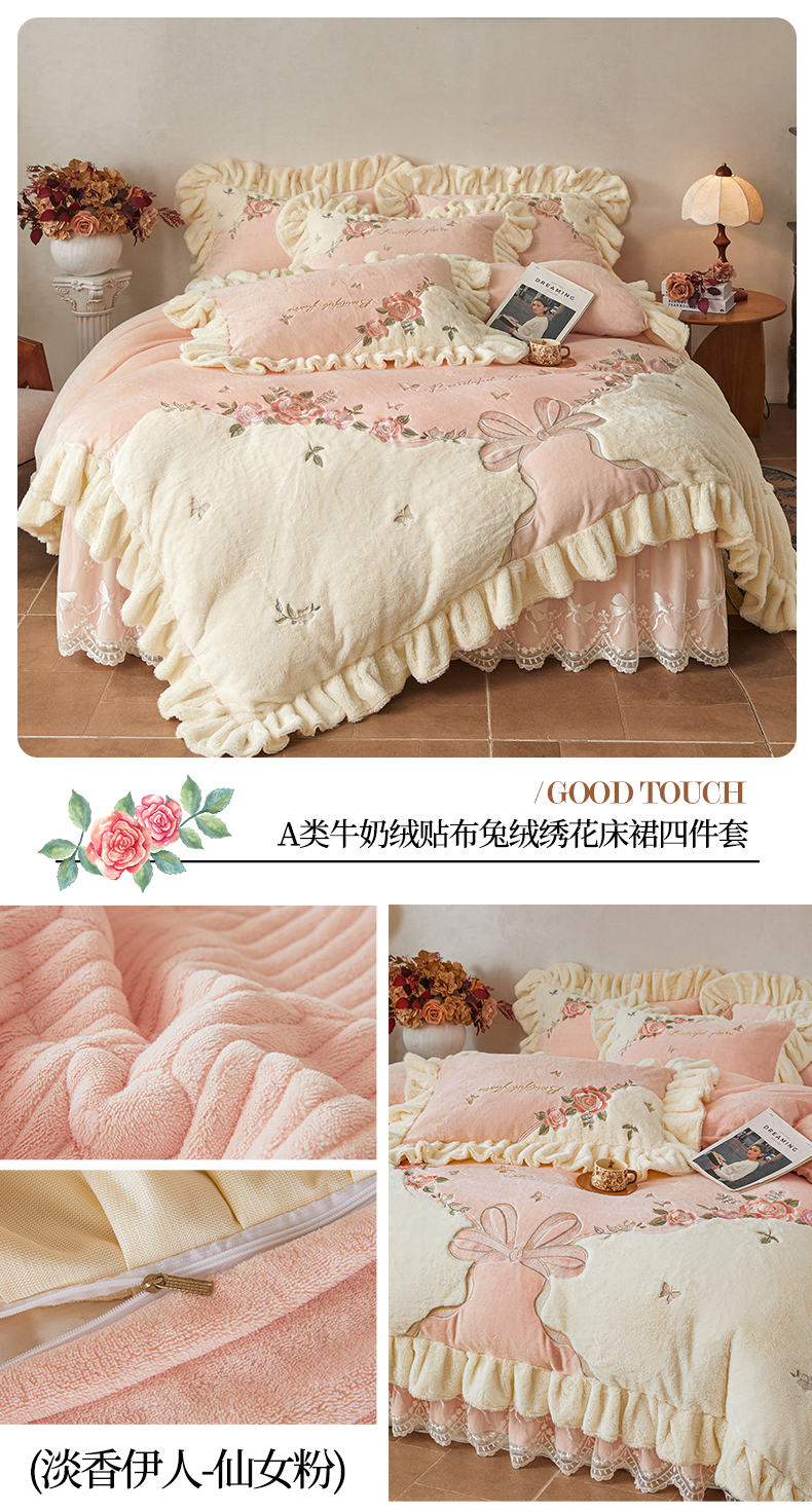 宜凡家纺 2025新款牛奶绒贴布兔绒刺绣床裙四件套--淡香伊人系列 淡香伊人-仙女粉
