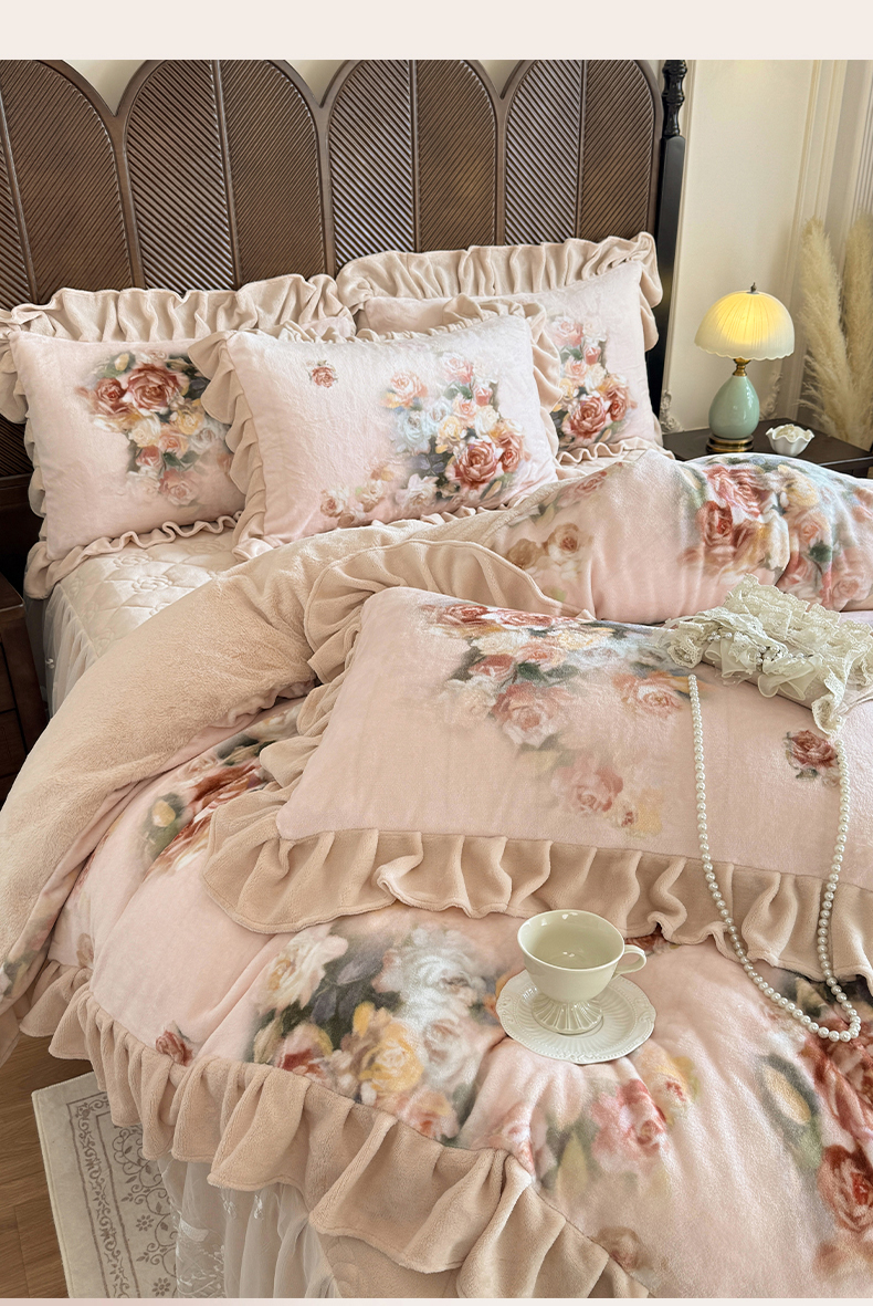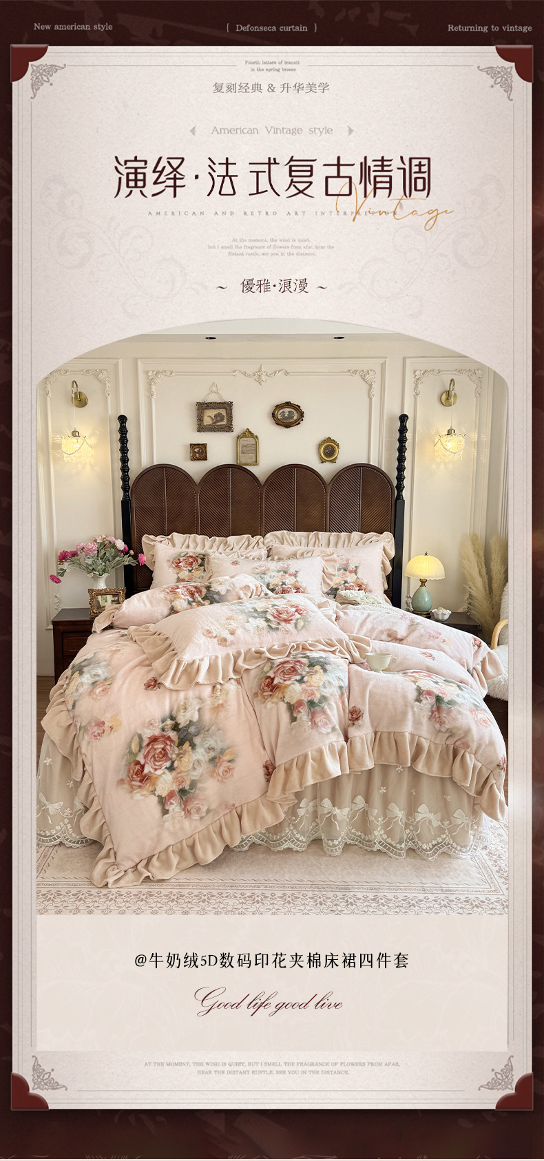 商品名称:宜凡家纺 2025新款牛奶绒5D数码印花夹棉床裙四件套 邂逅 米色