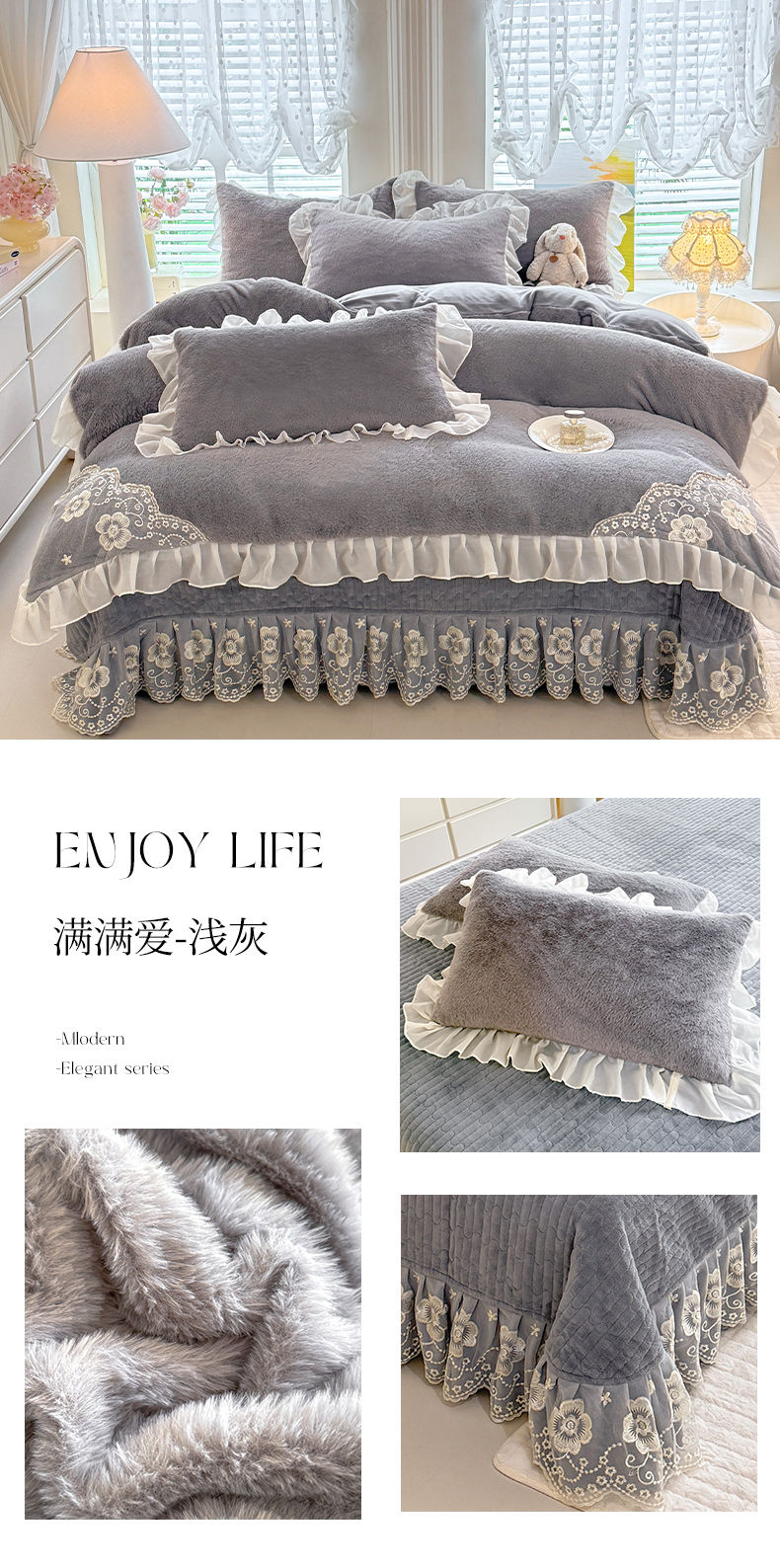 商品名称:唐人居 2025新款高克重兔毛绒花边夹棉床盖四件套-满满爱 满满爱-卡其
