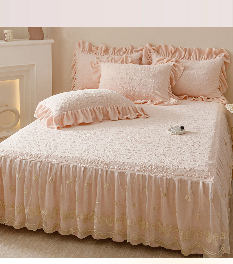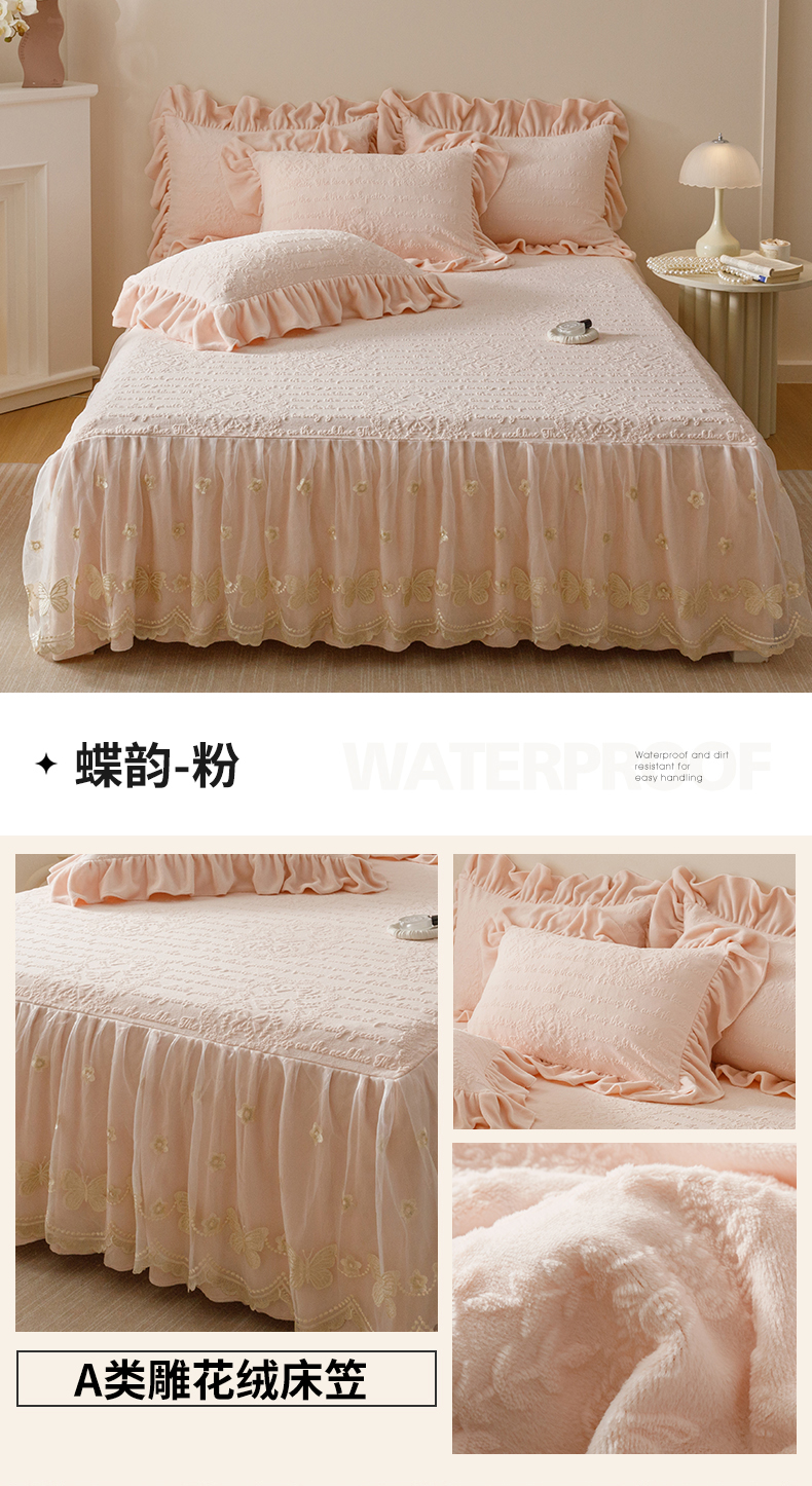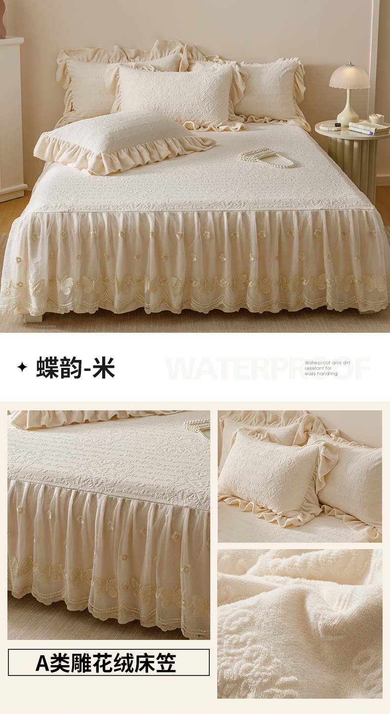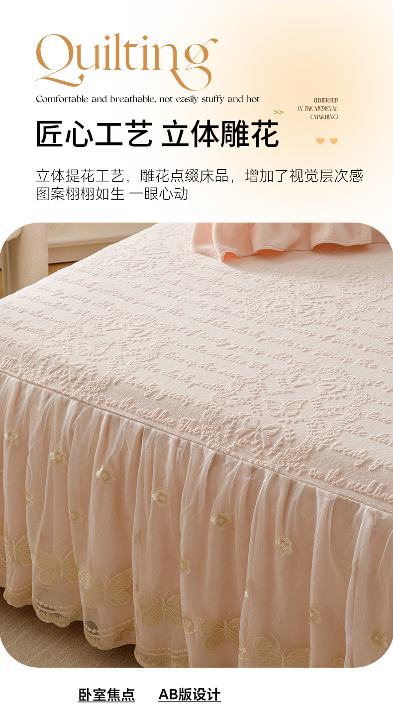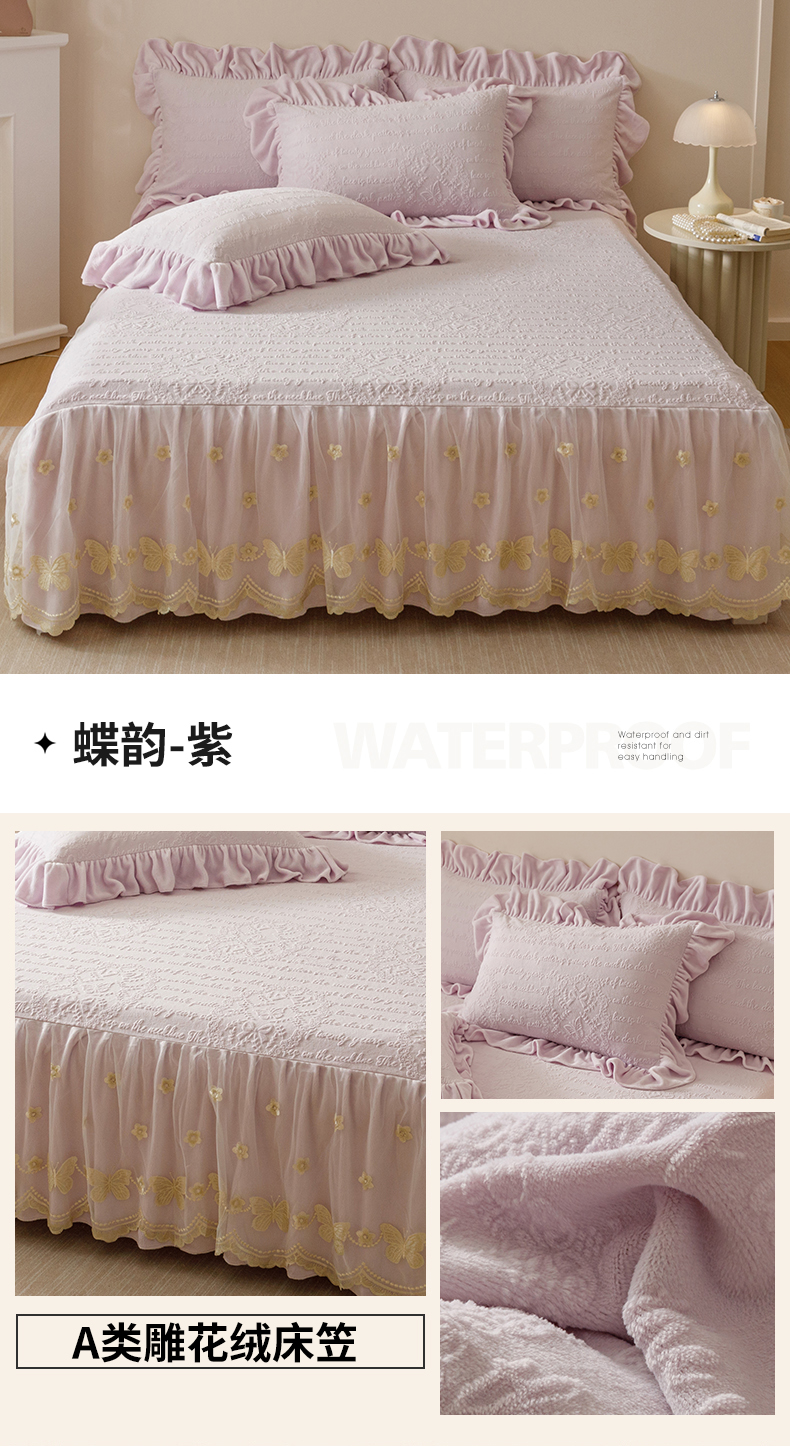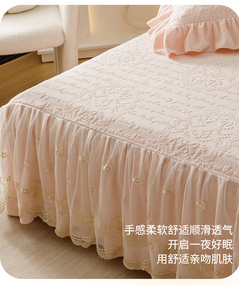 当前位置: 91家纺网 > 商品网购 > 床品套件 > 三件套 > (总)好儿喜家纺 2025新款雕花牛奶绒床裙款三件套-蝶韵