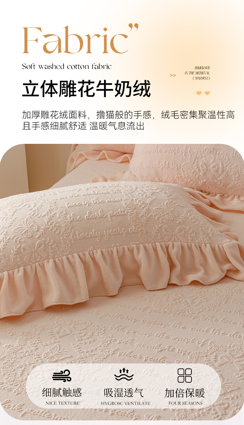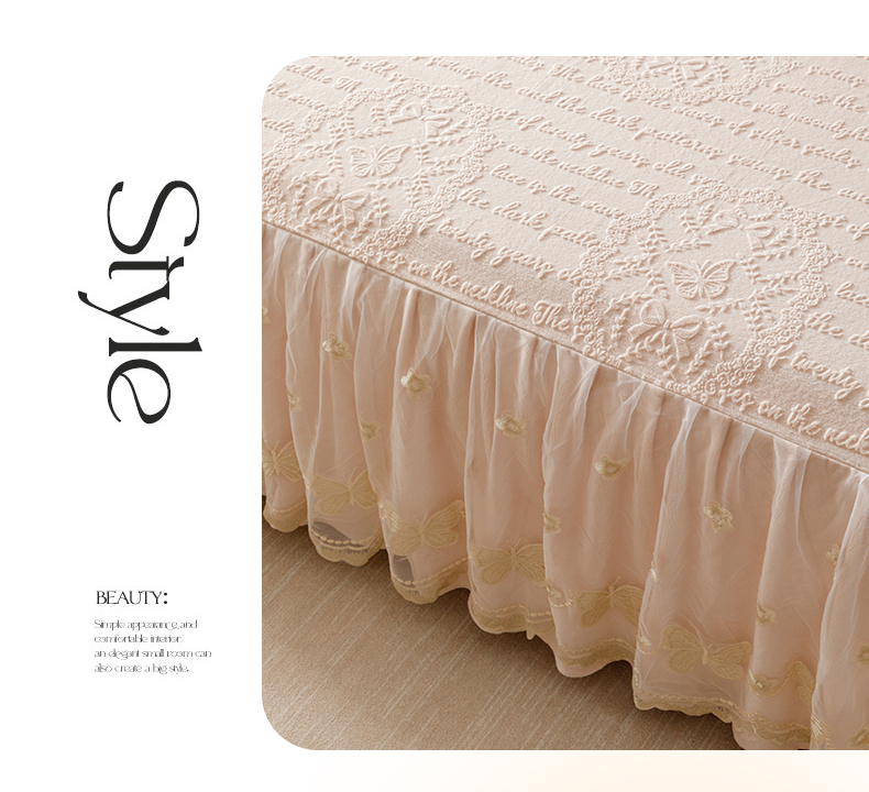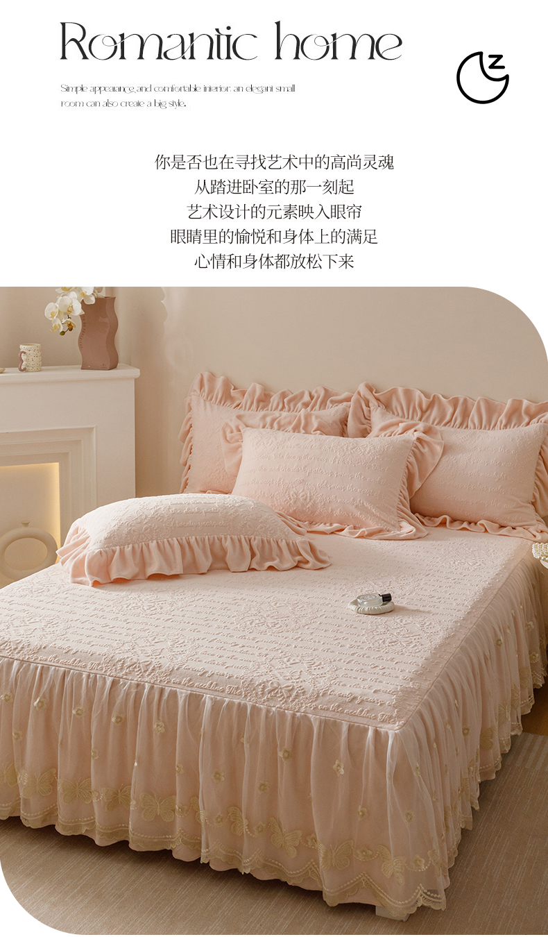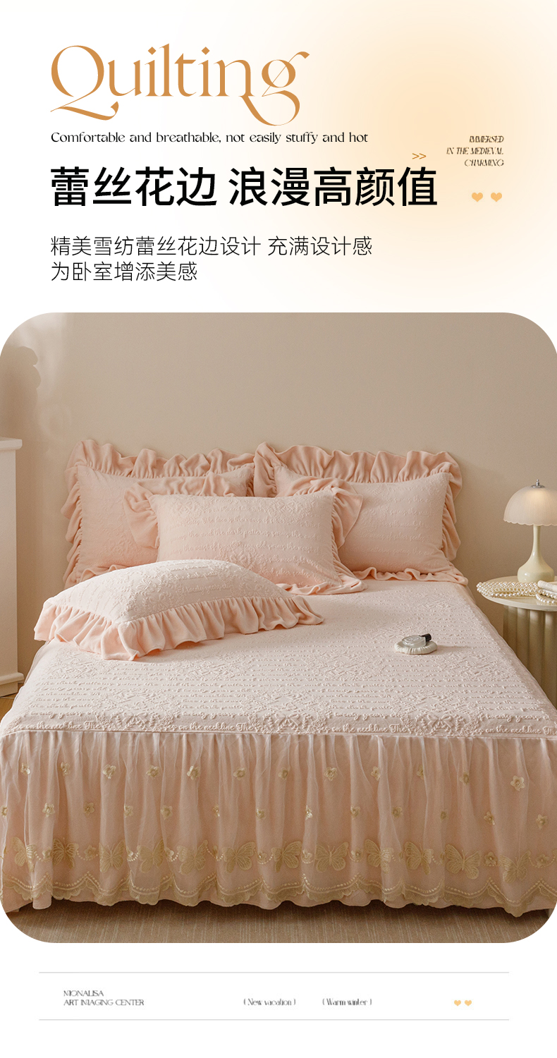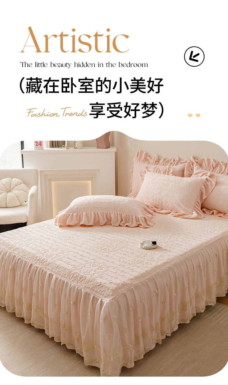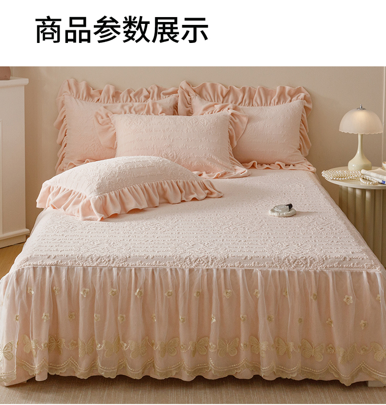 当前位置: 91家纺网 > 商品网购 > 床品套件 > 三件套 > (总)好儿喜家纺 2025新款雕花牛奶绒床裙款三件套-蝶韵