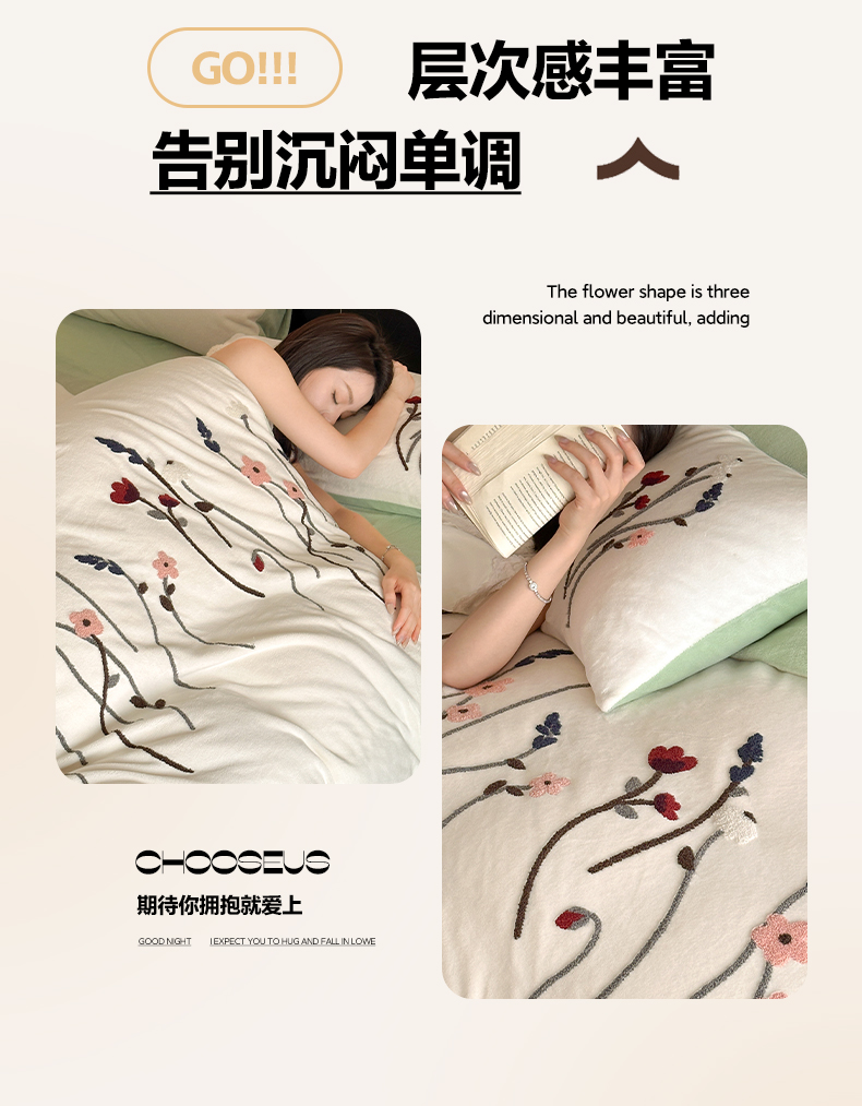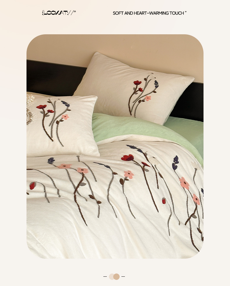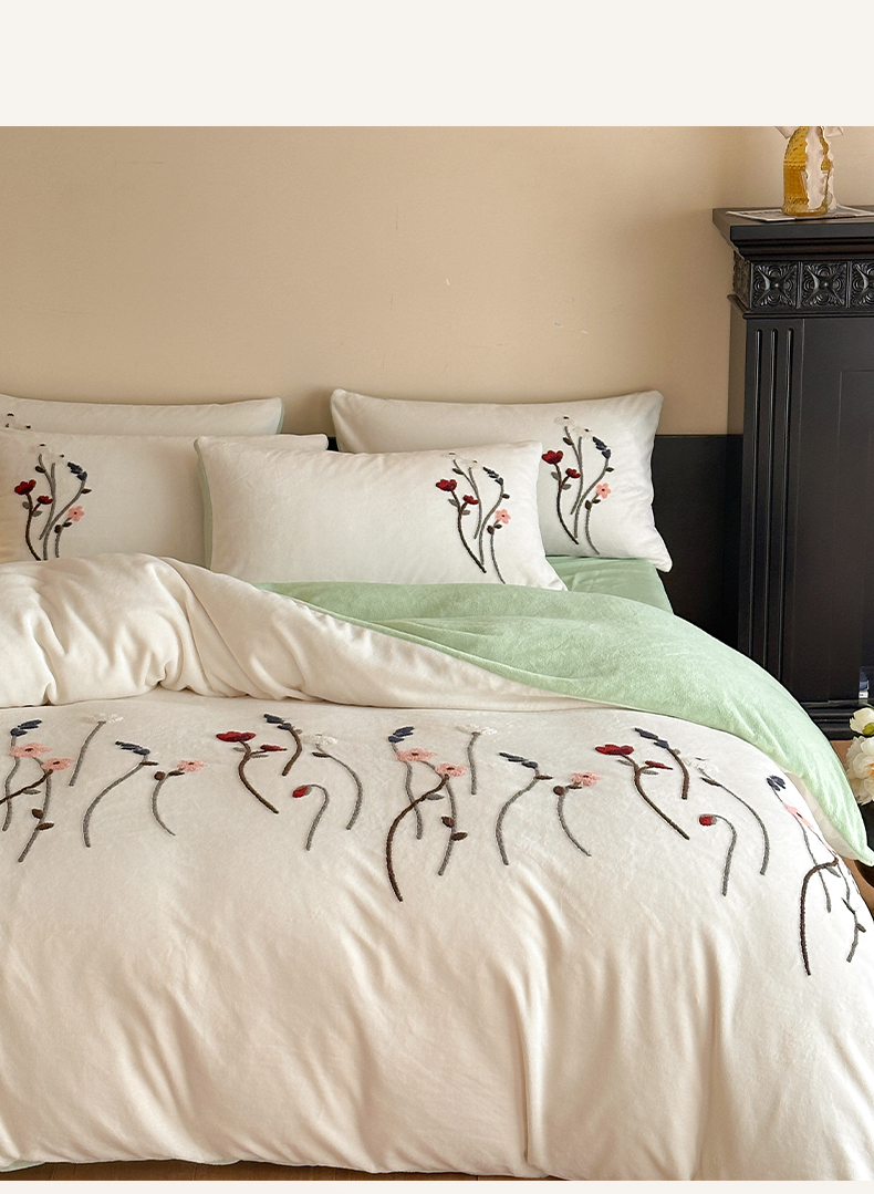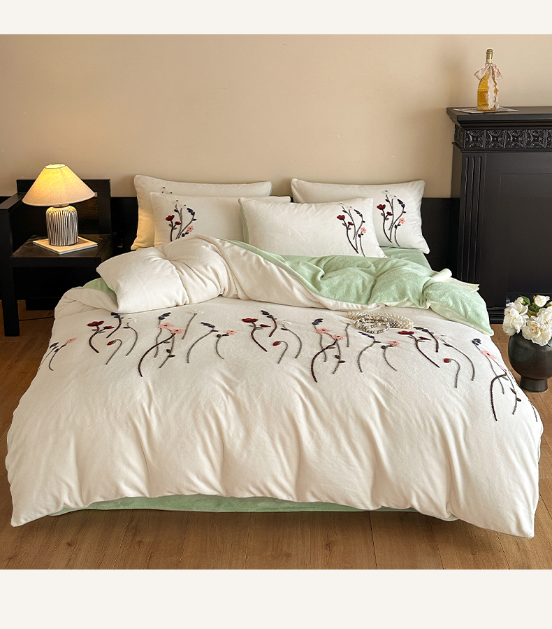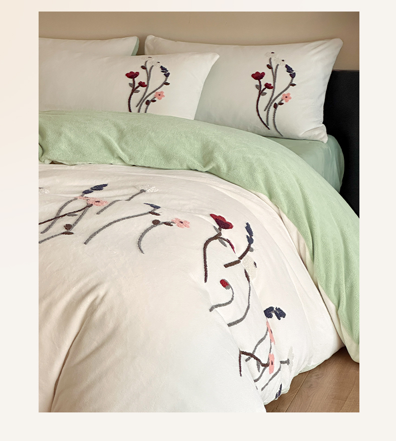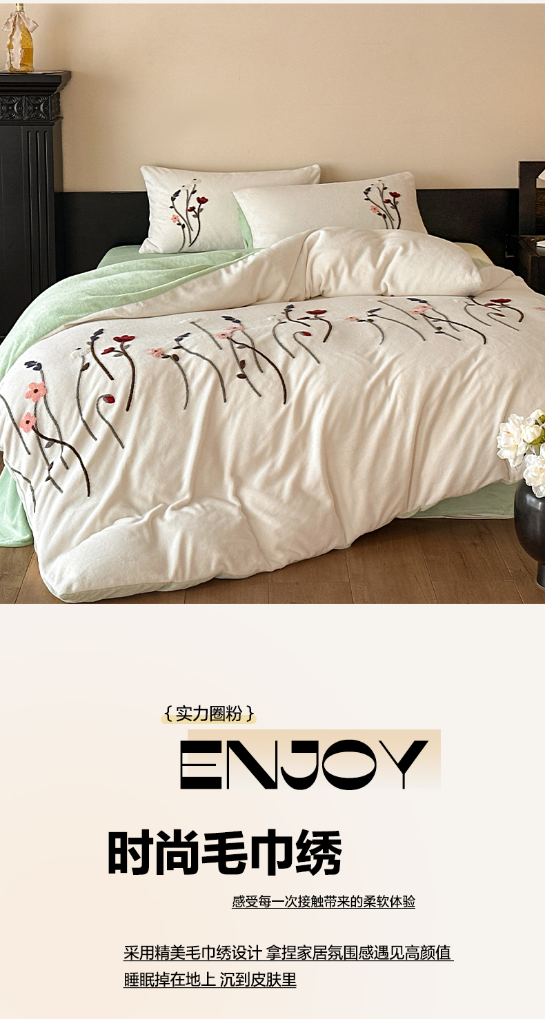 如一 2025新款田园风毛巾绣牛奶绒四件套 幽兰-白绿