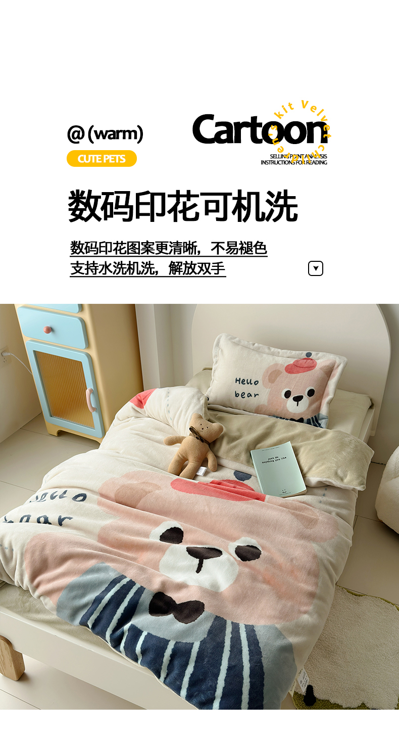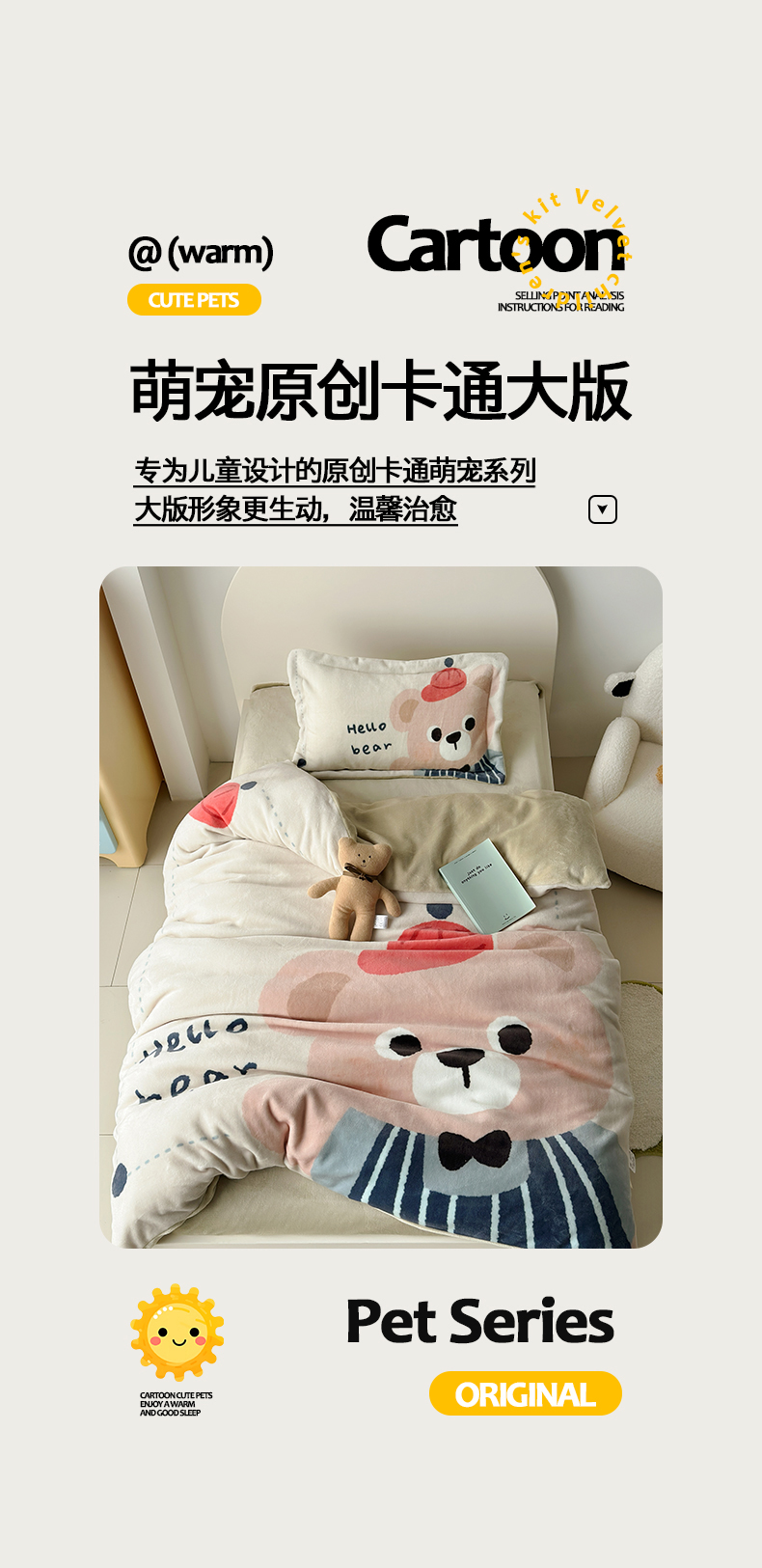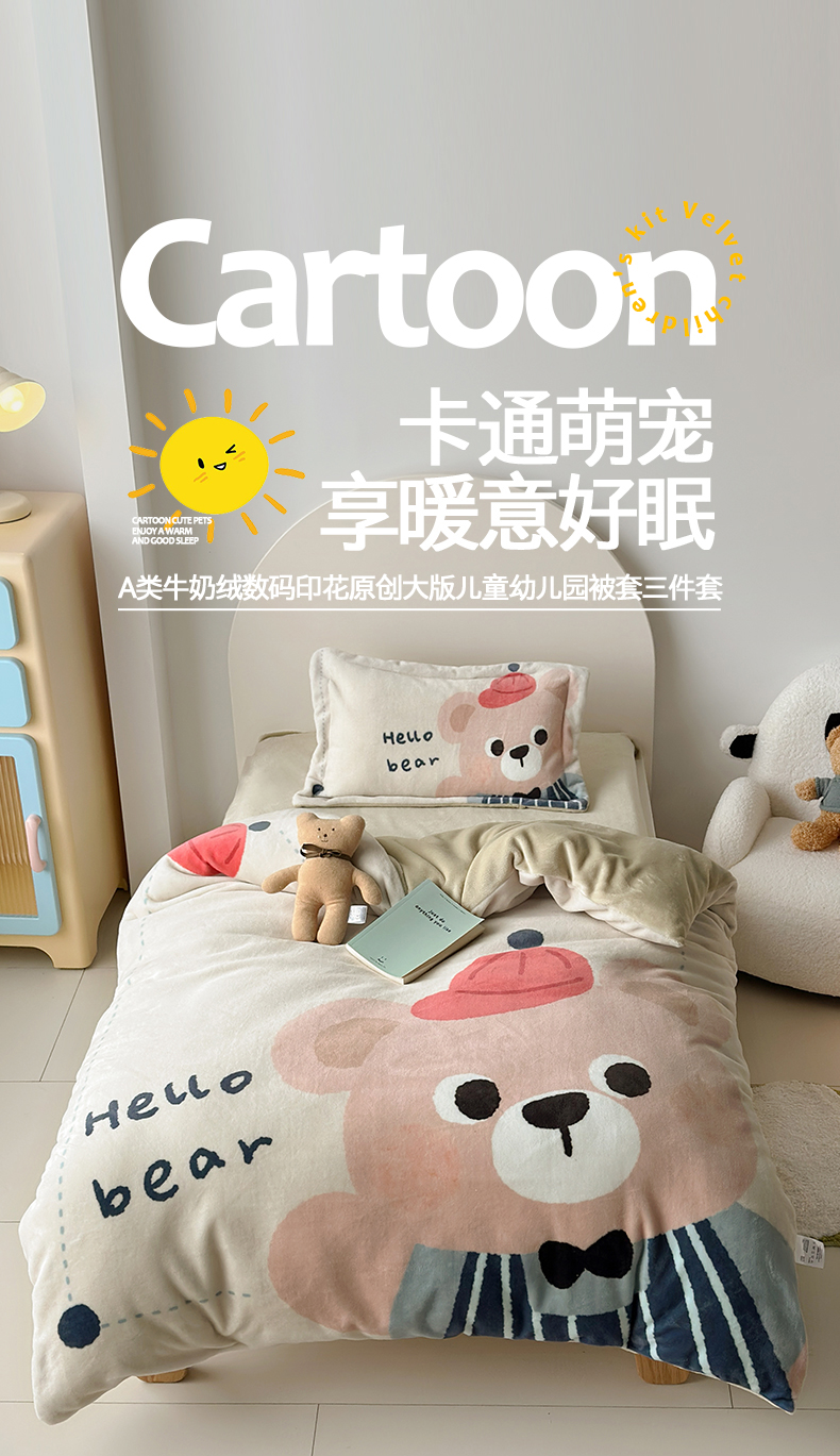 当前位置: 91家纺网 > 商品网购 > 床品套件 > 三件套 > 荷马之梦 2025新款A类牛奶绒数码印花原创卡通大版儿童幼儿园被套三件套-萌宠系列 小熊卢卡