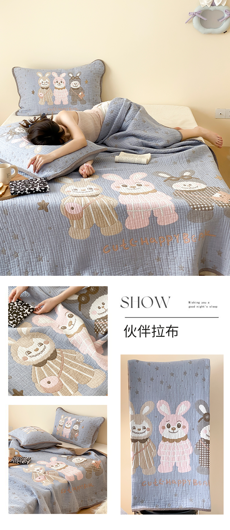 (总)麻依 2025新款安心棉床盖三件全棉四层纱布床单,粉色KT猫,花园小兔,凯蒂的快乐,可爱鸭鸭,可可猫咪-奶茶,可可猫咪-深咖,蓝色熊猫,团团KT,小熊格格,心心领结,欣欣樱桃,雪漫,樱桃兔猫,组合