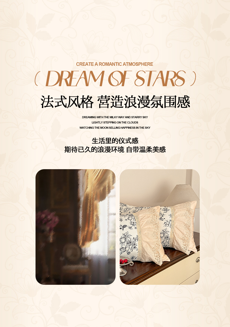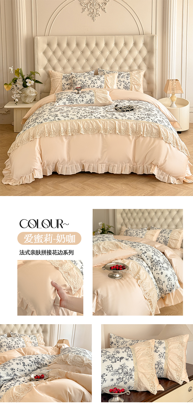 当前位置: 91家纺网 > 商品网购 > 床品套件 > 四件套 > 其它四件套 > 置顶家纺 2025秋冬新品法式亲肤花边拼接四件套 爱蜜莉-奶咖