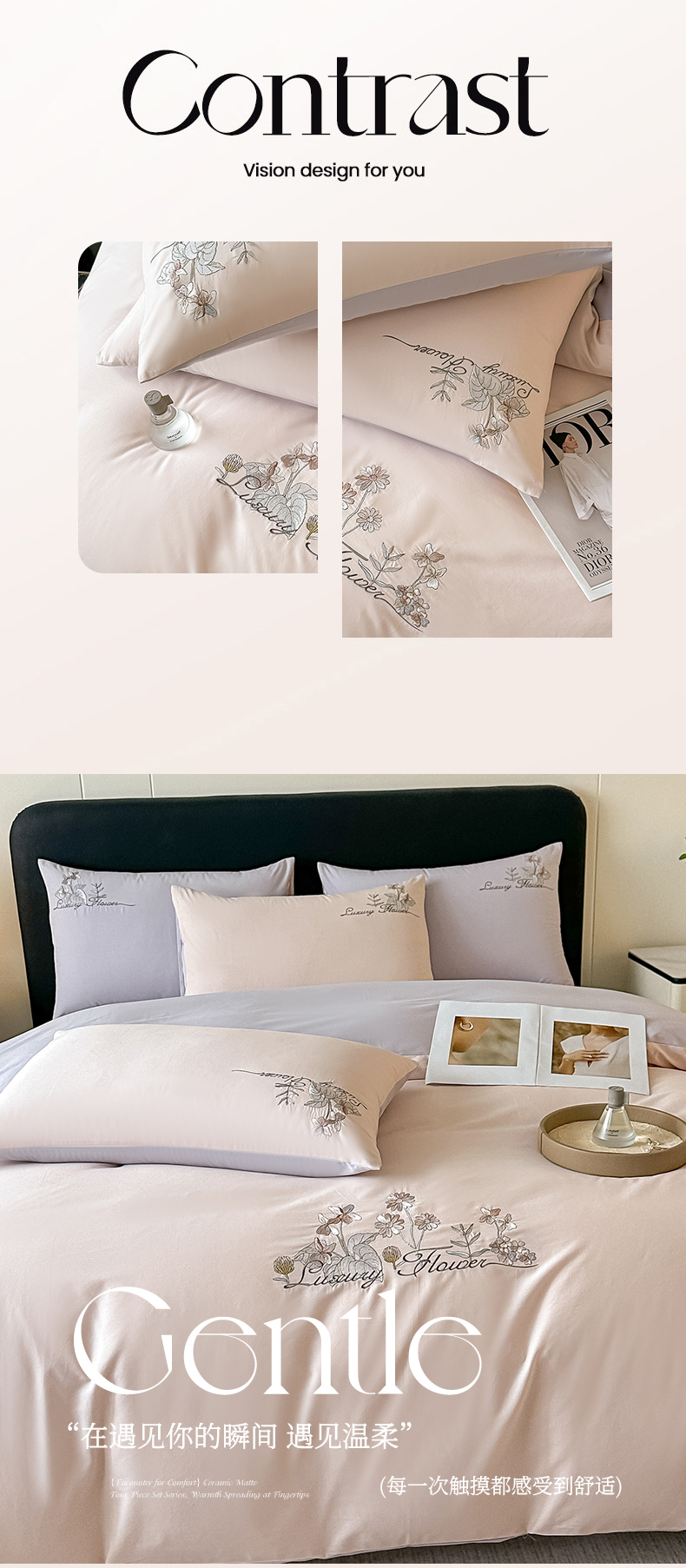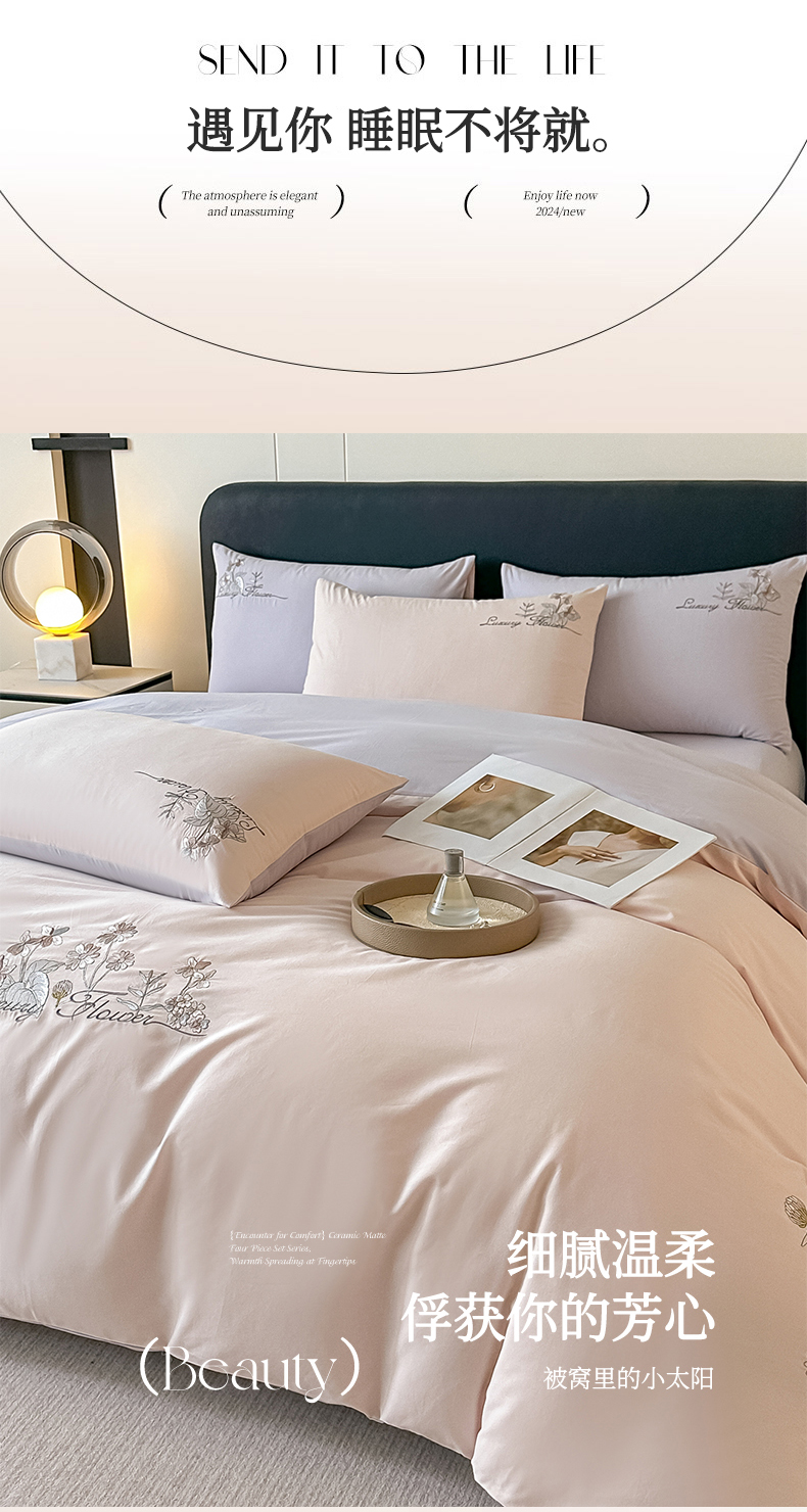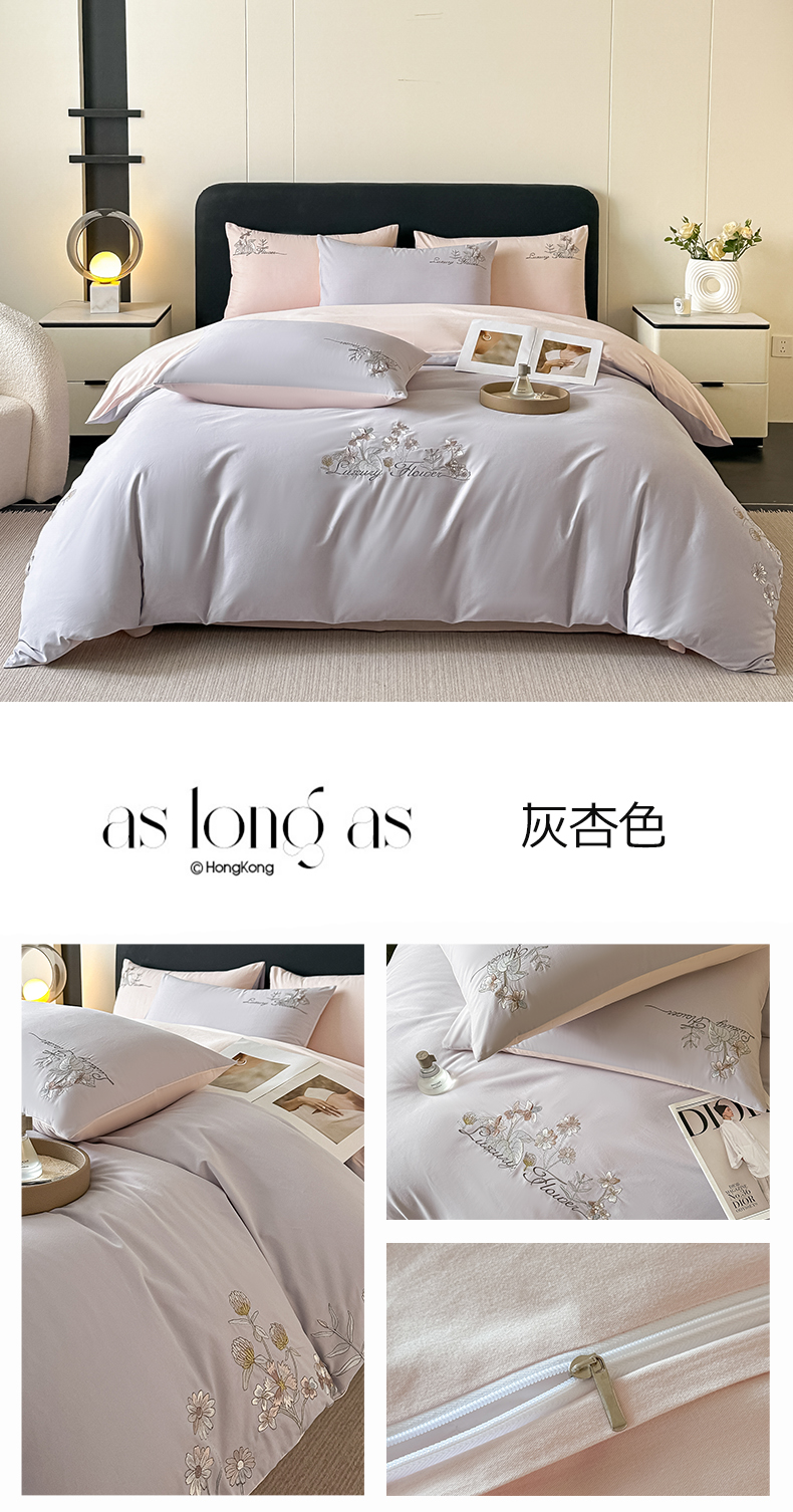 (总)博之洋婚庆 2025新款全棉纯棉长绒棉贡缎磨毛刺绣四件套不掉毛【高端礼盒】邂逅系列,豆沙灰色,灰杏色,杏灰色,紫杏色