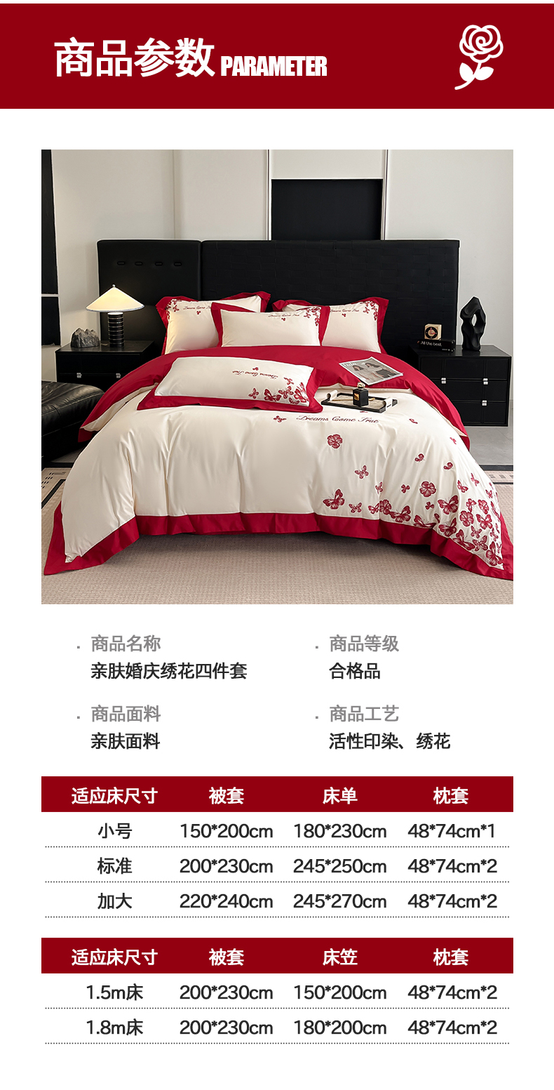 商品名称:置顶家纺 2025新款亲肤婚庆绣花四件套-花不尽 花不尽-奶白+大红