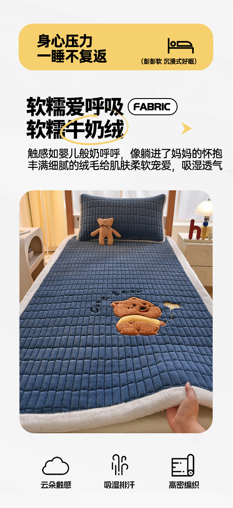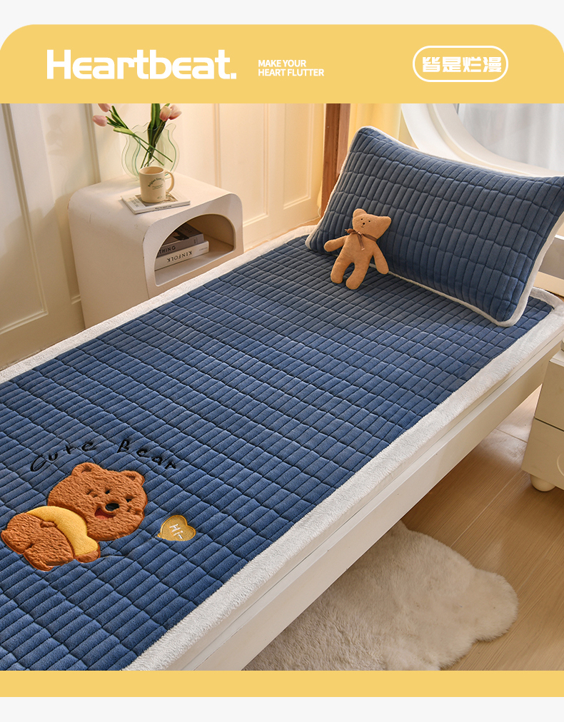 商品名称:悠米悠家 2025新款学生款兔毛绒刺绣夹棉上下铺床褥 小熊-深蓝