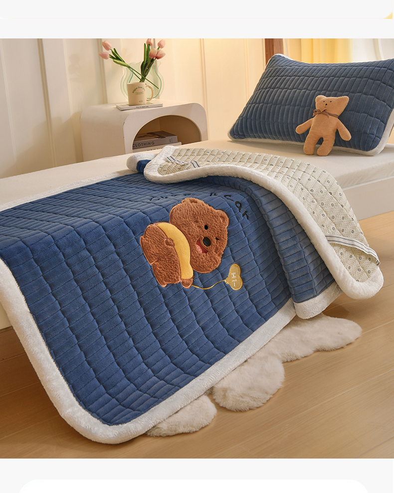 悠米悠家 2025新款学生款兔毛绒刺绣夹棉上下铺床褥 小熊-深蓝
