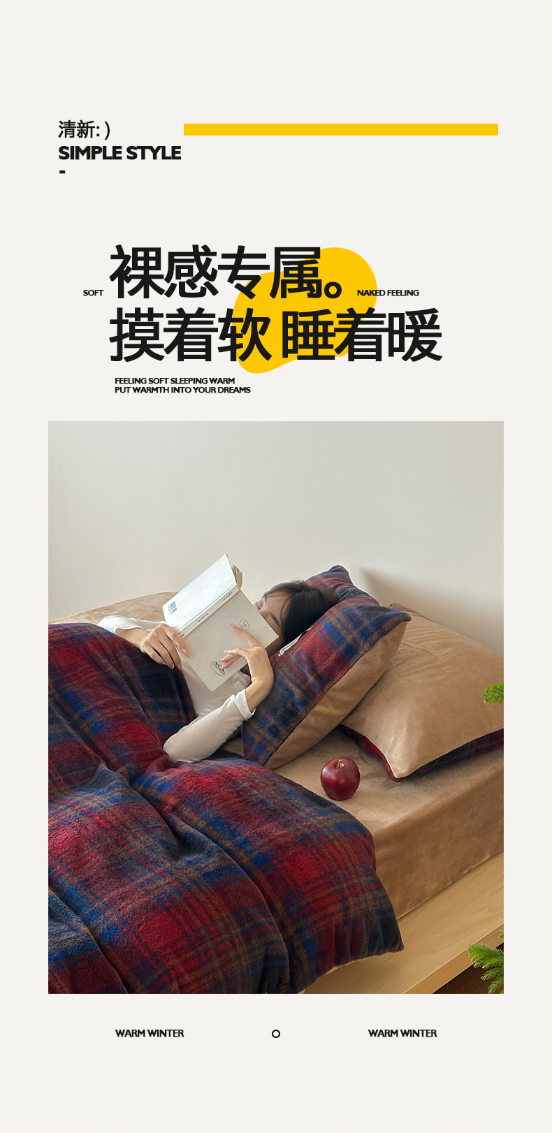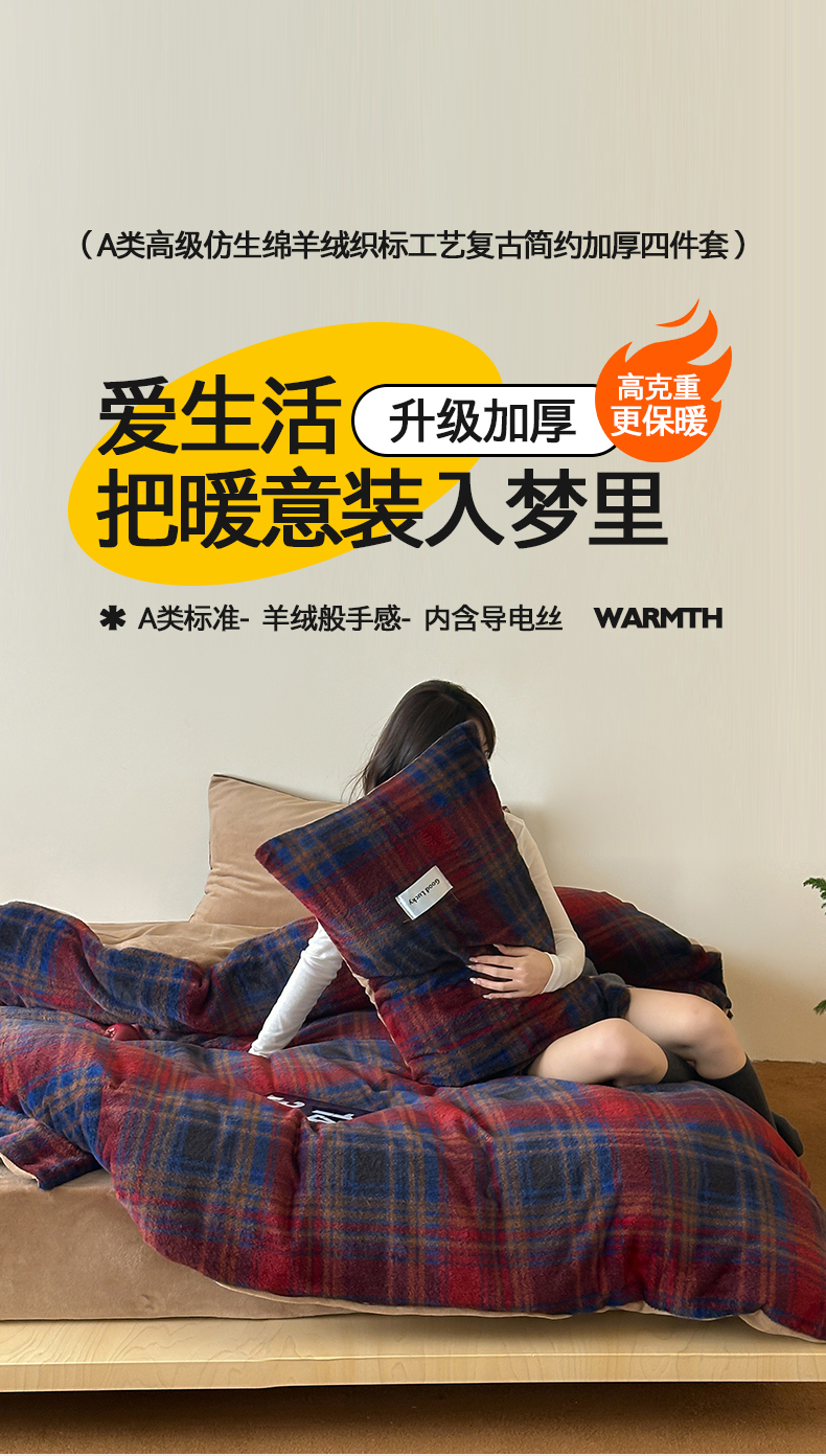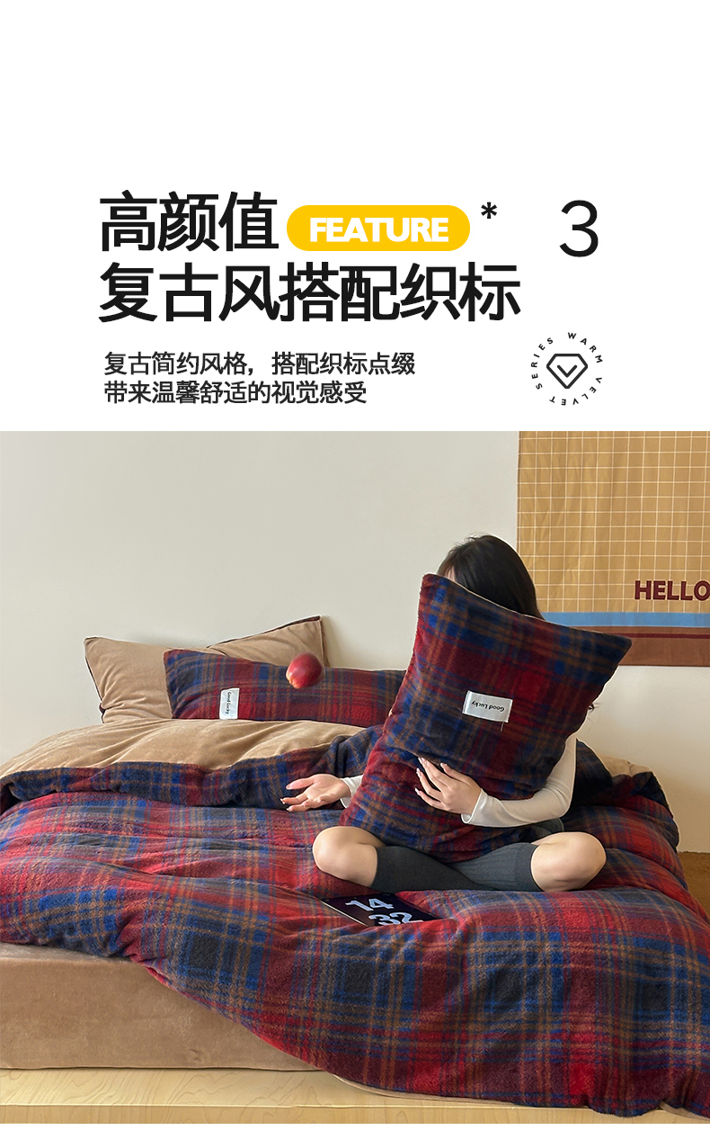 商品名称:桃子家居 2025新款A类高级仿生绵羊绒织标工艺复古简约秋冬限定款加厚牛奶绒系列四件套 绵羊绒-红格糯山
