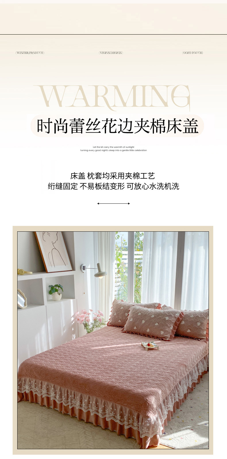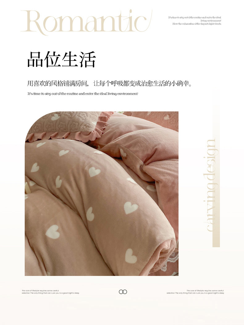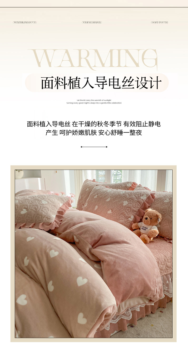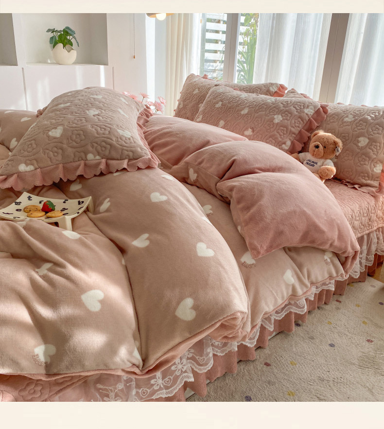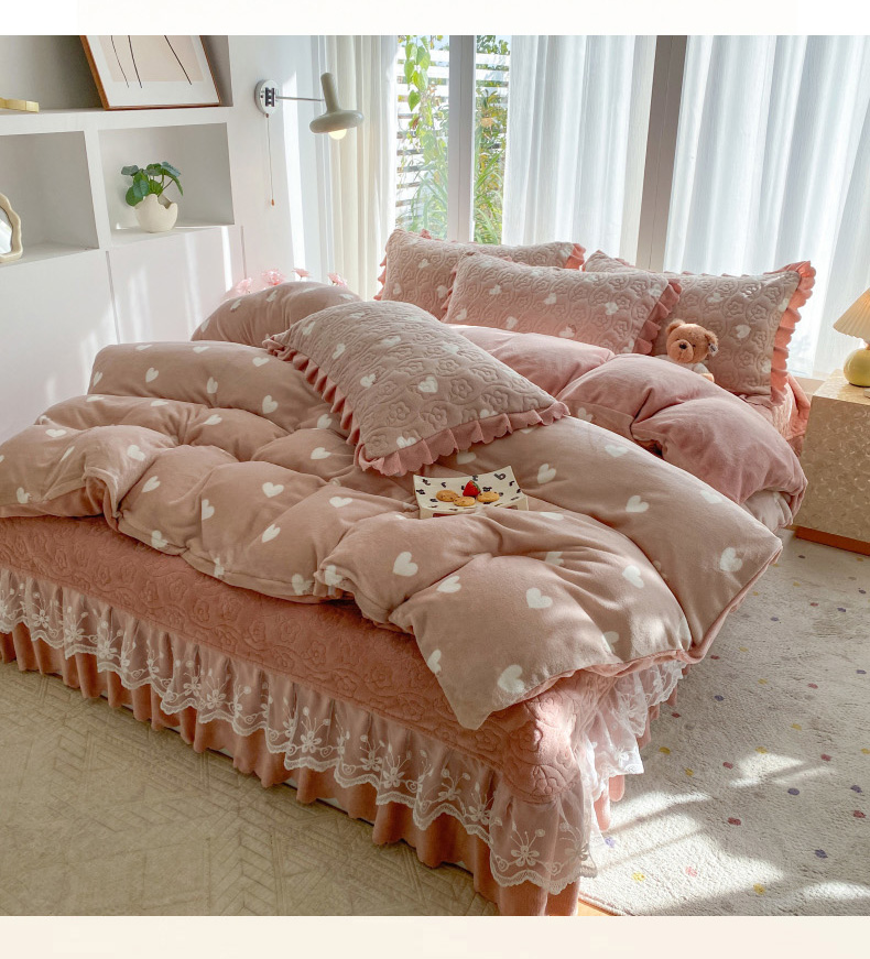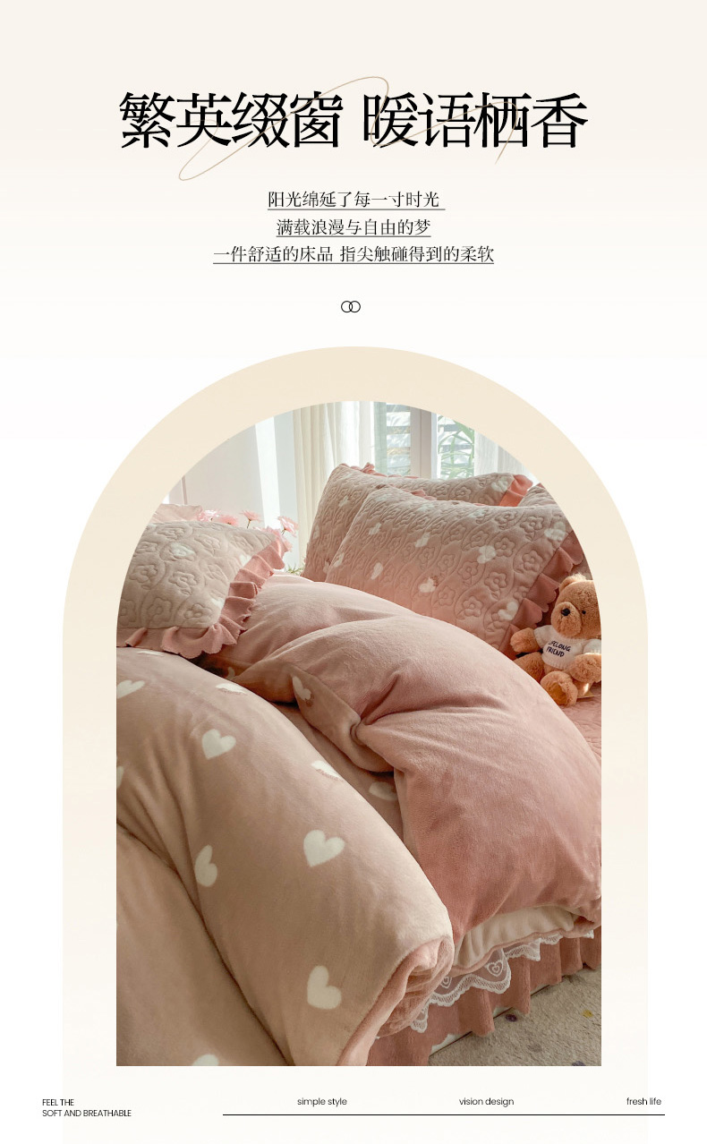 当前位置: 91家纺网 > 商品网购 > 床品套件 > 四件套 > 牛奶绒四件套 > 钰锦珀家纺 2025新款高克重牛奶绒蕾丝双层花边床盖四件套床盖三件套 心心相印