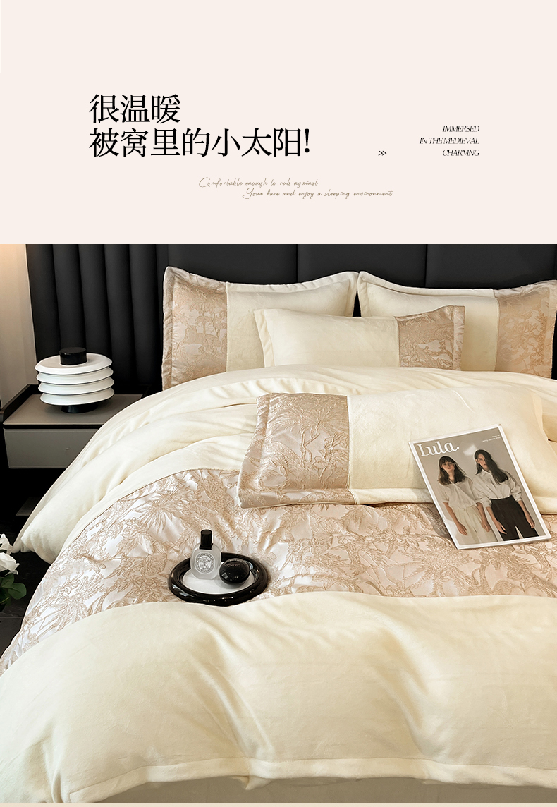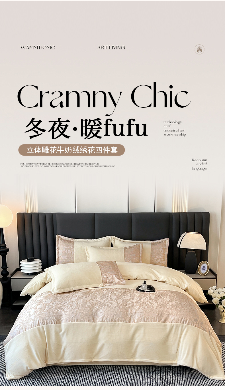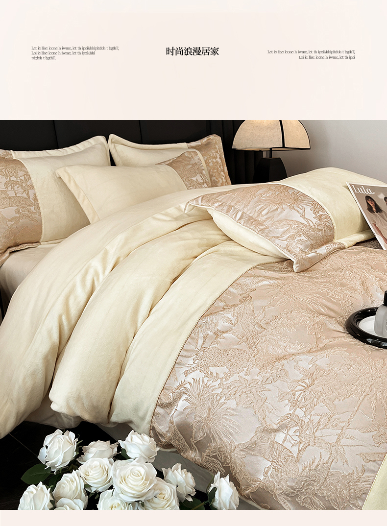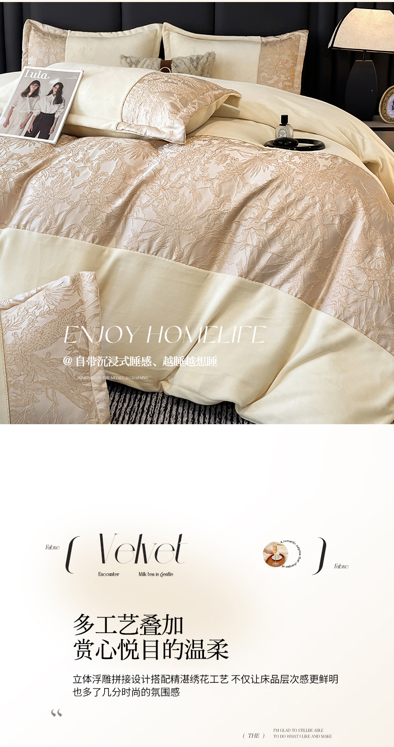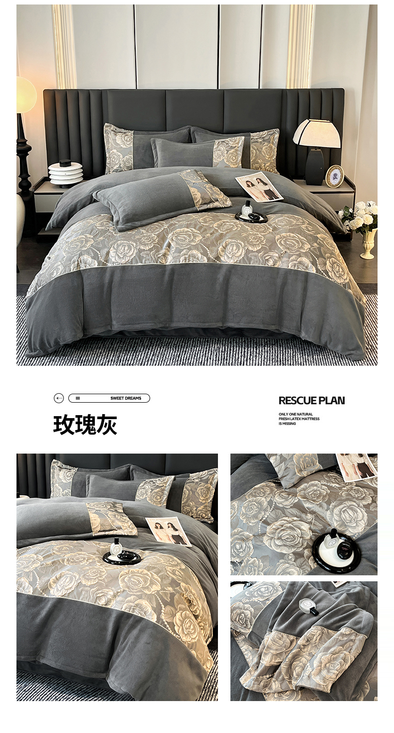 (总)富宁家纺 2025新款立体雕花牛奶绒绣花四件套-洛卡玫瑰系列,洛卡白,玫瑰灰,洛卡咖,玫瑰粉,洛卡蓝